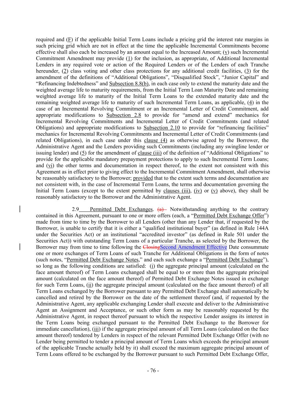 required and (F) if the applicable Initial Term Loans include a pricing grid the interest rate margins in such pricing grid which are not in effect at the time the applicable Incremental Commitments become effective shall also each be increased by an amount equal to the Increased Amount; (v) such Incremental Commitment Amendment may provide (1) for the inclusion, as appropriate, of Additional Incremental Lenders in any required vote or action of the Required Lenders or of the Lenders of each Tranche hereunder, (2) class voting and other class protections for any additional credit facilities, (3) for the amendment of the definitions of “Additional Obligations”, “Disqualified Stock”, “Junior Capital” and “Refinancing Indebtedness” and Subsection 8.8(b), in each case only to extend the maturity date and the weighted average life to maturity requirements, from the Initial Term Loan Maturity Date and remaining weighted average life to maturity of the Initial Term Loans to the extended maturity date and the remaining weighted average life to maturity of such Incremental Term Loans, as applicable, (4) in the case of an Incremental Revolving Commitment or an Incremental Letter of Credit Commitment, add appropriate modifications to Subsection 2.8 to provide for “amend and extend” mechanics for Incremental Revolving Commitments and Incremental Letter of Credit Commitments (and related Obligations) and appropriate modifications to Subsection 2.10 to provide for “refinancing facilities” mechanics for Incremental Revolving Commitments and Incremental Letter of Credit Commitments (and related Obligations), in each case under this clause (4) as otherwise agreed by the Borrower, the Administrative Agent and the Lenders providing such Commitments (including any swingline lender or issuing lender) and (5) for the amendment of clause (iii) of the definition of “Additional Obligations” to provide for the applicable mandatory prepayment protections to apply to such Incremental Term Loans; and (vi) the other terms and documentation in respect thereof, to the extent not consistent with this Agreement as in effect prior to giving effect to the Incremental Commitment Amendment, shall otherwise be reasonably satisfactory to the Borrower; provided that to the extent such terms and documentation are not consistent with, in the case of Incremental Term Loans, the terms and documentation governing the Initial Term Loans (except to the extent permitted by clauses (iii), (iv) or (v) above), they shall be reasonably satisfactory to the Borrower and the Administrative Agent. 2.9 Permitted Debt Exchanges. (a) Notwithstanding anything to the contrary contained in this Agreement, pursuant to one or more offers (each, a “Permitted Debt Exchange Offer”) made from time to time by the Borrower to all Lenders (other than any Lender that, if requested by the Borrower, is unable to certify that it is either a “qualified institutional buyer” (as defined in Rule 144A under the Securities Act) or an institutional “accredited investor” (as defined in Rule 501 under the Securities Act)) with outstanding Term Loans of a particular Tranche, as selected by the Borrower, the Borrower may from time to time following the ClosingSecond Amendment Effective Date consummate one or more exchanges of Term Loans of such Tranche for Additional Obligations in the form of notes (such notes, “Permitted Debt Exchange Notes,” and each such exchange a “Permitted Debt Exchange”), so long as the following conditions are satisfied: (i) the aggregate principal amount (calculated on the face amount thereof) of Term Loans exchanged shall be equal to or more than the aggregate principal amount (calculated on the face amount thereof) of Permitted Debt Exchange Notes issued in exchange for such Term Loans, (ii) the aggregate principal amount (calculated on the face amount thereof) of all Term Loans exchanged by the Borrower pursuant to any Permitted Debt Exchange shall automatically be cancelled and retired by the Borrower on the date of the settlement thereof (and, if requested by the Administrative Agent, any applicable exchanging Lender shall execute and deliver to the Administrative Agent an Assignment and Acceptance, or such other form as may be reasonably requested by the Administrative Agent, in respect thereof pursuant to which the respective Lender assigns its interest in the Term Loans being exchanged pursuant to the Permitted Debt Exchange to the Borrower for immediate cancellation), (iii) if the aggregate principal amount of all Term Loans (calculated on the face amount thereof) tendered by Lenders in respect of the relevant Permitted Debt Exchange Offer (with no Lender being permitted to tender a principal amount of Term Loans which exceeds the principal amount of the applicable Tranche actually held by it) shall exceed the maximum aggregate principal amount of Term Loans offered to be exchanged by the Borrower pursuant to such Permitted Debt Exchange Offer, - 76 -