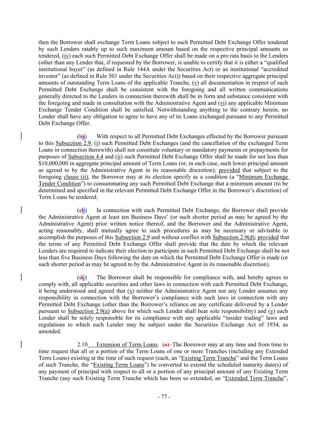 then the Borrower shall exchange Term Loans subject to such Permitted Debt Exchange Offer tendered by such Lenders ratably up to such maximum amount based on the respective principal amounts so tendered, (iv) each such Permitted Debt Exchange Offer shall be made on a pro rata basis to the Lenders (other than any Lender that, if requested by the Borrower, is unable to certify that it is either a “qualified institutional buyer” (as defined in Rule 144A under the Securities Act) or an institutional “accredited investor” (as defined in Rule 501 under the Securities Act)) based on their respective aggregate principal amounts of outstanding Term Loans of the applicable Tranche, (v) all documentation in respect of such Permitted Debt Exchange shall be consistent with the foregoing and all written communications generally directed to the Lenders in connection therewith shall be in form and substance consistent with the foregoing and made in consultation with the Administrative Agent and (vi) any applicable Minimum Exchange Tender Condition shall be satisfied. Notwithstanding anything to the contrary herein, no Lender shall have any obligation to agree to have any of its Loans exchanged pursuant to any Permitted Debt Exchange Offer. (ba) With respect to all Permitted Debt Exchanges effected by the Borrower pursuant to this Subsection 2.9, (i) such Permitted Debt Exchanges (and the cancellation of the exchanged Term Loans in connection therewith) shall not constitute voluntary or mandatory payments or prepayments for purposes of Subsection 4.4 and (ii) such Permitted Debt Exchange Offer shall be made for not less than $10,000,000 in aggregate principal amount of Term Loans (or, in each case, such lower principal amount as agreed to by the Administrative Agent in its reasonable discretion); provided that subject to the foregoing clause (ii), the Borrower may at its election specify as a condition (a “Minimum Exchange Tender Condition”) to consummating any such Permitted Debt Exchange that a minimum amount (to be determined and specified in the relevant Permitted Debt Exchange Offer in the Borrower’s discretion) of Term Loans be tendered. (cb) In connection with each Permitted Debt Exchange, the Borrower shall provide the Administrative Agent at least ten Business Days’ (or such shorter period as may be agreed by the Administrative Agent) prior written notice thereof, and the Borrower and the Administrative Agent, acting reasonably, shall mutually agree to such procedures as may be necessary or advisable to accomplish the purposes of this Subsection 2.9 and without conflict with Subsection 2.9(d); provided that the terms of any Permitted Debt Exchange Offer shall provide that the date by which the relevant Lenders are required to indicate their election to participate in such Permitted Debt Exchange shall be not less than five Business Days following the date on which the Permitted Debt Exchange Offer is made (or such shorter period as may be agreed to by the Administrative Agent in its reasonable discretion). (dc) The Borrower shall be responsible for compliance with, and hereby agrees to comply with, all applicable securities and other laws in connection with each Permitted Debt Exchange, it being understood and agreed that (x) neither the Administrative Agent nor any Lender assumes any responsibility in connection with the Borrower’s compliance with such laws in connection with any Permitted Debt Exchange (other than the Borrower’s reliance on any certificate delivered by a Lender pursuant to Subsection 2.9(a) above for which such Lender shall bear sole responsibility) and (y) each Lender shall be solely responsible for its compliance with any applicable “insider trading” laws and regulations to which such Lender may be subject under the Securities Exchange Act of 1934, as amended. 2.10 Extension of Term Loans. (a) The Borrower may at any time and from time to time request that all or a portion of the Term Loans of one or more Tranches (including any Extended Term Loans) existing at the time of such request (each, an “Existing Term Tranche” and the Term Loans of such Tranche, the “Existing Term Loans”) be converted to extend the scheduled maturity date(s) of any payment of principal with respect to all or a portion of any principal amount of any Existing Term Tranche (any such Existing Term Tranche which has been so extended, an “Extended Term Tranche”, - 77 -
