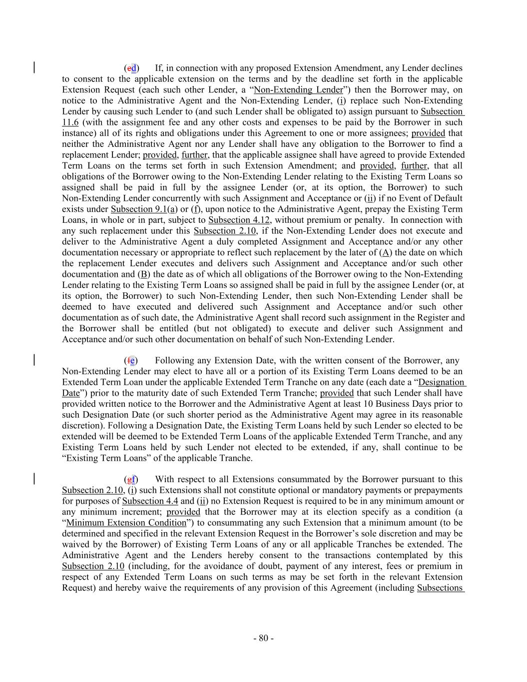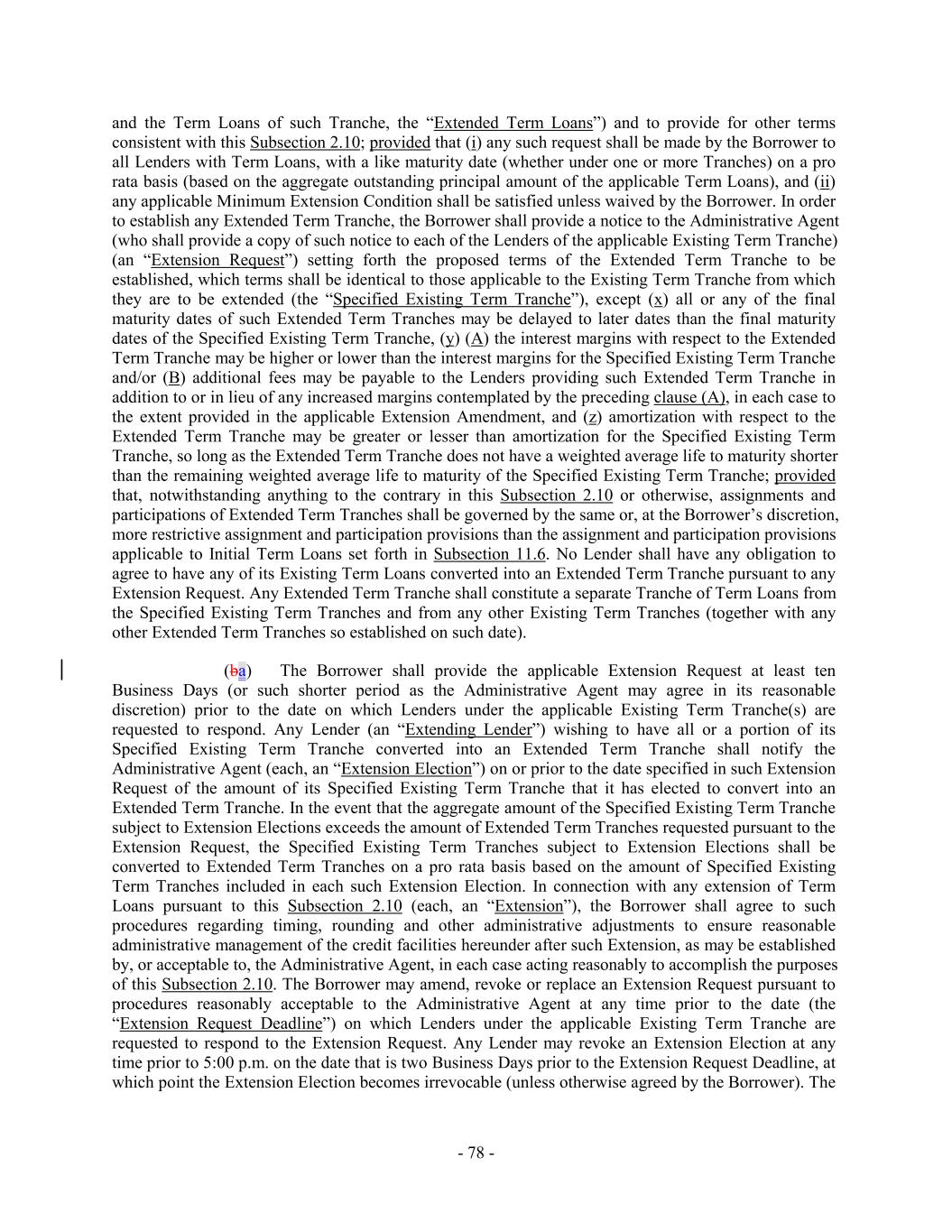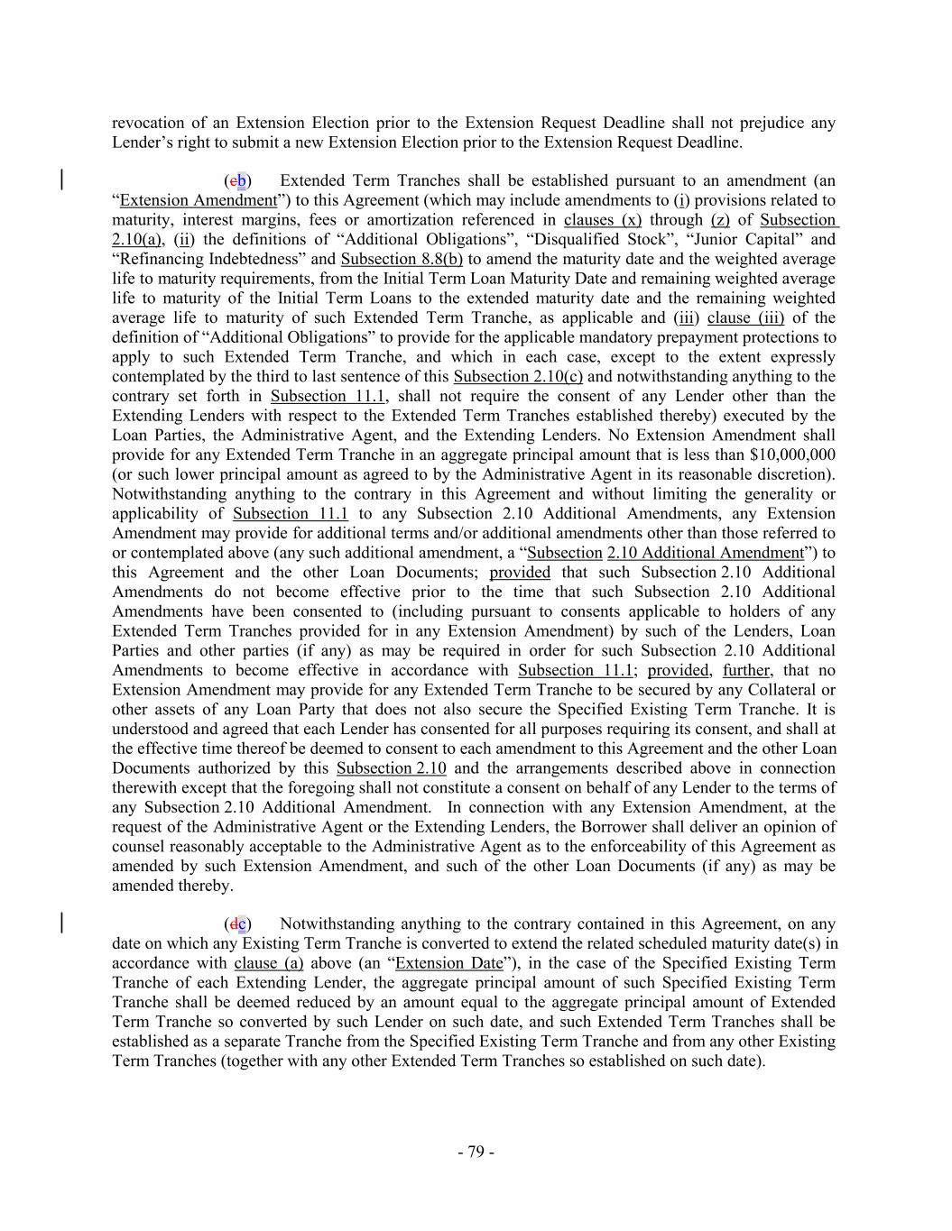 revocation of an Extension Election prior to the Extension Request Deadline shall not prejudice any Lender’s right to submit a new Extension Election prior to the Extension Request Deadline. (cb) Extended Term Tranches shall be established pursuant to an amendment (an “Extension Amendment”) to this Agreement (which may include amendments to (i) provisions related to maturity, interest margins, fees or amortization referenced in clauses (x) through (z) of Subsection 2.10(a), (ii) the definitions of “Additional Obligations”, “Disqualified Stock”, “Junior Capital” and “Refinancing Indebtedness” and Subsection 8.8(b) to amend the maturity date and the weighted average life to maturity requirements, from the Initial Term Loan Maturity Date and remaining weighted average life to maturity of the Initial Term Loans to the extended maturity date and the remaining weighted average life to maturity of such Extended Term Tranche, as applicable and (iii) clause (iii) of the definition of “Additional Obligations” to provide for the applicable mandatory prepayment protections to apply to such Extended Term Tranche, and which in each case, except to the extent expressly contemplated by the third to last sentence of this Subsection 2.10(c) and notwithstanding anything to the contrary set forth in Subsection 11.1, shall not require the consent of any Lender other than the Extending Lenders with respect to the Extended Term Tranches established thereby) executed by the Loan Parties, the Administrative Agent, and the Extending Lenders. No Extension Amendment shall provide for any Extended Term Tranche in an aggregate principal amount that is less than $10,000,000 (or such lower principal amount as agreed to by the Administrative Agent in its reasonable discretion). Notwithstanding anything to the contrary in this Agreement and without limiting the generality or applicability of Subsection 11.1 to any Subsection 2.10 Additional Amendments, any Extension Amendment may provide for additional terms and/or additional amendments other than those referred to or contemplated above (any such additional amendment, a “Subsection 2.10 Additional Amendment”) to this Agreement and the other Loan Documents; provided that such Subsection 2.10 Additional Amendments do not become effective prior to the time that such Subsection 2.10 Additional Amendments have been consented to (including pursuant to consents applicable to holders of any Extended Term Tranches provided for in any Extension Amendment) by such of the Lenders, Loan Parties and other parties (if any) as may be required in order for such Subsection 2.10 Additional Amendments to become effective in accordance with Subsection 11.1; provided, further, that no Extension Amendment may provide for any Extended Term Tranche to be secured by any Collateral or other assets of any Loan Party that does not also secure the Specified Existing Term Tranche. It is understood and agreed that each Lender has consented for all purposes requiring its consent, and shall at the effective time thereof be deemed to consent to each amendment to this Agreement and the other Loan Documents authorized by this Subsection 2.10 and the arrangements described above in connection therewith except that the foregoing shall not constitute a consent on behalf of any Lender to the terms of any Subsection 2.10 Additional Amendment. In connection with any Extension Amendment, at the request of the Administrative Agent or the Extending Lenders, the Borrower shall deliver an opinion of counsel reasonably acceptable to the Administrative Agent as to the enforceability of this Agreement as amended by such Extension Amendment, and such of the other Loan Documents (if any) as may be amended thereby. (dc) Notwithstanding anything to the contrary contained in this Agreement, on any date on which any Existing Term Tranche is converted to extend the related scheduled maturity date(s) in accordance with clause (a) above (an “Extension Date”), in the case of the Specified Existing Term Tranche of each Extending Lender, the aggregate principal amount of such Specified Existing Term Tranche shall be deemed reduced by an amount equal to the aggregate principal amount of Extended Term Tranche so converted by such Lender on such date, and such Extended Term Tranches shall be established as a separate Tranche from the Specified Existing Term Tranche and from any other Existing Term Tranches (together with any other Extended Term Tranches so established on such date). - 79 -
