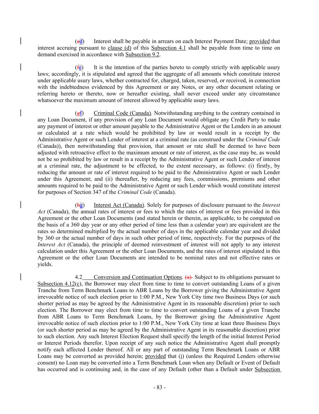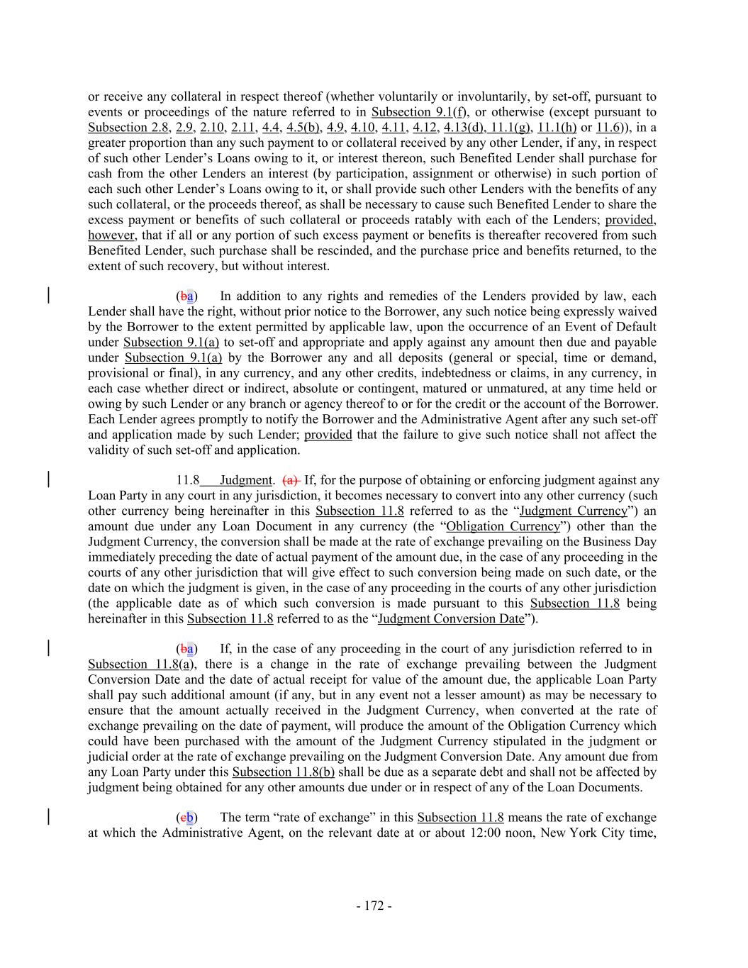 or receive any collateral in respect thereof (whether voluntarily or involuntarily, by set-off, pursuant to events or proceedings of the nature referred to in Subsection 9.1(f), or otherwise (except pursuant to Subsection 2.8, 2.9, 2.10, 2.11, 4.4, 4.5(b), 4.9, 4.10, 4.11, 4.12, 4.13(d), 11.1(g), 11.1(h) or 11.6)), in a greater proportion than any such payment to or collateral received by any other Lender, if any, in respect of such other Lender’s Loans owing to it, or interest thereon, such Benefited Lender shall purchase for cash from the other Lenders an interest (by participation, assignment or otherwise) in such portion of each such other Lender’s Loans owing to it, or shall provide such other Lenders with the benefits of any such collateral, or the proceeds thereof, as shall be necessary to cause such Benefited Lender to share the excess payment or benefits of such collateral or proceeds ratably with each of the Lenders; provided, however, that if all or any portion of such excess payment or benefits is thereafter recovered from such Benefited Lender, such purchase shall be rescinded, and the purchase price and benefits returned, to the extent of such recovery, but without interest. (ba) In addition to any rights and remedies of the Lenders provided by law, each Lender shall have the right, without prior notice to the Borrower, any such notice being expressly waived by the Borrower to the extent permitted by applicable law, upon the occurrence of an Event of Default under Subsection 9.1(a) to set-off and appropriate and apply against any amount then due and payable under Subsection 9.1(a) by the Borrower any and all deposits (general or special, time or demand, provisional or final), in any currency, and any other credits, indebtedness or claims, in any currency, in each case whether direct or indirect, absolute or contingent, matured or unmatured, at any time held or owing by such Lender or any branch or agency thereof to or for the credit or the account of the Borrower. Each Lender agrees promptly to notify the Borrower and the Administrative Agent after any such set-off and application made by such Lender; provided that the failure to give such notice shall not affect the validity of such set-off and application. 11.8 Judgment. (a) If, for the purpose of obtaining or enforcing judgment against any Loan Party in any court in any jurisdiction, it becomes necessary to convert into any other currency (such other currency being hereinafter in this Subsection 11.8 referred to as the “Judgment Currency”) an amount due under any Loan Document in any currency (the “Obligation Currency”) other than the Judgment Currency, the conversion shall be made at the rate of exchange prevailing on the Business Day immediately preceding the date of actual payment of the amount due, in the case of any proceeding in the courts of any other jurisdiction that will give effect to such conversion being made on such date, or the date on which the judgment is given, in the case of any proceeding in the courts of any other jurisdiction (the applicable date as of which such conversion is made pursuant to this Subsection 11.8 being hereinafter in this Subsection 11.8 referred to as the “Judgment Conversion Date”). (ba) If, in the case of any proceeding in the court of any jurisdiction referred to in Subsection 11.8(a), there is a change in the rate of exchange prevailing between the Judgment Conversion Date and the date of actual receipt for value of the amount due, the applicable Loan Party shall pay such additional amount (if any, but in any event not a lesser amount) as may be necessary to ensure that the amount actually received in the Judgment Currency, when converted at the rate of exchange prevailing on the date of payment, will produce the amount of the Obligation Currency which could have been purchased with the amount of the Judgment Currency stipulated in the judgment or judicial order at the rate of exchange prevailing on the Judgment Conversion Date. Any amount due from any Loan Party under this Subsection 11.8(b) shall be due as a separate debt and shall not be affected by judgment being obtained for any other amounts due under or in respect of any of the Loan Documents. (cb) The term “rate of exchange” in this Subsection 11.8 means the rate of exchange at which the Administrative Agent, on the relevant date at or about 12:00 noon, New York City time, - 172 -