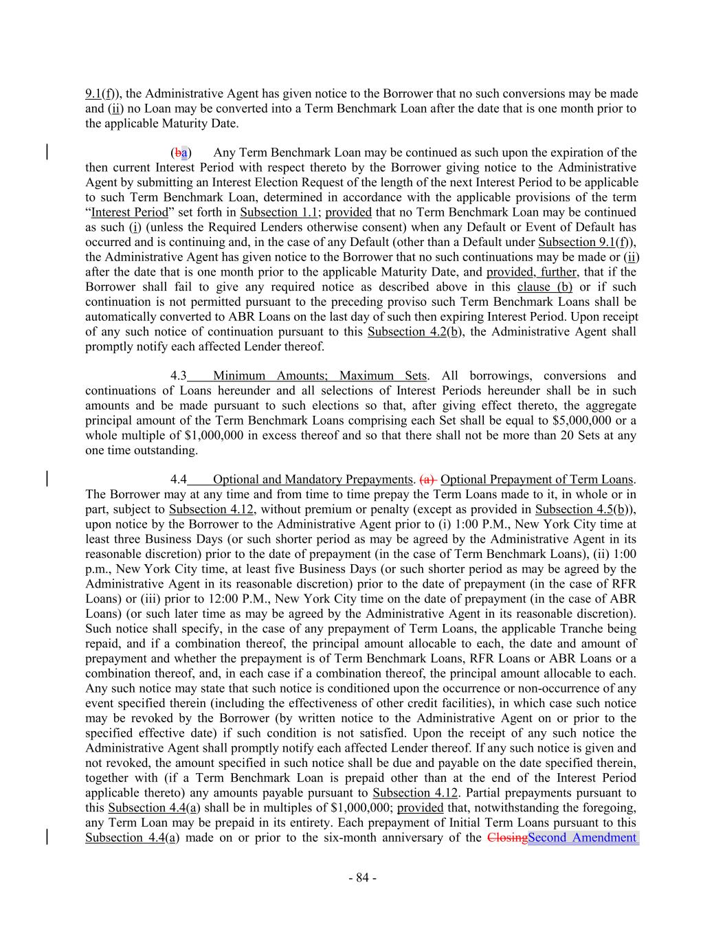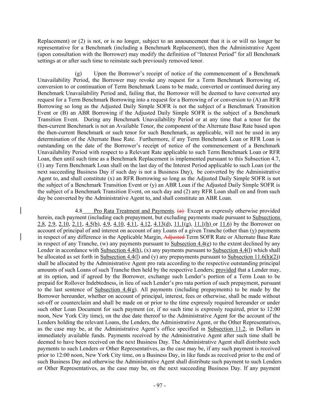 Replacement) or (2) is not, or is no longer, subject to an announcement that it is or will no longer be representative for a Benchmark (including a Benchmark Replacement), then the Administrative Agent (upon consultation with the Borrower) may modify the definition of “Interest Period” for all Benchmark settings at or after such time to reinstate such previously removed tenor. (g) Upon the Borrower’s receipt of notice of the commencement of a Benchmark Unavailability Period, the Borrower may revoke any request for a Term Benchmark Borrowing of, conversion to or continuation of Term Benchmark Loans to be made, converted or continued during any Benchmark Unavailability Period and, failing that, the Borrower will be deemed to have converted any request for a Term Benchmark Borrowing into a request for a Borrowing of or conversion to (A) an RFR Borrowing so long as the Adjusted Daily Simple SOFR is not the subject of a Benchmark Transition Event or (B) an ABR Borrowing if the Adjusted Daily Simple SOFR is the subject of a Benchmark Transition Event. During any Benchmark Unavailability Period or at any time that a tenor for the then-current Benchmark is not an Available Tenor, the component of the Alternate Base Rate based upon the then-current Benchmark or such tenor for such Benchmark, as applicable, will not be used in any determination of the Alternate Base Rate. Furthermore, if any Term Benchmark Loan or RFR Loan is outstanding on the date of the Borrower’s receipt of notice of the commencement of a Benchmark Unavailability Period with respect to a Relevant Rate applicable to such Term Benchmark Loan or RFR Loan, then until such time as a Benchmark Replacement is implemented pursuant to this Subsection 4.7, (1) any Term Benchmark Loan shall on the last day of the Interest Period applicable to such Loan (or the next succeeding Business Day if such day is not a Business Day), be converted by the Administrative Agent to, and shall constitute (x) an RFR Borrowing so long as the Adjusted Daily Simple SOFR is not the subject of a Benchmark Transition Event or (y) an ABR Loan if the Adjusted Daily Simple SOFR is the subject of a Benchmark Transition Event, on such day and (2) any RFR Loan shall on and from such day be converted by the Administrative Agent to, and shall constitute an ABR Loan. 4.8 Pro Rata Treatment and Payments. (a) Except as expressly otherwise provided herein, each payment (including each prepayment, but excluding payments made pursuant to Subsections 2.8, 2.9, 2.10, 2.11, 4.5(b), 4.9, 4.10, 4.11, 4.12, 4.13(d), 11.1(g), 11.1(h) or 11.6) by the Borrower on account of principal of and interest on account of any Loans of a given Tranche (other than (v) payments in respect of any difference in the Applicable Margin, Adjusted Term SOFR Rate or Alternate Base Rate in respect of any Tranche, (w) any payments pursuant to Subsection 4.4(e) to the extent declined by any Lender in accordance with Subsection 4.4(h), (x) any payments pursuant to Subsection 4.4(l) which shall be allocated as set forth in Subsection 4.4(l) and (y) any prepayments pursuant to Subsection 11.6(h)(2)) shall be allocated by the Administrative Agent pro rata according to the respective outstanding principal amounts of such Loans of such Tranche then held by the respective Lenders; provided that a Lender may, at its option, and if agreed by the Borrower, exchange such Lender’s portion of a Term Loan to be prepaid for Rollover Indebtedness, in lieu of such Lender’s pro rata portion of such prepayment, pursuant to the last sentence of Subsection 4.4(g). All payments (including prepayments) to be made by the Borrower hereunder, whether on account of principal, interest, fees or otherwise, shall be made without set-off or counterclaim and shall be made on or prior to the time expressly required hereunder or under such other Loan Document for such payment (or, if no such time is expressly required, prior to 12:00 noon, New York City time), on the due date thereof to the Administrative Agent for the account of the Lenders holding the relevant Loans, the Lenders, the Administrative Agent, or the Other Representatives, as the case may be, at the Administrative Agent’s office specified in Subsection 11.2, in Dollars in immediately available funds. Payments received by the Administrative Agent after such time shall be deemed to have been received on the next Business Day. The Administrative Agent shall distribute such payments to such Lenders or Other Representatives, as the case may be, if any such payment is received prior to 12:00 noon, New York City time, on a Business Day, in like funds as received prior to the end of such Business Day and otherwise the Administrative Agent shall distribute such payment to such Lenders or Other Representatives, as the case may be, on the next succeeding Business Day. If any payment - 97 -