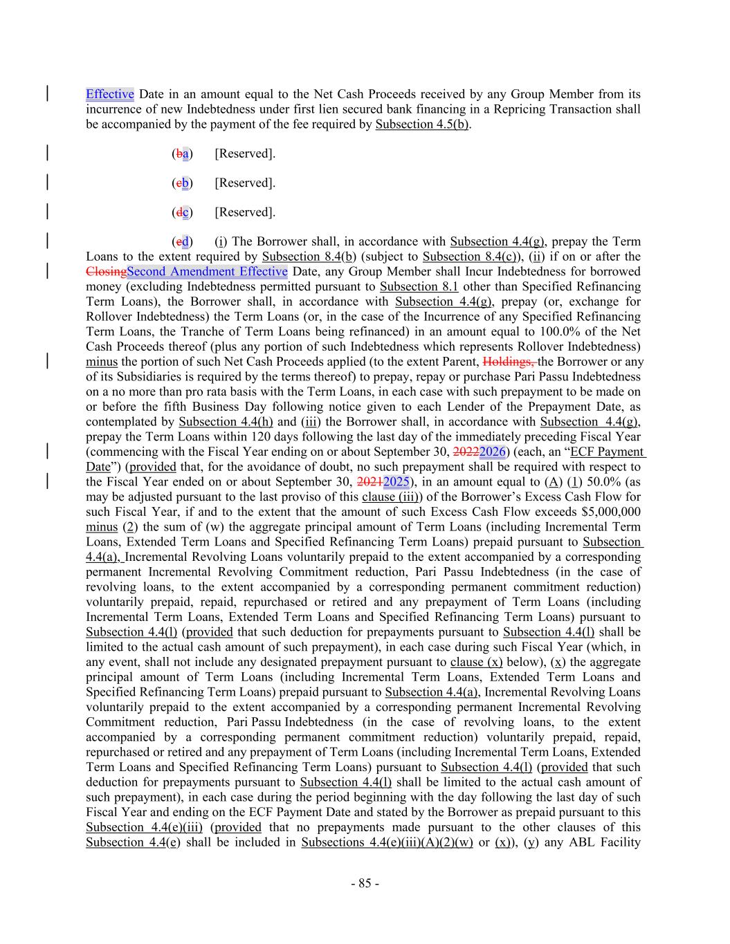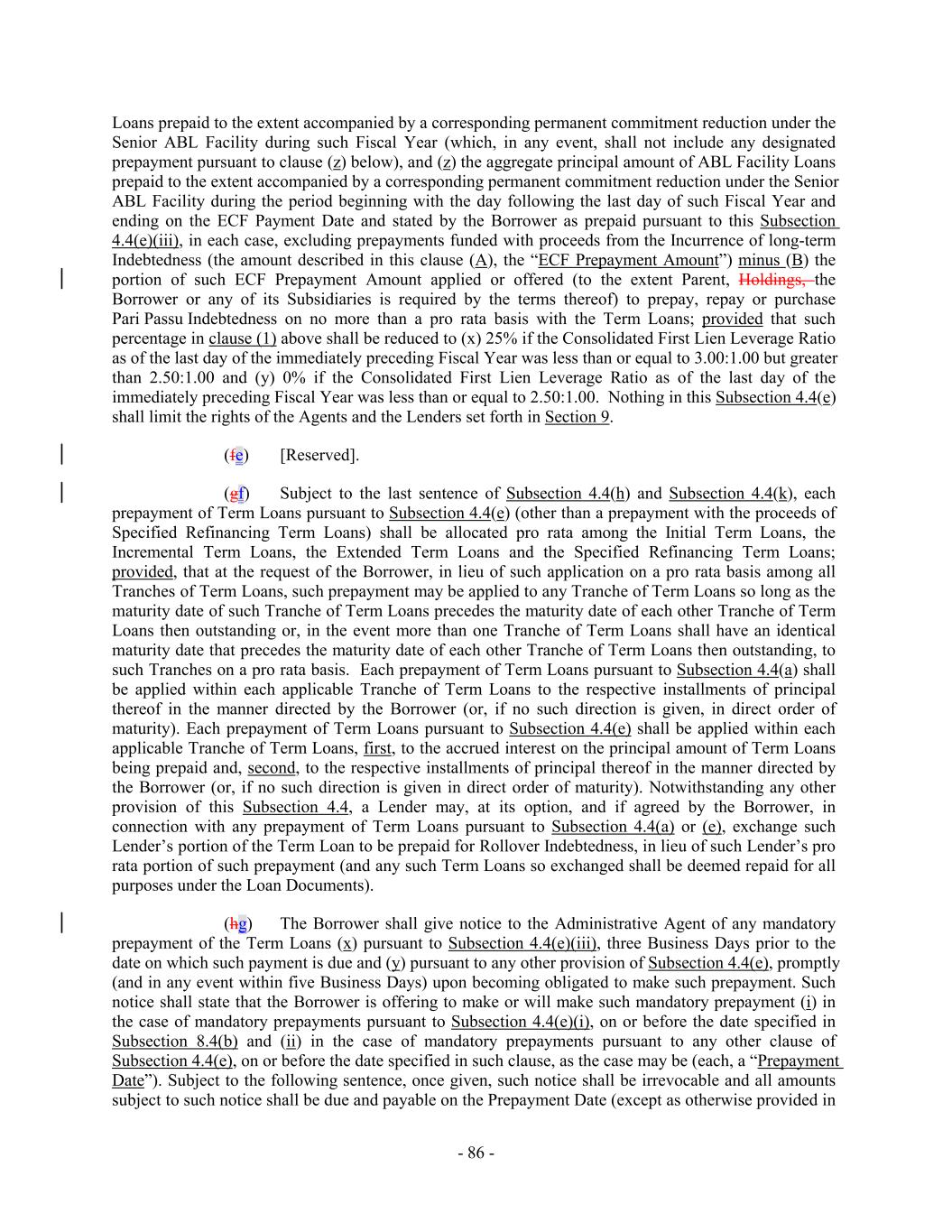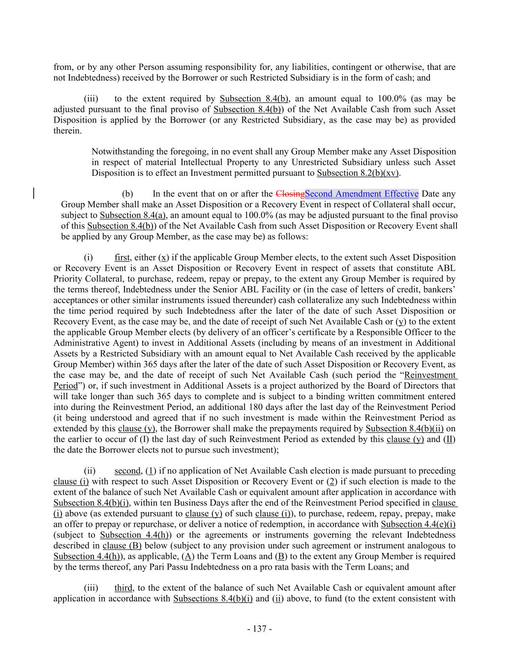 from, or by any other Person assuming responsibility for, any liabilities, contingent or otherwise, that are not Indebtedness) received by the Borrower or such Restricted Subsidiary is in the form of cash; and (iii) to the extent required by Subsection 8.4(b), an amount equal to 100.0% (as may be adjusted pursuant to the final proviso of Subsection 8.4(b)) of the Net Available Cash from such Asset Disposition is applied by the Borrower (or any Restricted Subsidiary, as the case may be) as provided therein. Notwithstanding the foregoing, in no event shall any Group Member make any Asset Disposition in respect of material Intellectual Property to any Unrestricted Subsidiary unless such Asset Disposition is to effect an Investment permitted pursuant to Subsection 8.2(b)(xv). (b) In the event that on or after the ClosingSecond Amendment Effective Date any Group Member shall make an Asset Disposition or a Recovery Event in respect of Collateral shall occur, subject to Subsection 8.4(a), an amount equal to 100.0% (as may be adjusted pursuant to the final proviso of this Subsection 8.4(b)) of the Net Available Cash from such Asset Disposition or Recovery Event shall be applied by any Group Member, as the case may be) as follows: (i) first, either (x) if the applicable Group Member elects, to the extent such Asset Disposition or Recovery Event is an Asset Disposition or Recovery Event in respect of assets that constitute ABL Priority Collateral, to purchase, redeem, repay or prepay, to the extent any Group Member is required by the terms thereof, Indebtedness under the Senior ABL Facility or (in the case of letters of credit, bankers’ acceptances or other similar instruments issued thereunder) cash collateralize any such Indebtedness within the time period required by such Indebtedness after the later of the date of such Asset Disposition or Recovery Event, as the case may be, and the date of receipt of such Net Available Cash or (y) to the extent the applicable Group Member elects (by delivery of an officer’s certificate by a Responsible Officer to the Administrative Agent) to invest in Additional Assets (including by means of an investment in Additional Assets by a Restricted Subsidiary with an amount equal to Net Available Cash received by the applicable Group Member) within 365 days after the later of the date of such Asset Disposition or Recovery Event, as the case may be, and the date of receipt of such Net Available Cash (such period the “Reinvestment Period”) or, if such investment in Additional Assets is a project authorized by the Board of Directors that will take longer than such 365 days to complete and is subject to a binding written commitment entered into during the Reinvestment Period, an additional 180 days after the last day of the Reinvestment Period (it being understood and agreed that if no such investment is made within the Reinvestment Period as extended by this clause (y), the Borrower shall make the prepayments required by Subsection 8.4(b)(ii) on the earlier to occur of (I) the last day of such Reinvestment Period as extended by this clause (y) and (II) the date the Borrower elects not to pursue such investment); (ii) second, (1) if no application of Net Available Cash election is made pursuant to preceding clause (i) with respect to such Asset Disposition or Recovery Event or (2) if such election is made to the extent of the balance of such Net Available Cash or equivalent amount after application in accordance with Subsection 8.4(b)(i), within ten Business Days after the end of the Reinvestment Period specified in clause (i) above (as extended pursuant to clause (y) of such clause (i)), to purchase, redeem, repay, prepay, make an offer to prepay or repurchase, or deliver a notice of redemption, in accordance with Subsection 4.4(e)(i) (subject to Subsection 4.4(h)) or the agreements or instruments governing the relevant Indebtedness described in clause (B) below (subject to any provision under such agreement or instrument analogous to Subsection 4.4(h)), as applicable, (A) the Term Loans and (B) to the extent any Group Member is required by the terms thereof, any Pari Passu Indebtedness on a pro rata basis with the Term Loans; and (iii) third, to the extent of the balance of such Net Available Cash or equivalent amount after application in accordance with Subsections 8.4(b)(i) and (ii) above, to fund (to the extent consistent with - 137 -