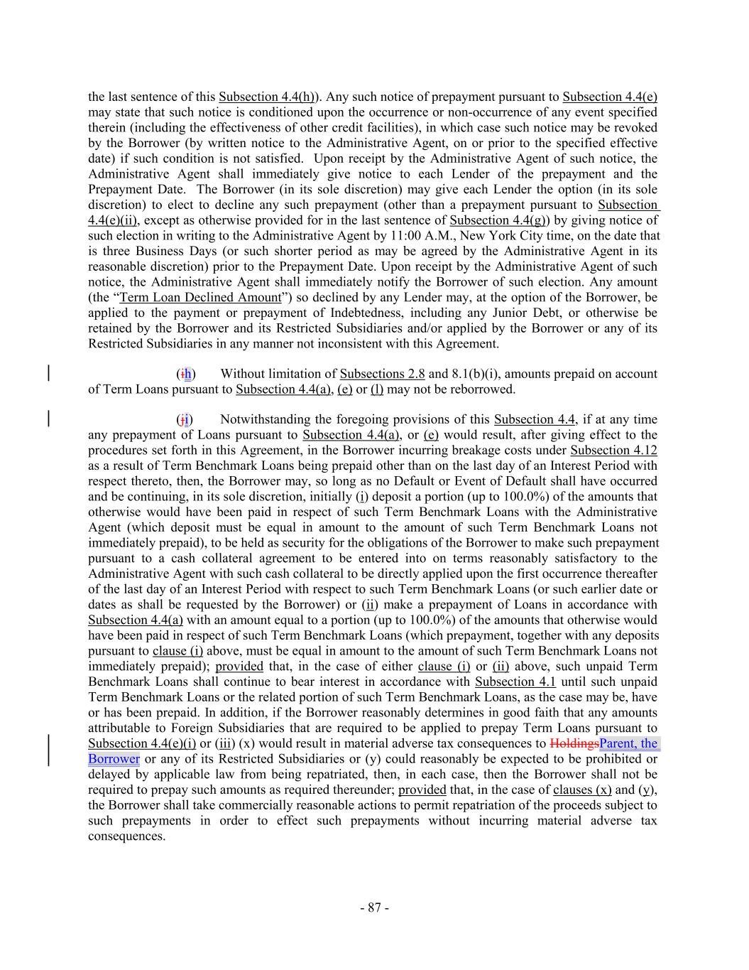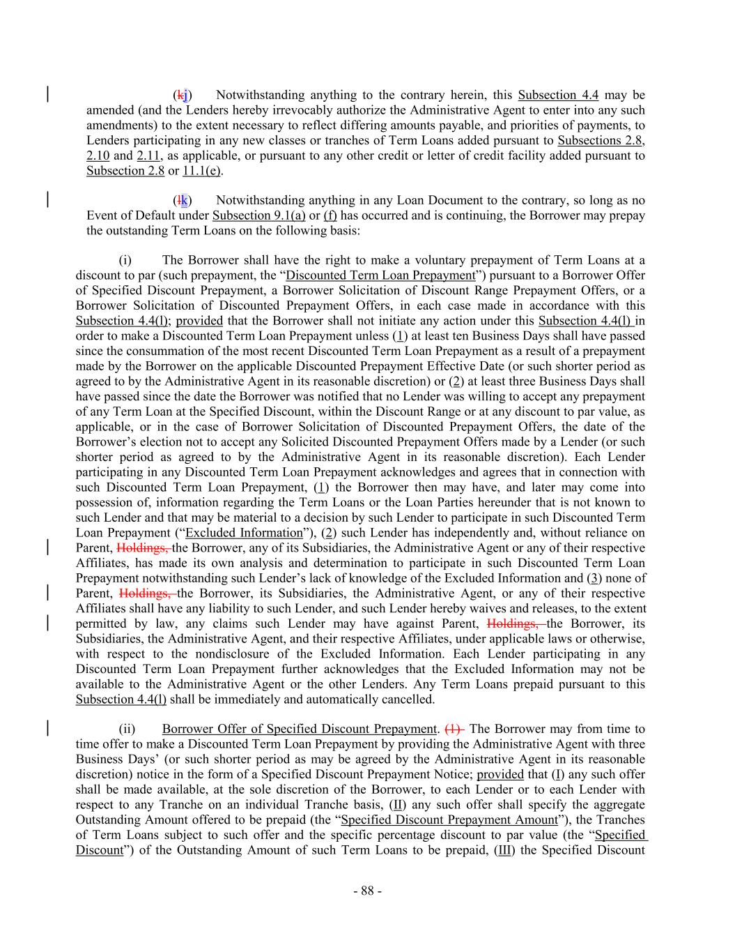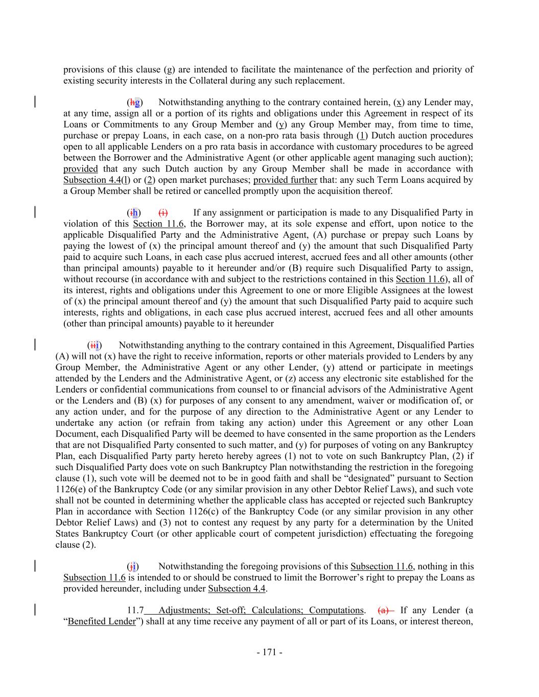 provisions of this clause (g) are intended to facilitate the maintenance of the perfection and priority of existing security interests in the Collateral during any such replacement. (hg) Notwithstanding anything to the contrary contained herein, (x) any Lender may, at any time, assign all or a portion of its rights and obligations under this Agreement in respect of its Loans or Commitments to any Group Member and (y) any Group Member may, from time to time, purchase or prepay Loans, in each case, on a non-pro rata basis through (1) Dutch auction procedures open to all applicable Lenders on a pro rata basis in accordance with customary procedures to be agreed between the Borrower and the Administrative Agent (or other applicable agent managing such auction); provided that any such Dutch auction by any Group Member shall be made in accordance with Subsection 4.4(l) or (2) open market purchases; provided further that: any such Term Loans acquired by a Group Member shall be retired or cancelled promptly upon the acquisition thereof. (ih) (i) If any assignment or participation is made to any Disqualified Party in violation of this Section 11.6, the Borrower may, at its sole expense and effort, upon notice to the applicable Disqualified Party and the Administrative Agent, (A) purchase or prepay such Loans by paying the lowest of (x) the principal amount thereof and (y) the amount that such Disqualified Party paid to acquire such Loans, in each case plus accrued interest, accrued fees and all other amounts (other than principal amounts) payable to it hereunder and/or (B) require such Disqualified Party to assign, without recourse (in accordance with and subject to the restrictions contained in this Section 11.6), all of its interest, rights and obligations under this Agreement to one or more Eligible Assignees at the lowest of (x) the principal amount thereof and (y) the amount that such Disqualified Party paid to acquire such interests, rights and obligations, in each case plus accrued interest, accrued fees and all other amounts (other than principal amounts) payable to it hereunder (iii) Notwithstanding anything to the contrary contained in this Agreement, Disqualified Parties (A) will not (x) have the right to receive information, reports or other materials provided to Lenders by any Group Member, the Administrative Agent or any other Lender, (y) attend or participate in meetings attended by the Lenders and the Administrative Agent, or (z) access any electronic site established for the Lenders or confidential communications from counsel to or financial advisors of the Administrative Agent or the Lenders and (B) (x) for purposes of any consent to any amendment, waiver or modification of, or any action under, and for the purpose of any direction to the Administrative Agent or any Lender to undertake any action (or refrain from taking any action) under this Agreement or any other Loan Document, each Disqualified Party will be deemed to have consented in the same proportion as the Lenders that are not Disqualified Party consented to such matter, and (y) for purposes of voting on any Bankruptcy Plan, each Disqualified Party party hereto hereby agrees (1) not to vote on such Bankruptcy Plan, (2) if such Disqualified Party does vote on such Bankruptcy Plan notwithstanding the restriction in the foregoing clause (1), such vote will be deemed not to be in good faith and shall be “designated” pursuant to Section 1126(e) of the Bankruptcy Code (or any similar provision in any other Debtor Relief Laws), and such vote shall not be counted in determining whether the applicable class has accepted or rejected such Bankruptcy Plan in accordance with Section 1126(c) of the Bankruptcy Code (or any similar provision in any other Debtor Relief Laws) and (3) not to contest any request by any party for a determination by the United States Bankruptcy Court (or other applicable court of competent jurisdiction) effectuating the foregoing clause (2). (ji) Notwithstanding the foregoing provisions of this Subsection 11.6, nothing in this Subsection 11.6 is intended to or should be construed to limit the Borrower’s right to prepay the Loans as provided hereunder, including under Subsection 4.4. 11.7 Adjustments; Set-off; Calculations; Computations. (a) If any Lender (a “Benefited Lender”) shall at any time receive any payment of all or part of its Loans, or interest thereon, - 171 -