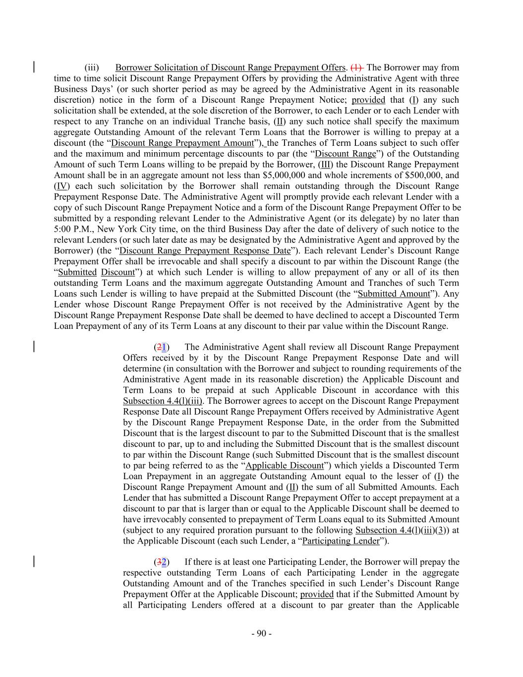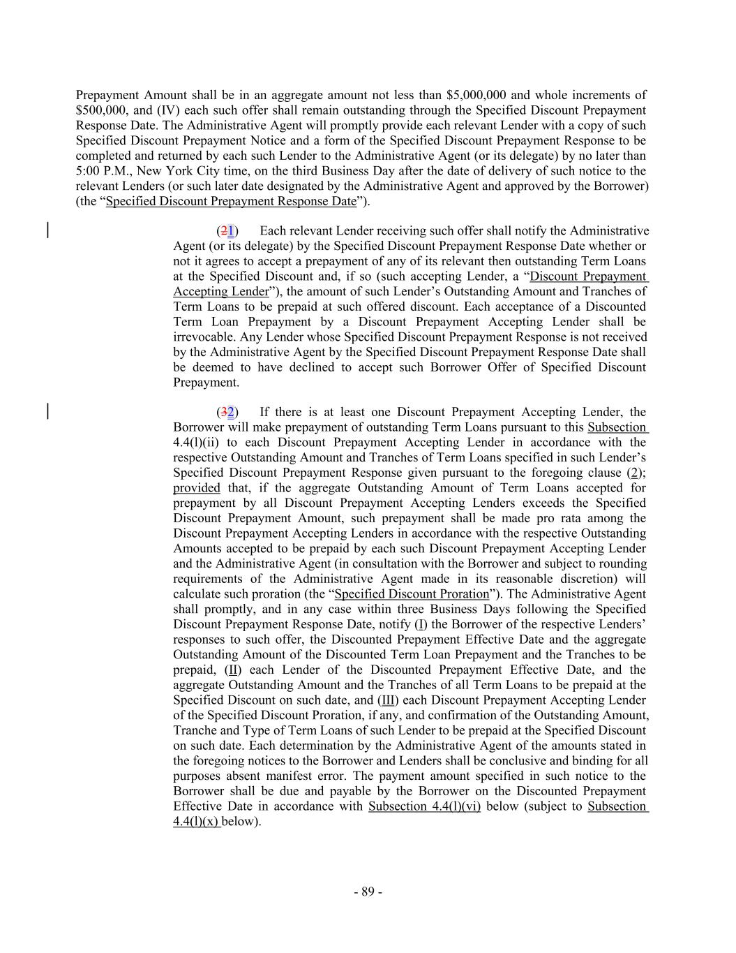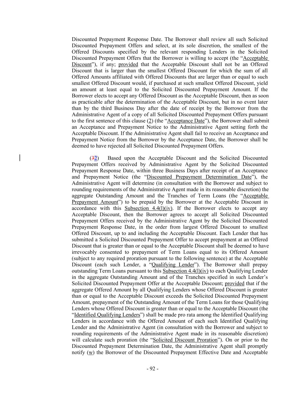 Discounted Prepayment Response Date. The Borrower shall review all such Solicited Discounted Prepayment Offers and select, at its sole discretion, the smallest of the Offered Discounts specified by the relevant responding Lenders in the Solicited Discounted Prepayment Offers that the Borrower is willing to accept (the “Acceptable Discount”), if any; provided that the Acceptable Discount shall not be an Offered Discount that is larger than the smallest Offered Discount for which the sum of all Offered Amounts affiliated with Offered Discounts that are larger than or equal to such smallest Offered Discount would, if purchased at such smallest Offered Discount, yield an amount at least equal to the Solicited Discounted Prepayment Amount. If the Borrower elects to accept any Offered Discount as the Acceptable Discount, then as soon as practicable after the determination of the Acceptable Discount, but in no event later than by the third Business Day after the date of receipt by the Borrower from the Administrative Agent of a copy of all Solicited Discounted Prepayment Offers pursuant to the first sentence of this clause (2) (the “Acceptance Date”), the Borrower shall submit an Acceptance and Prepayment Notice to the Administrative Agent setting forth the Acceptable Discount. If the Administrative Agent shall fail to receive an Acceptance and Prepayment Notice from the Borrower by the Acceptance Date, the Borrower shall be deemed to have rejected all Solicited Discounted Prepayment Offers. (32) Based upon the Acceptable Discount and the Solicited Discounted Prepayment Offers received by Administrative Agent by the Solicited Discounted Prepayment Response Date, within three Business Days after receipt of an Acceptance and Prepayment Notice (the “Discounted Prepayment Determination Date”), the Administrative Agent will determine (in consultation with the Borrower and subject to rounding requirements of the Administrative Agent made in its reasonable discretion) the aggregate Outstanding Amount and the Tranches of Term Loans (the “Acceptable Prepayment Amount”) to be prepaid by the Borrower at the Acceptable Discount in accordance with this Subsection 4.4(l)(iv). If the Borrower elects to accept any Acceptable Discount, then the Borrower agrees to accept all Solicited Discounted Prepayment Offers received by the Administrative Agent by the Solicited Discounted Prepayment Response Date, in the order from largest Offered Discount to smallest Offered Discount, up to and including the Acceptable Discount. Each Lender that has submitted a Solicited Discounted Prepayment Offer to accept prepayment at an Offered Discount that is greater than or equal to the Acceptable Discount shall be deemed to have irrevocably consented to prepayment of Term Loans equal to its Offered Amount (subject to any required proration pursuant to the following sentence) at the Acceptable Discount (each such Lender, a “Qualifying Lender”). The Borrower shall prepay outstanding Term Loans pursuant to this Subsection 4.4(l)(iv) to each Qualifying Lender in the aggregate Outstanding Amount and of the Tranches specified in such Lender’s Solicited Discounted Prepayment Offer at the Acceptable Discount; provided that if the aggregate Offered Amount by all Qualifying Lenders whose Offered Discount is greater than or equal to the Acceptable Discount exceeds the Solicited Discounted Prepayment Amount, prepayment of the Outstanding Amount of the Term Loans for those Qualifying Lenders whose Offered Discount is greater than or equal to the Acceptable Discount (the “Identified Qualifying Lenders”) shall be made pro rata among the Identified Qualifying Lenders in accordance with the Offered Amount of each such Identified Qualifying Lender and the Administrative Agent (in consultation with the Borrower and subject to rounding requirements of the Administrative Agent made in its reasonable discretion) will calculate such proration (the “Solicited Discount Proration”). On or prior to the Discounted Prepayment Determination Date, the Administrative Agent shall promptly notify (w) the Borrower of the Discounted Prepayment Effective Date and Acceptable - 92 -