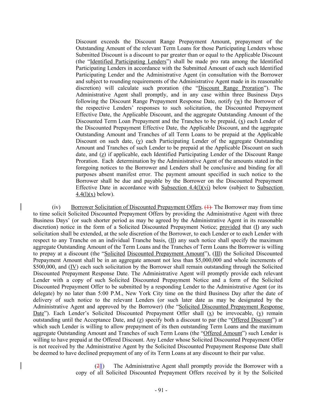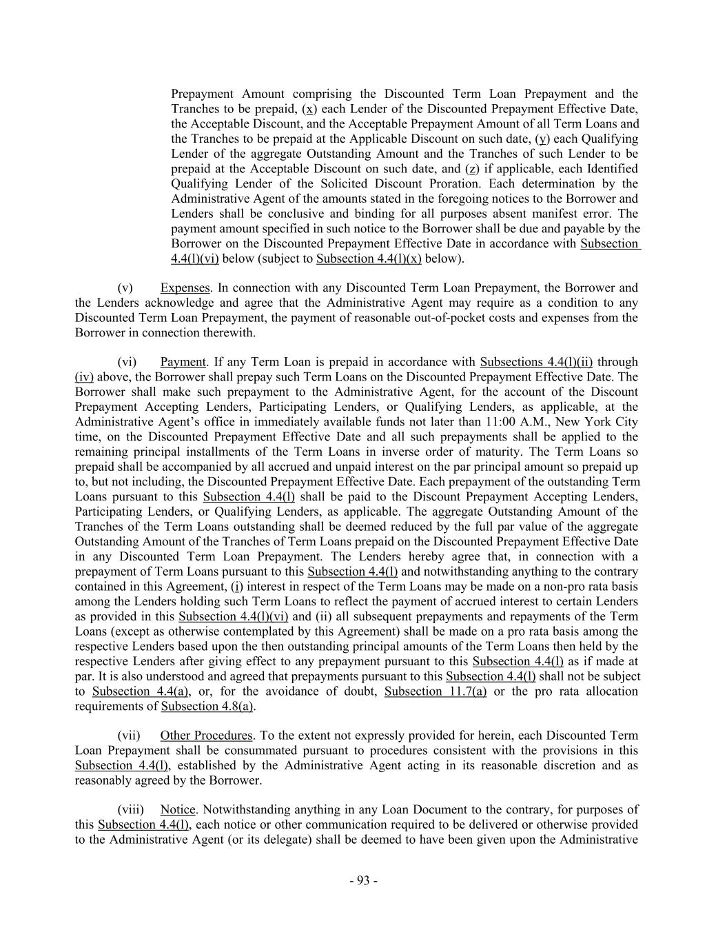Prepayment Amount comprising the Discounted Term Loan Prepayment and the Tranches to be prepaid, (x) each Lender of the Discounted Prepayment Effective Date, the Acceptable Discount, and the Acceptable Prepayment Amount of all Term Loans and the Tranches to be prepaid at the Applicable Discount on such date, (y) each Qualifying Lender of the aggregate Outstanding Amount and the Tranches of such Lender to be prepaid at the Acceptable Discount on such date, and (z) if applicable, each Identified Qualifying Lender of the Solicited Discount Proration. Each determination by the Administrative Agent of the amounts stated in the foregoing notices to the Borrower and Lenders shall be conclusive and binding for all purposes absent manifest error. The payment amount specified in such notice to the Borrower shall be due and payable by the Borrower on the Discounted Prepayment Effective Date in accordance with Subsection 4.4(l)(vi) below (subject to Subsection 4.4(l)(x) below). (v) Expenses. In connection with any Discounted Term Loan Prepayment, the Borrower and the Lenders acknowledge and agree that the Administrative Agent may require as a condition to any Discounted Term Loan Prepayment, the payment of reasonable out-of-pocket costs and expenses from the Borrower in connection therewith. (vi) Payment. If any Term Loan is prepaid in accordance with Subsections 4.4(l)(ii) through (iv) above, the Borrower shall prepay such Term Loans on the Discounted Prepayment Effective Date. The Borrower shall make such prepayment to the Administrative Agent, for the account of the Discount Prepayment Accepting Lenders, Participating Lenders, or Qualifying Lenders, as applicable, at the Administrative Agent’s office in immediately available funds not later than 11:00 A.M., New York City time, on the Discounted Prepayment Effective Date and all such prepayments shall be applied to the remaining principal installments of the Term Loans in inverse order of maturity. The Term Loans so prepaid shall be accompanied by all accrued and unpaid interest on the par principal amount so prepaid up to, but not including, the Discounted Prepayment Effective Date. Each prepayment of the outstanding Term Loans pursuant to this Subsection 4.4(l) shall be paid to the Discount Prepayment Accepting Lenders, Participating Lenders, or Qualifying Lenders, as applicable. The aggregate Outstanding Amount of the Tranches of the Term Loans outstanding shall be deemed reduced by the full par value of the aggregate Outstanding Amount of the Tranches of Term Loans prepaid on the Discounted Prepayment Effective Date in any Discounted Term Loan Prepayment. The Lenders hereby agree that, in connection with a prepayment of Term Loans pursuant to this Subsection 4.4(l) and notwithstanding anything to the contrary contained in this Agreement, (i) interest in respect of the Term Loans may be made on a non-pro rata basis among the Lenders holding such Term Loans to reflect the payment of accrued interest to certain Lenders as provided in this Subsection 4.4(l)(vi) and (ii) all subsequent prepayments and repayments of the Term Loans (except as otherwise contemplated by this Agreement) shall be made on a pro rata basis among the respective Lenders based upon the then outstanding principal amounts of the Term Loans then held by the respective Lenders after giving effect to any prepayment pursuant to this Subsection 4.4(l) as if made at par. It is also understood and agreed that prepayments pursuant to this Subsection 4.4(l) shall not be subject to Subsection 4.4(a), or, for the avoidance of doubt, Subsection 11.7(a) or the pro rata allocation requirements of Subsection 4.8(a). (vii) Other Procedures. To the extent not expressly provided for herein, each Discounted Term Loan Prepayment shall be consummated pursuant to procedures consistent with the provisions in this Subsection 4.4(l), established by the Administrative Agent acting in its reasonable discretion and as reasonably agreed by the Borrower. (viii) Notice. Notwithstanding anything in any Loan Document to the contrary, for purposes of this Subsection 4.4(l), each notice or other communication required to be delivered or otherwise provided to the Administrative Agent (or its delegate) shall be deemed to have been given upon the Administrative - 93 -