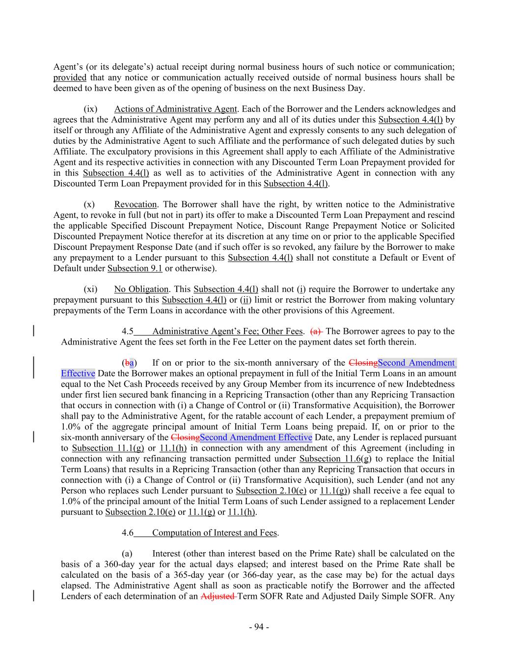 Agent’s (or its delegate’s) actual receipt during normal business hours of such notice or communication; provided that any notice or communication actually received outside of normal business hours shall be deemed to have been given as of the opening of business on the next Business Day. (ix) Actions of Administrative Agent. Each of the Borrower and the Lenders acknowledges and agrees that the Administrative Agent may perform any and all of its duties under this Subsection 4.4(l) by itself or through any Affiliate of the Administrative Agent and expressly consents to any such delegation of duties by the Administrative Agent to such Affiliate and the performance of such delegated duties by such Affiliate. The exculpatory provisions in this Agreement shall apply to each Affiliate of the Administrative Agent and its respective activities in connection with any Discounted Term Loan Prepayment provided for in this Subsection 4.4(l) as well as to activities of the Administrative Agent in connection with any Discounted Term Loan Prepayment provided for in this Subsection 4.4(l). (x) Revocation. The Borrower shall have the right, by written notice to the Administrative Agent, to revoke in full (but not in part) its offer to make a Discounted Term Loan Prepayment and rescind the applicable Specified Discount Prepayment Notice, Discount Range Prepayment Notice or Solicited Discounted Prepayment Notice therefor at its discretion at any time on or prior to the applicable Specified Discount Prepayment Response Date (and if such offer is so revoked, any failure by the Borrower to make any prepayment to a Lender pursuant to this Subsection 4.4(l) shall not constitute a Default or Event of Default under Subsection 9.1 or otherwise). (xi) No Obligation. This Subsection 4.4(l) shall not (i) require the Borrower to undertake any prepayment pursuant to this Subsection 4.4(l) or (ii) limit or restrict the Borrower from making voluntary prepayments of the Term Loans in accordance with the other provisions of this Agreement. 4.5 Administrative Agent’s Fee; Other Fees. (a) The Borrower agrees to pay to the Administrative Agent the fees set forth in the Fee Letter on the payment dates set forth therein. (ba) If on or prior to the six-month anniversary of the ClosingSecond Amendment Effective Date the Borrower makes an optional prepayment in full of the Initial Term Loans in an amount equal to the Net Cash Proceeds received by any Group Member from its incurrence of new Indebtedness under first lien secured bank financing in a Repricing Transaction (other than any Repricing Transaction that occurs in connection with (i) a Change of Control or (ii) Transformative Acquisition), the Borrower shall pay to the Administrative Agent, for the ratable account of each Lender, a prepayment premium of 1.0% of the aggregate principal amount of Initial Term Loans being prepaid. If, on or prior to the six-month anniversary of the ClosingSecond Amendment Effective Date, any Lender is replaced pursuant to Subsection 11.1(g) or 11.1(h) in connection with any amendment of this Agreement (including in connection with any refinancing transaction permitted under Subsection 11.6(g) to replace the Initial Term Loans) that results in a Repricing Transaction (other than any Repricing Transaction that occurs in connection with (i) a Change of Control or (ii) Transformative Acquisition), such Lender (and not any Person who replaces such Lender pursuant to Subsection 2.10(e) or 11.1(g)) shall receive a fee equal to 1.0% of the principal amount of the Initial Term Loans of such Lender assigned to a replacement Lender pursuant to Subsection 2.10(e) or 11.1(g) or 11.1(h). 4.6 Computation of Interest and Fees. (a) Interest (other than interest based on the Prime Rate) shall be calculated on the basis of a 360-day year for the actual days elapsed; and interest based on the Prime Rate shall be calculated on the basis of a 365-day year (or 366-day year, as the case may be) for the actual days elapsed. The Administrative Agent shall as soon as practicable notify the Borrower and the affected Lenders of each determination of an Adjusted Term SOFR Rate and Adjusted Daily Simple SOFR. Any - 94 -