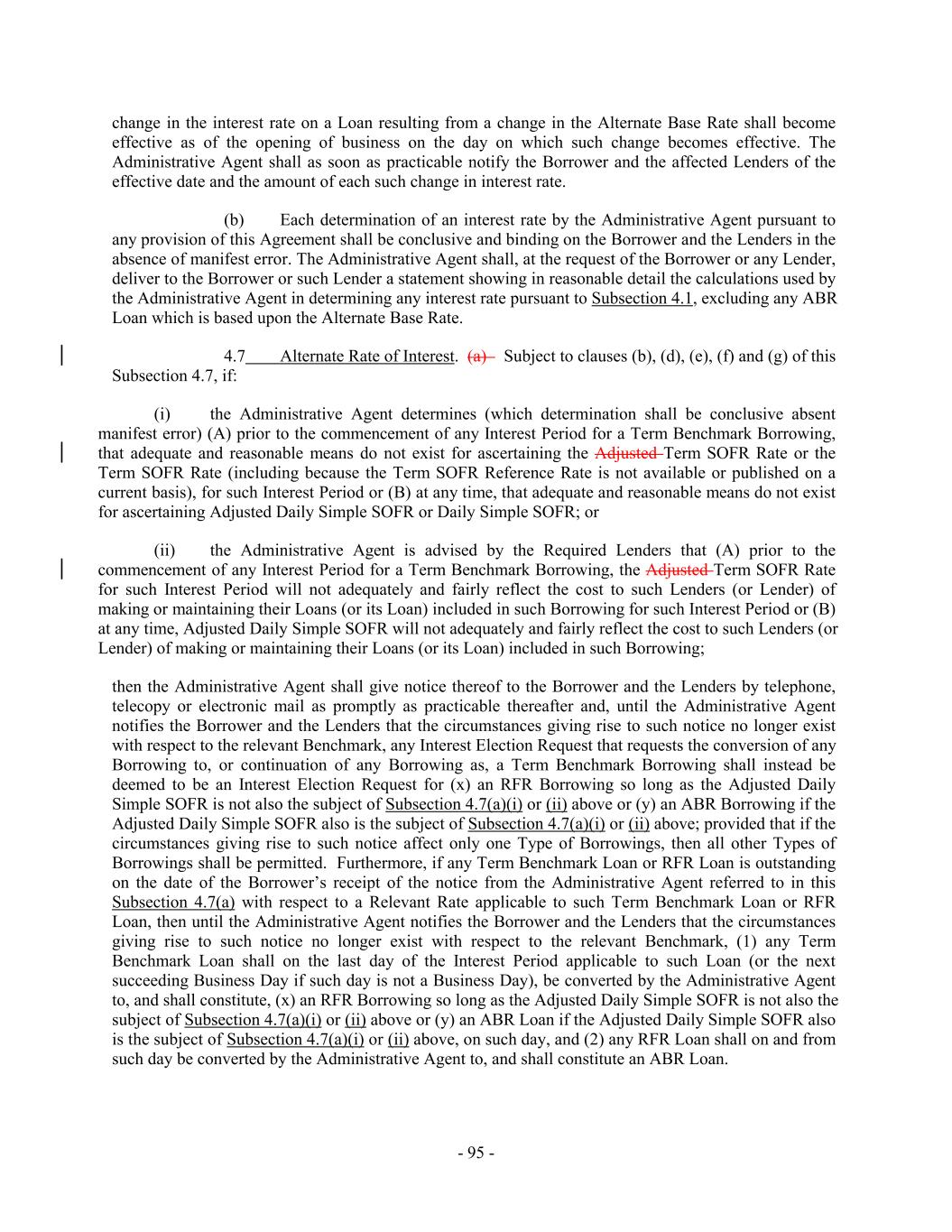 change in the interest rate on a Loan resulting from a change in the Alternate Base Rate shall become effective as of the opening of business on the day on which such change becomes effective. The Administrative Agent shall as soon as practicable notify the Borrower and the affected Lenders of the effective date and the amount of each such change in interest rate. (b) Each determination of an interest rate by the Administrative Agent pursuant to any provision of this Agreement shall be conclusive and binding on the Borrower and the Lenders in the absence of manifest error. The Administrative Agent shall, at the request of the Borrower or any Lender, deliver to the Borrower or such Lender a statement showing in reasonable detail the calculations used by the Administrative Agent in determining any interest rate pursuant to Subsection 4.1, excluding any ABR Loan which is based upon the Alternate Base Rate. 4.7 Alternate Rate of Interest. (a) Subject to clauses (b), (d), (e), (f) and (g) of this Subsection 4.7, if: (i) the Administrative Agent determines (which determination shall be conclusive absent manifest error) (A) prior to the commencement of any Interest Period for a Term Benchmark Borrowing, that adequate and reasonable means do not exist for ascertaining the Adjusted Term SOFR Rate or the Term SOFR Rate (including because the Term SOFR Reference Rate is not available or published on a current basis), for such Interest Period or (B) at any time, that adequate and reasonable means do not exist for ascertaining Adjusted Daily Simple SOFR or Daily Simple SOFR; or (ii) the Administrative Agent is advised by the Required Lenders that (A) prior to the commencement of any Interest Period for a Term Benchmark Borrowing, the Adjusted Term SOFR Rate for such Interest Period will not adequately and fairly reflect the cost to such Lenders (or Lender) of making or maintaining their Loans (or its Loan) included in such Borrowing for such Interest Period or (B) at any time, Adjusted Daily Simple SOFR will not adequately and fairly reflect the cost to such Lenders (or Lender) of making or maintaining their Loans (or its Loan) included in such Borrowing; then the Administrative Agent shall give notice thereof to the Borrower and the Lenders by telephone, telecopy or electronic mail as promptly as practicable thereafter and, until the Administrative Agent notifies the Borrower and the Lenders that the circumstances giving rise to such notice no longer exist with respect to the relevant Benchmark, any Interest Election Request that requests the conversion of any Borrowing to, or continuation of any Borrowing as, a Term Benchmark Borrowing shall instead be deemed to be an Interest Election Request for (x) an RFR Borrowing so long as the Adjusted Daily Simple SOFR is not also the subject of Subsection 4.7(a)(i) or (ii) above or (y) an ABR Borrowing if the Adjusted Daily Simple SOFR also is the subject of Subsection 4.7(a)(i) or (ii) above; provided that if the circumstances giving rise to such notice affect only one Type of Borrowings, then all other Types of Borrowings shall be permitted. Furthermore, if any Term Benchmark Loan or RFR Loan is outstanding on the date of the Borrower’s receipt of the notice from the Administrative Agent referred to in this Subsection 4.7(a) with respect to a Relevant Rate applicable to such Term Benchmark Loan or RFR Loan, then until the Administrative Agent notifies the Borrower and the Lenders that the circumstances giving rise to such notice no longer exist with respect to the relevant Benchmark, (1) any Term Benchmark Loan shall on the last day of the Interest Period applicable to such Loan (or the next succeeding Business Day if such day is not a Business Day), be converted by the Administrative Agent to, and shall constitute, (x) an RFR Borrowing so long as the Adjusted Daily Simple SOFR is not also the subject of Subsection 4.7(a)(i) or (ii) above or (y) an ABR Loan if the Adjusted Daily Simple SOFR also is the subject of Subsection 4.7(a)(i) or (ii) above, on such day, and (2) any RFR Loan shall on and from such day be converted by the Administrative Agent to, and shall constitute an ABR Loan. - 95 -