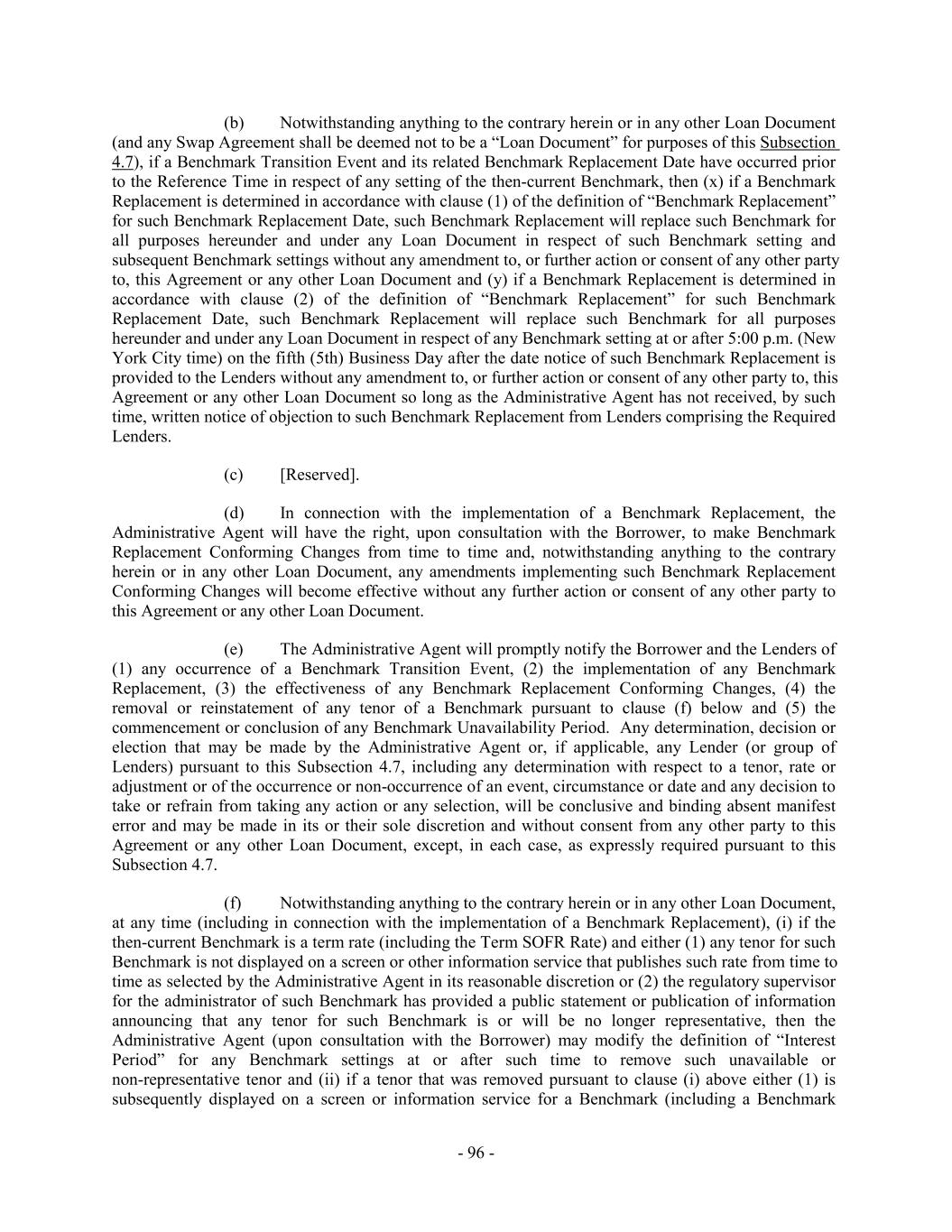 (b) Notwithstanding anything to the contrary herein or in any other Loan Document (and any Swap Agreement shall be deemed not to be a “Loan Document” for purposes of this Subsection 4.7), if a Benchmark Transition Event and its related Benchmark Replacement Date have occurred prior to the Reference Time in respect of any setting of the then-current Benchmark, then (x) if a Benchmark Replacement is determined in accordance with clause (1) of the definition of “Benchmark Replacement” for such Benchmark Replacement Date, such Benchmark Replacement will replace such Benchmark for all purposes hereunder and under any Loan Document in respect of such Benchmark setting and subsequent Benchmark settings without any amendment to, or further action or consent of any other party to, this Agreement or any other Loan Document and (y) if a Benchmark Replacement is determined in accordance with clause (2) of the definition of “Benchmark Replacement” for such Benchmark Replacement Date, such Benchmark Replacement will replace such Benchmark for all purposes hereunder and under any Loan Document in respect of any Benchmark setting at or after 5:00 p.m. (New York City time) on the fifth (5th) Business Day after the date notice of such Benchmark Replacement is provided to the Lenders without any amendment to, or further action or consent of any other party to, this Agreement or any other Loan Document so long as the Administrative Agent has not received, by such time, written notice of objection to such Benchmark Replacement from Lenders comprising the Required Lenders. (c) [Reserved]. (d) In connection with the implementation of a Benchmark Replacement, the Administrative Agent will have the right, upon consultation with the Borrower, to make Benchmark Replacement Conforming Changes from time to time and, notwithstanding anything to the contrary herein or in any other Loan Document, any amendments implementing such Benchmark Replacement Conforming Changes will become effective without any further action or consent of any other party to this Agreement or any other Loan Document. (e) The Administrative Agent will promptly notify the Borrower and the Lenders of (1) any occurrence of a Benchmark Transition Event, (2) the implementation of any Benchmark Replacement, (3) the effectiveness of any Benchmark Replacement Conforming Changes, (4) the removal or reinstatement of any tenor of a Benchmark pursuant to clause (f) below and (5) the commencement or conclusion of any Benchmark Unavailability Period. Any determination, decision or election that may be made by the Administrative Agent or, if applicable, any Lender (or group of Lenders) pursuant to this Subsection 4.7, including any determination with respect to a tenor, rate or adjustment or of the occurrence or non-occurrence of an event, circumstance or date and any decision to take or refrain from taking any action or any selection, will be conclusive and binding absent manifest error and may be made in its or their sole discretion and without consent from any other party to this Agreement or any other Loan Document, except, in each case, as expressly required pursuant to this Subsection 4.7. (f) Notwithstanding anything to the contrary herein or in any other Loan Document, at any time (including in connection with the implementation of a Benchmark Replacement), (i) if the then-current Benchmark is a term rate (including the Term SOFR Rate) and either (1) any tenor for such Benchmark is not displayed on a screen or other information service that publishes such rate from time to time as selected by the Administrative Agent in its reasonable discretion or (2) the regulatory supervisor for the administrator of such Benchmark has provided a public statement or publication of information announcing that any tenor for such Benchmark is or will be no longer representative, then the Administrative Agent (upon consultation with the Borrower) may modify the definition of “Interest Period” for any Benchmark settings at or after such time to remove such unavailable or non-representative tenor and (ii) if a tenor that was removed pursuant to clause (i) above either (1) is subsequently displayed on a screen or information service for a Benchmark (including a Benchmark - 96 -