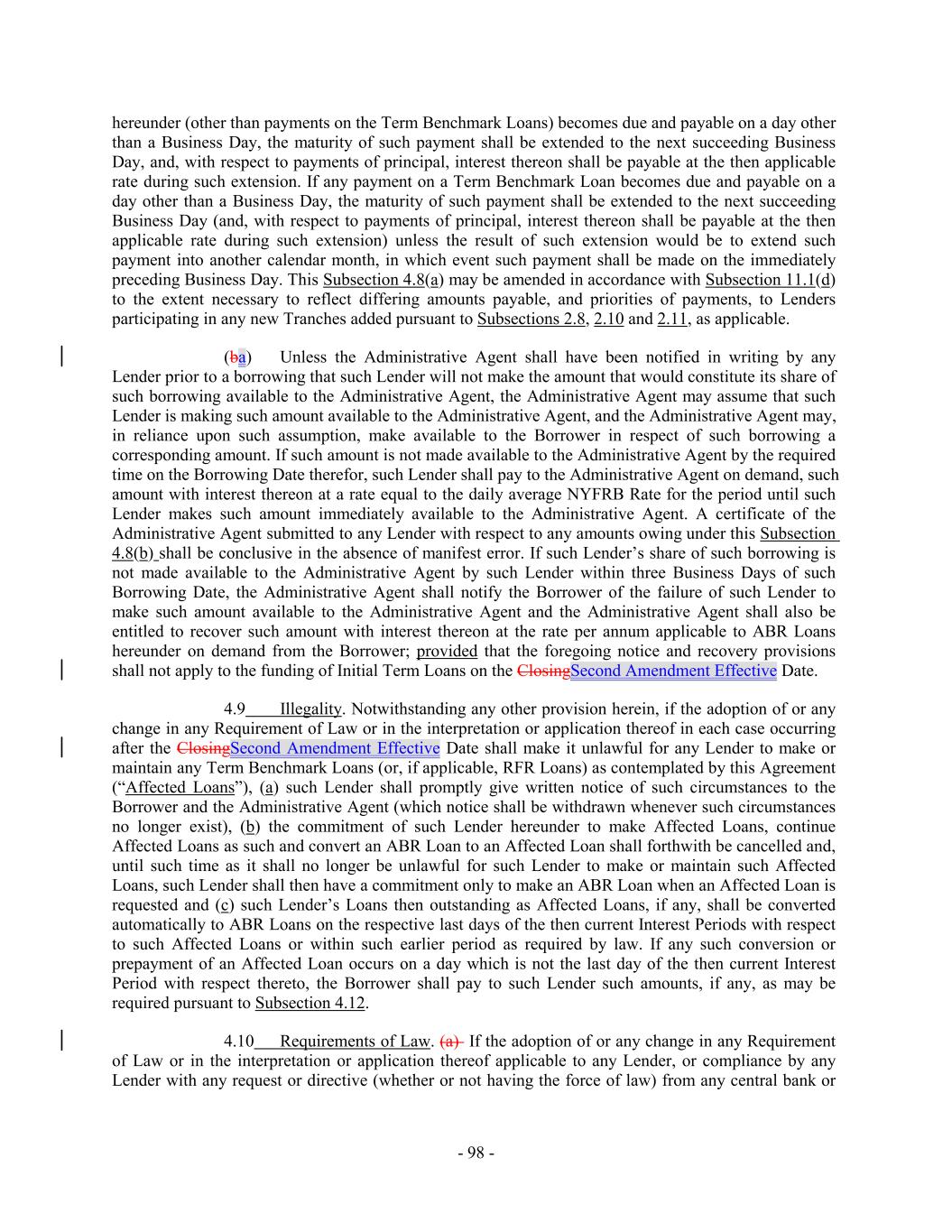 hereunder (other than payments on the Term Benchmark Loans) becomes due and payable on a day other than a Business Day, the maturity of such payment shall be extended to the next succeeding Business Day, and, with respect to payments of principal, interest thereon shall be payable at the then applicable rate during such extension. If any payment on a Term Benchmark Loan becomes due and payable on a day other than a Business Day, the maturity of such payment shall be extended to the next succeeding Business Day (and, with respect to payments of principal, interest thereon shall be payable at the then applicable rate during such extension) unless the result of such extension would be to extend such payment into another calendar month, in which event such payment shall be made on the immediately preceding Business Day. This Subsection 4.8(a) may be amended in accordance with Subsection 11.1(d) to the extent necessary to reflect differing amounts payable, and priorities of payments, to Lenders participating in any new Tranches added pursuant to Subsections 2.8, 2.10 and 2.11, as applicable. (ba) Unless the Administrative Agent shall have been notified in writing by any Lender prior to a borrowing that such Lender will not make the amount that would constitute its share of such borrowing available to the Administrative Agent, the Administrative Agent may assume that such Lender is making such amount available to the Administrative Agent, and the Administrative Agent may, in reliance upon such assumption, make available to the Borrower in respect of such borrowing a corresponding amount. If such amount is not made available to the Administrative Agent by the required time on the Borrowing Date therefor, such Lender shall pay to the Administrative Agent on demand, such amount with interest thereon at a rate equal to the daily average NYFRB Rate for the period until such Lender makes such amount immediately available to the Administrative Agent. A certificate of the Administrative Agent submitted to any Lender with respect to any amounts owing under this Subsection 4.8(b) shall be conclusive in the absence of manifest error. If such Lender’s share of such borrowing is not made available to the Administrative Agent by such Lender within three Business Days of such Borrowing Date, the Administrative Agent shall notify the Borrower of the failure of such Lender to make such amount available to the Administrative Agent and the Administrative Agent shall also be entitled to recover such amount with interest thereon at the rate per annum applicable to ABR Loans hereunder on demand from the Borrower; provided that the foregoing notice and recovery provisions shall not apply to the funding of Initial Term Loans on the ClosingSecond Amendment Effective Date. 4.9 Illegality. Notwithstanding any other provision herein, if the adoption of or any change in any Requirement of Law or in the interpretation or application thereof in each case occurring after the ClosingSecond Amendment Effective Date shall make it unlawful for any Lender to make or maintain any Term Benchmark Loans (or, if applicable, RFR Loans) as contemplated by this Agreement (“Affected Loans”), (a) such Lender shall promptly give written notice of such circumstances to the Borrower and the Administrative Agent (which notice shall be withdrawn whenever such circumstances no longer exist), (b) the commitment of such Lender hereunder to make Affected Loans, continue Affected Loans as such and convert an ABR Loan to an Affected Loan shall forthwith be cancelled and, until such time as it shall no longer be unlawful for such Lender to make or maintain such Affected Loans, such Lender shall then have a commitment only to make an ABR Loan when an Affected Loan is requested and (c) such Lender’s Loans then outstanding as Affected Loans, if any, shall be converted automatically to ABR Loans on the respective last days of the then current Interest Periods with respect to such Affected Loans or within such earlier period as required by law. If any such conversion or prepayment of an Affected Loan occurs on a day which is not the last day of the then current Interest Period with respect thereto, the Borrower shall pay to such Lender such amounts, if any, as may be required pursuant to Subsection 4.12. 4.10 Requirements of Law. (a) If the adoption of or any change in any Requirement of Law or in the interpretation or application thereof applicable to any Lender, or compliance by any Lender with any request or directive (whether or not having the force of law) from any central bank or - 98 -