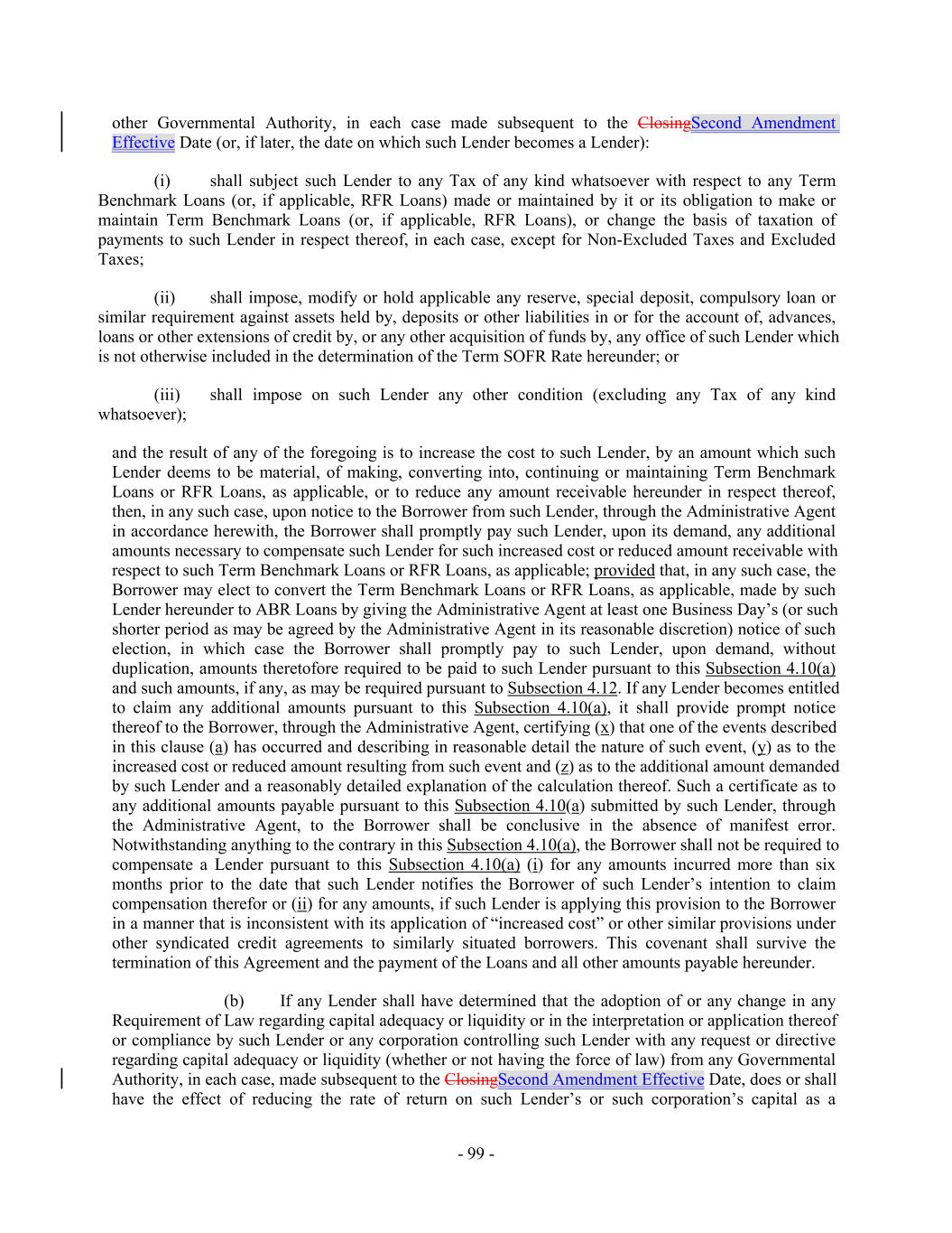 other Governmental Authority, in each case made subsequent to the ClosingSecond Amendment Effective Date (or, if later, the date on which such Lender becomes a Lender): (i) shall subject such Lender to any Tax of any kind whatsoever with respect to any Term Benchmark Loans (or, if applicable, RFR Loans) made or maintained by it or its obligation to make or maintain Term Benchmark Loans (or, if applicable, RFR Loans), or change the basis of taxation of payments to such Lender in respect thereof, in each case, except for Non-Excluded Taxes and Excluded Taxes; (ii) shall impose, modify or hold applicable any reserve, special deposit, compulsory loan or similar requirement against assets held by, deposits or other liabilities in or for the account of, advances, loans or other extensions of credit by, or any other acquisition of funds by, any office of such Lender which is not otherwise included in the determination of the Term SOFR Rate hereunder; or (iii) shall impose on such Lender any other condition (excluding any Tax of any kind whatsoever); and the result of any of the foregoing is to increase the cost to such Lender, by an amount which such Lender deems to be material, of making, converting into, continuing or maintaining Term Benchmark Loans or RFR Loans, as applicable, or to reduce any amount receivable hereunder in respect thereof, then, in any such case, upon notice to the Borrower from such Lender, through the Administrative Agent in accordance herewith, the Borrower shall promptly pay such Lender, upon its demand, any additional amounts necessary to compensate such Lender for such increased cost or reduced amount receivable with respect to such Term Benchmark Loans or RFR Loans, as applicable; provided that, in any such case, the Borrower may elect to convert the Term Benchmark Loans or RFR Loans, as applicable, made by such Lender hereunder to ABR Loans by giving the Administrative Agent at least one Business Day’s (or such shorter period as may be agreed by the Administrative Agent in its reasonable discretion) notice of such election, in which case the Borrower shall promptly pay to such Lender, upon demand, without duplication, amounts theretofore required to be paid to such Lender pursuant to this Subsection 4.10(a) and such amounts, if any, as may be required pursuant to Subsection 4.12. If any Lender becomes entitled to claim any additional amounts pursuant to this Subsection 4.10(a), it shall provide prompt notice thereof to the Borrower, through the Administrative Agent, certifying (x) that one of the events described in this clause (a) has occurred and describing in reasonable detail the nature of such event, (y) as to the increased cost or reduced amount resulting from such event and (z) as to the additional amount demanded by such Lender and a reasonably detailed explanation of the calculation thereof. Such a certificate as to any additional amounts payable pursuant to this Subsection 4.10(a) submitted by such Lender, through the Administrative Agent, to the Borrower shall be conclusive in the absence of manifest error. Notwithstanding anything to the contrary in this Subsection 4.10(a), the Borrower shall not be required to compensate a Lender pursuant to this Subsection 4.10(a) (i) for any amounts incurred more than six months prior to the date that such Lender notifies the Borrower of such Lender’s intention to claim compensation therefor or (ii) for any amounts, if such Lender is applying this provision to the Borrower in a manner that is inconsistent with its application of “increased cost” or other similar provisions under other syndicated credit agreements to similarly situated borrowers. This covenant shall survive the termination of this Agreement and the payment of the Loans and all other amounts payable hereunder. (b) If any Lender shall have determined that the adoption of or any change in any Requirement of Law regarding capital adequacy or liquidity or in the interpretation or application thereof or compliance by such Lender or any corporation controlling such Lender with any request or directive regarding capital adequacy or liquidity (whether or not having the force of law) from any Governmental Authority, in each case, made subsequent to the ClosingSecond Amendment Effective Date, does or shall have the effect of reducing the rate of return on such Lender’s or such corporation’s capital as a - 99 -