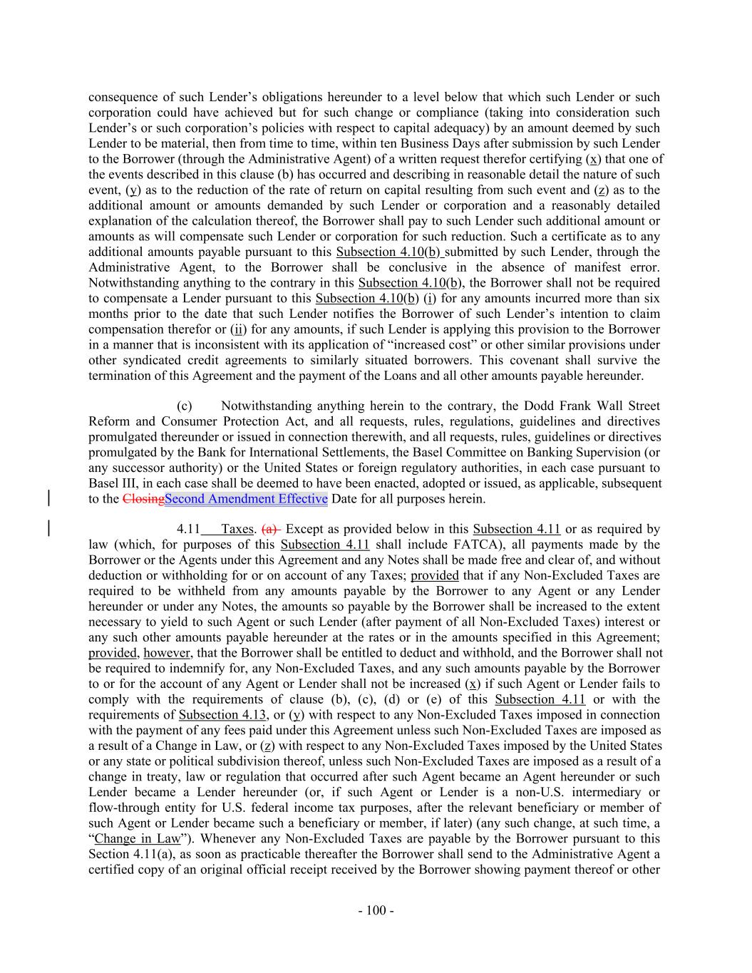consequence of such Lender’s obligations hereunder to a level below that which such Lender or such corporation could have achieved but for such change or compliance (taking into consideration such Lender’s or such corporation’s policies with respect to capital adequacy) by an amount deemed by such Lender to be material, then from time to time, within ten Business Days after submission by such Lender to the Borrower (through the Administrative Agent) of a written request therefor certifying (x) that one of the events described in this clause (b) has occurred and describing in reasonable detail the nature of such event, (y) as to the reduction of the rate of return on capital resulting from such event and (z) as to the additional amount or amounts demanded by such Lender or corporation and a reasonably detailed explanation of the calculation thereof, the Borrower shall pay to such Lender such additional amount or amounts as will compensate such Lender or corporation for such reduction. Such a certificate as to any additional amounts payable pursuant to this Subsection 4.10(b) submitted by such Lender, through the Administrative Agent, to the Borrower shall be conclusive in the absence of manifest error. Notwithstanding anything to the contrary in this Subsection 4.10(b), the Borrower shall not be required to compensate a Lender pursuant to this Subsection 4.10(b) (i) for any amounts incurred more than six months prior to the date that such Lender notifies the Borrower of such Lender’s intention to claim compensation therefor or (ii) for any amounts, if such Lender is applying this provision to the Borrower in a manner that is inconsistent with its application of “increased cost” or other similar provisions under other syndicated credit agreements to similarly situated borrowers. This covenant shall survive the termination of this Agreement and the payment of the Loans and all other amounts payable hereunder. (c) Notwithstanding anything herein to the contrary, the Dodd Frank Wall Street Reform and Consumer Protection Act, and all requests, rules, regulations, guidelines and directives promulgated thereunder or issued in connection therewith, and all requests, rules, guidelines or directives promulgated by the Bank for International Settlements, the Basel Committee on Banking Supervision (or any successor authority) or the United States or foreign regulatory authorities, in each case pursuant to Basel III, in each case shall be deemed to have been enacted, adopted or issued, as applicable, subsequent to the ClosingSecond Amendment Effective Date for all purposes herein. 4.11 Taxes. (a) Except as provided below in this Subsection 4.11 or as required by law (which, for purposes of this Subsection 4.11 shall include FATCA), all payments made by the Borrower or the Agents under this Agreement and any Notes shall be made free and clear of, and without deduction or withholding for or on account of any Taxes; provided that if any Non-Excluded Taxes are required to be withheld from any amounts payable by the Borrower to any Agent or any Lender hereunder or under any Notes, the amounts so payable by the Borrower shall be increased to the extent necessary to yield to such Agent or such Lender (after payment of all Non-Excluded Taxes) interest or any such other amounts payable hereunder at the rates or in the amounts specified in this Agreement; provided, however, that the Borrower shall be entitled to deduct and withhold, and the Borrower shall not be required to indemnify for, any Non-Excluded Taxes, and any such amounts payable by the Borrower to or for the account of any Agent or Lender shall not be increased (x) if such Agent or Lender fails to comply with the requirements of clause (b), (c), (d) or (e) of this Subsection 4.11 or with the requirements of Subsection 4.13, or (y) with respect to any Non-Excluded Taxes imposed in connection with the payment of any fees paid under this Agreement unless such Non-Excluded Taxes are imposed as a result of a Change in Law, or (z) with respect to any Non-Excluded Taxes imposed by the United States or any state or political subdivision thereof, unless such Non-Excluded Taxes are imposed as a result of a change in treaty, law or regulation that occurred after such Agent became an Agent hereunder or such Lender became a Lender hereunder (or, if such Agent or Lender is a non-U.S. intermediary or flow-through entity for U.S. federal income tax purposes, after the relevant beneficiary or member of such Agent or Lender became such a beneficiary or member, if later) (any such change, at such time, a “Change in Law”). Whenever any Non-Excluded Taxes are payable by the Borrower pursuant to this Section 4.11(a), as soon as practicable thereafter the Borrower shall send to the Administrative Agent a certified copy of an original official receipt received by the Borrower showing payment thereof or other - 100 -