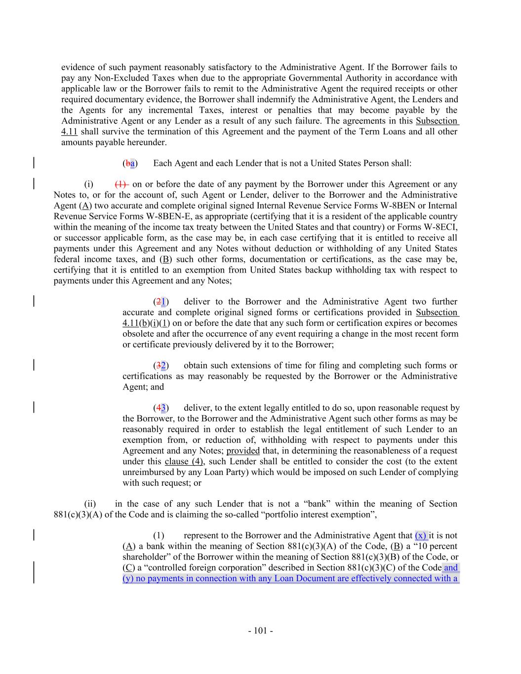 evidence of such payment reasonably satisfactory to the Administrative Agent. If the Borrower fails to pay any Non-Excluded Taxes when due to the appropriate Governmental Authority in accordance with applicable law or the Borrower fails to remit to the Administrative Agent the required receipts or other required documentary evidence, the Borrower shall indemnify the Administrative Agent, the Lenders and the Agents for any incremental Taxes, interest or penalties that may become payable by the Administrative Agent or any Lender as a result of any such failure. The agreements in this Subsection 4.11 shall survive the termination of this Agreement and the payment of the Term Loans and all other amounts payable hereunder. (ba) Each Agent and each Lender that is not a United States Person shall: (i) (1) on or before the date of any payment by the Borrower under this Agreement or any Notes to, or for the account of, such Agent or Lender, deliver to the Borrower and the Administrative Agent (A) two accurate and complete original signed Internal Revenue Service Forms W-8BEN or Internal Revenue Service Forms W-8BEN-E, as appropriate (certifying that it is a resident of the applicable country within the meaning of the income tax treaty between the United States and that country) or Forms W-8ECI, or successor applicable form, as the case may be, in each case certifying that it is entitled to receive all payments under this Agreement and any Notes without deduction or withholding of any United States federal income taxes, and (B) such other forms, documentation or certifications, as the case may be, certifying that it is entitled to an exemption from United States backup withholding tax with respect to payments under this Agreement and any Notes; (21) deliver to the Borrower and the Administrative Agent two further accurate and complete original signed forms or certifications provided in Subsection 4.11(b)(i)(1) on or before the date that any such form or certification expires or becomes obsolete and after the occurrence of any event requiring a change in the most recent form or certificate previously delivered by it to the Borrower; (32) obtain such extensions of time for filing and completing such forms or certifications as may reasonably be requested by the Borrower or the Administrative Agent; and (43) deliver, to the extent legally entitled to do so, upon reasonable request by the Borrower, to the Borrower and the Administrative Agent such other forms as may be reasonably required in order to establish the legal entitlement of such Lender to an exemption from, or reduction of, withholding with respect to payments under this Agreement and any Notes; provided that, in determining the reasonableness of a request under this clause (4), such Lender shall be entitled to consider the cost (to the extent unreimbursed by any Loan Party) which would be imposed on such Lender of complying with such request; or (ii) in the case of any such Lender that is not a “bank” within the meaning of Section 881(c)(3)(A) of the Code and is claiming the so-called “portfolio interest exemption”, (1) represent to the Borrower and the Administrative Agent that (x) it is not (A) a bank within the meaning of Section 881(c)(3)(A) of the Code, (B) a “10 percent shareholder” of the Borrower within the meaning of Section 881(c)(3)(B) of the Code, or (C) a “controlled foreign corporation” described in Section 881(c)(3)(C) of the Code and (y) no payments in connection with any Loan Document are effectively connected with a - 101 -