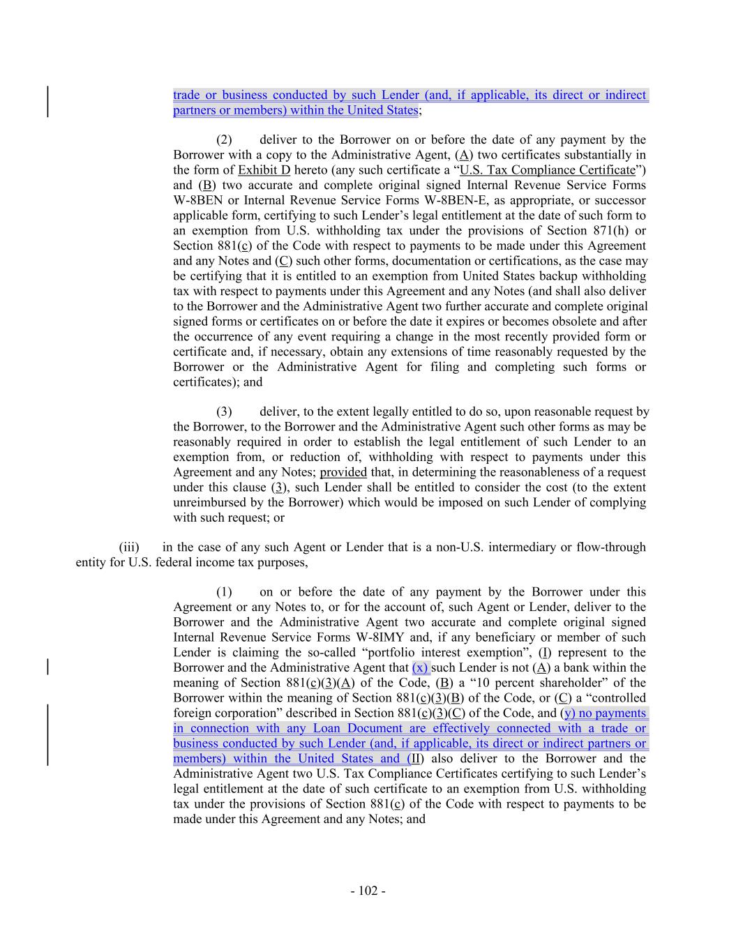 trade or business conducted by such Lender (and, if applicable, its direct or indirect partners or members) within the United States; (2) deliver to the Borrower on or before the date of any payment by the Borrower with a copy to the Administrative Agent, (A) two certificates substantially in the form of Exhibit D hereto (any such certificate a “U.S. Tax Compliance Certificate”) and (B) two accurate and complete original signed Internal Revenue Service Forms W-8BEN or Internal Revenue Service Forms W-8BEN-E, as appropriate, or successor applicable form, certifying to such Lender’s legal entitlement at the date of such form to an exemption from U.S. withholding tax under the provisions of Section 871(h) or Section 881(c) of the Code with respect to payments to be made under this Agreement and any Notes and (C) such other forms, documentation or certifications, as the case may be certifying that it is entitled to an exemption from United States backup withholding tax with respect to payments under this Agreement and any Notes (and shall also deliver to the Borrower and the Administrative Agent two further accurate and complete original signed forms or certificates on or before the date it expires or becomes obsolete and after the occurrence of any event requiring a change in the most recently provided form or certificate and, if necessary, obtain any extensions of time reasonably requested by the Borrower or the Administrative Agent for filing and completing such forms or certificates); and (3) deliver, to the extent legally entitled to do so, upon reasonable request by the Borrower, to the Borrower and the Administrative Agent such other forms as may be reasonably required in order to establish the legal entitlement of such Lender to an exemption from, or reduction of, withholding with respect to payments under this Agreement and any Notes; provided that, in determining the reasonableness of a request under this clause (3), such Lender shall be entitled to consider the cost (to the extent unreimbursed by the Borrower) which would be imposed on such Lender of complying with such request; or (iii) in the case of any such Agent or Lender that is a non-U.S. intermediary or flow-through entity for U.S. federal income tax purposes, (1) on or before the date of any payment by the Borrower under this Agreement or any Notes to, or for the account of, such Agent or Lender, deliver to the Borrower and the Administrative Agent two accurate and complete original signed Internal Revenue Service Forms W-8IMY and, if any beneficiary or member of such Lender is claiming the so-called “portfolio interest exemption”, (I) represent to the Borrower and the Administrative Agent that (x) such Lender is not (A) a bank within the meaning of Section 881(c)(3)(A) of the Code, (B) a “10 percent shareholder” of the Borrower within the meaning of Section 881(c)(3)(B) of the Code, or (C) a “controlled foreign corporation” described in Section 881(c)(3)(C) of the Code, and (y) no payments in connection with any Loan Document are effectively connected with a trade or business conducted by such Lender (and, if applicable, its direct or indirect partners or members) within the United States and (II) also deliver to the Borrower and the Administrative Agent two U.S. Tax Compliance Certificates certifying to such Lender’s legal entitlement at the date of such certificate to an exemption from U.S. withholding tax under the provisions of Section 881(c) of the Code with respect to payments to be made under this Agreement and any Notes; and - 102 -