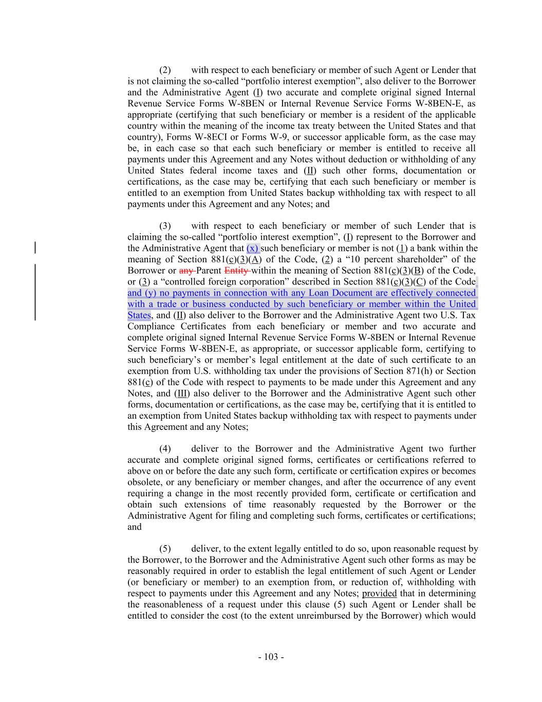 (2) with respect to each beneficiary or member of such Agent or Lender that is not claiming the so-called “portfolio interest exemption”, also deliver to the Borrower and the Administrative Agent (I) two accurate and complete original signed Internal Revenue Service Forms W-8BEN or Internal Revenue Service Forms W-8BEN-E, as appropriate (certifying that such beneficiary or member is a resident of the applicable country within the meaning of the income tax treaty between the United States and that country), Forms W-8ECI or Forms W-9, or successor applicable form, as the case may be, in each case so that each such beneficiary or member is entitled to receive all payments under this Agreement and any Notes without deduction or withholding of any United States federal income taxes and (II) such other forms, documentation or certifications, as the case may be, certifying that each such beneficiary or member is entitled to an exemption from United States backup withholding tax with respect to all payments under this Agreement and any Notes; and (3) with respect to each beneficiary or member of such Lender that is claiming the so-called “portfolio interest exemption”, (I) represent to the Borrower and the Administrative Agent that (x) such beneficiary or member is not (1) a bank within the meaning of Section 881(c)(3)(A) of the Code, (2) a “10 percent shareholder” of the Borrower or any Parent Entity within the meaning of Section 881(c)(3)(B) of the Code, or (3) a “controlled foreign corporation” described in Section 881(c)(3)(C) of the Code and (y) no payments in connection with any Loan Document are effectively connected with a trade or business conducted by such beneficiary or member within the United States, and (II) also deliver to the Borrower and the Administrative Agent two U.S. Tax Compliance Certificates from each beneficiary or member and two accurate and complete original signed Internal Revenue Service Forms W-8BEN or Internal Revenue Service Forms W-8BEN-E, as appropriate, or successor applicable form, certifying to such beneficiary’s or member’s legal entitlement at the date of such certificate to an exemption from U.S. withholding tax under the provisions of Section 871(h) or Section 881(c) of the Code with respect to payments to be made under this Agreement and any Notes, and (III) also deliver to the Borrower and the Administrative Agent such other forms, documentation or certifications, as the case may be, certifying that it is entitled to an exemption from United States backup withholding tax with respect to payments under this Agreement and any Notes; (4) deliver to the Borrower and the Administrative Agent two further accurate and complete original signed forms, certificates or certifications referred to above on or before the date any such form, certificate or certification expires or becomes obsolete, or any beneficiary or member changes, and after the occurrence of any event requiring a change in the most recently provided form, certificate or certification and obtain such extensions of time reasonably requested by the Borrower or the Administrative Agent for filing and completing such forms, certificates or certifications; and (5) deliver, to the extent legally entitled to do so, upon reasonable request by the Borrower, to the Borrower and the Administrative Agent such other forms as may be reasonably required in order to establish the legal entitlement of such Agent or Lender (or beneficiary or member) to an exemption from, or reduction of, withholding with respect to payments under this Agreement and any Notes; provided that in determining the reasonableness of a request under this clause (5) such Agent or Lender shall be entitled to consider the cost (to the extent unreimbursed by the Borrower) which would - 103 -