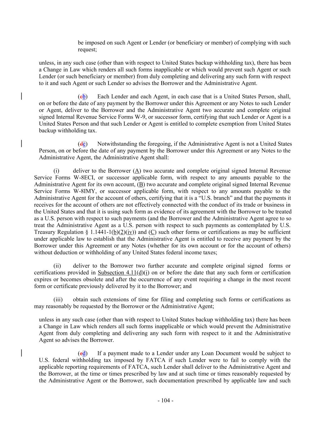 be imposed on such Agent or Lender (or beneficiary or member) of complying with such request; unless, in any such case (other than with respect to United States backup withholding tax), there has been a Change in Law which renders all such forms inapplicable or which would prevent such Agent or such Lender (or such beneficiary or member) from duly completing and delivering any such form with respect to it and such Agent or such Lender so advises the Borrower and the Administrative Agent. (cb) Each Lender and each Agent, in each case that is a United States Person, shall, on or before the date of any payment by the Borrower under this Agreement or any Notes to such Lender or Agent, deliver to the Borrower and the Administrative Agent two accurate and complete original signed Internal Revenue Service Forms W-9, or successor form, certifying that such Lender or Agent is a United States Person and that such Lender or Agent is entitled to complete exemption from United States backup withholding tax. (dc) Notwithstanding the foregoing, if the Administrative Agent is not a United States Person, on or before the date of any payment by the Borrower under this Agreement or any Notes to the Administrative Agent, the Administrative Agent shall: (i) deliver to the Borrower (A) two accurate and complete original signed Internal Revenue Service Forms W-8ECI, or successor applicable form, with respect to any amounts payable to the Administrative Agent for its own account, (B) two accurate and complete original signed Internal Revenue Service Forms W-8IMY, or successor applicable form, with respect to any amounts payable to the Administrative Agent for the account of others, certifying that it is a “U.S. branch” and that the payments it receives for the account of others are not effectively connected with the conduct of its trade or business in the United States and that it is using such form as evidence of its agreement with the Borrower to be treated as a U.S. person with respect to such payments (and the Borrower and the Administrative Agent agree to so treat the Administrative Agent as a U.S. person with respect to such payments as contemplated by U.S. Treasury Regulation § 1.1441-1(b)(2)(iv)) and (C) such other forms or certifications as may be sufficient under applicable law to establish that the Administrative Agent is entitled to receive any payment by the Borrower under this Agreement or any Notes (whether for its own account or for the account of others) without deduction or withholding of any United States federal income taxes; (ii) deliver to the Borrower two further accurate and complete original signed forms or certifications provided in Subsection 4.11(d)(i) on or before the date that any such form or certification expires or becomes obsolete and after the occurrence of any event requiring a change in the most recent form or certificate previously delivered by it to the Borrower; and (iii) obtain such extensions of time for filing and completing such forms or certifications as may reasonably be requested by the Borrower or the Administrative Agent; unless in any such case (other than with respect to United States backup withholding tax) there has been a Change in Law which renders all such forms inapplicable or which would prevent the Administrative Agent from duly completing and delivering any such form with respect to it and the Administrative Agent so advises the Borrower. (ed) If a payment made to a Lender under any Loan Document would be subject to U.S. federal withholding tax imposed by FATCA if such Lender were to fail to comply with the applicable reporting requirements of FATCA, such Lender shall deliver to the Administrative Agent and the Borrower, at the time or times prescribed by law and at such time or times reasonably requested by the Administrative Agent or the Borrower, such documentation prescribed by applicable law and such - 104 -