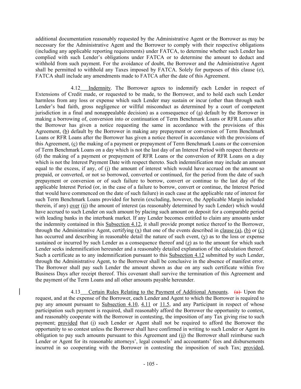 additional documentation reasonably requested by the Administrative Agent or the Borrower as may be necessary for the Administrative Agent and the Borrower to comply with their respective obligations (including any applicable reporting requirements) under FATCA, to determine whether such Lender has complied with such Lender’s obligations under FATCA or to determine the amount to deduct and withhold from such payment. For the avoidance of doubt, the Borrower and the Administrative Agent shall be permitted to withhold any Taxes imposed by FATCA. Solely for purposes of this clause (e), FATCA shall include any amendments made to FATCA after the date of this Agreement. 4.12 Indemnity. The Borrower agrees to indemnify each Lender in respect of Extensions of Credit made, or requested to be made, to the Borrower, and to hold each such Lender harmless from any loss or expense which such Lender may sustain or incur (other than through such Lender’s bad faith, gross negligence or willful misconduct as determined by a court of competent jurisdiction in a final and nonappealable decision) as a consequence of (a) default by the Borrower in making a borrowing of, conversion into or continuation of Term Benchmark Loans or RFR Loans after the Borrower has given a notice requesting the same in accordance with the provisions of this Agreement, (b) default by the Borrower in making any prepayment or conversion of Term Benchmark Loans or RFR Loans after the Borrower has given a notice thereof in accordance with the provisions of this Agreement, (c) the making of a payment or prepayment of Term Benchmark Loans or the conversion of Term Benchmark Loans on a day which is not the last day of an Interest Period with respect thereto or (d) the making of a payment or prepayment of RFR Loans or the conversion of RFR Loans on a day which is not the Interest Payment Date with respect thereto. Such indemnification may include an amount equal to the excess, if any, of (i) the amount of interest which would have accrued on the amount so prepaid, or converted, or not so borrowed, converted or continued, for the period from the date of such prepayment or conversion or of such failure to borrow, convert or continue to the last day of the applicable Interest Period (or, in the case of a failure to borrow, convert or continue, the Interest Period that would have commenced on the date of such failure) in each case at the applicable rate of interest for such Term Benchmark Loans provided for herein (excluding, however, the Applicable Margin included therein, if any) over (ii) the amount of interest (as reasonably determined by such Lender) which would have accrued to such Lender on such amount by placing such amount on deposit for a comparable period with leading banks in the interbank market. If any Lender becomes entitled to claim any amounts under the indemnity contained in this Subsection 4.12, it shall provide prompt notice thereof to the Borrower, through the Administrative Agent, certifying (x) that one of the events described in clause (a), (b) or (c) has occurred and describing in reasonable detail the nature of such event, (y) as to the loss or expense sustained or incurred by such Lender as a consequence thereof and (z) as to the amount for which such Lender seeks indemnification hereunder and a reasonably detailed explanation of the calculation thereof. Such a certificate as to any indemnification pursuant to this Subsection 4.12 submitted by such Lender, through the Administrative Agent, to the Borrower shall be conclusive in the absence of manifest error. The Borrower shall pay such Lender the amount shown as due on any such certificate within five Business Days after receipt thereof. This covenant shall survive the termination of this Agreement and the payment of the Term Loans and all other amounts payable hereunder. 4.13 Certain Rules Relating to the Payment of Additional Amounts. (a) Upon the request, and at the expense of the Borrower, each Lender and Agent to which the Borrower is required to pay any amount pursuant to Subsection 4.10, 4.11 or 11.5, and any Participant in respect of whose participation such payment is required, shall reasonably afford the Borrower the opportunity to contest, and reasonably cooperate with the Borrower in contesting, the imposition of any Tax giving rise to such payment; provided that (i) such Lender or Agent shall not be required to afford the Borrower the opportunity to so contest unless the Borrower shall have confirmed in writing to such Lender or Agent its obligation to pay such amounts pursuant to this Agreement and (ii) the Borrower shall reimburse such Lender or Agent for its reasonable attorneys’, legal counsels’ and accountants’ fees and disbursements incurred in so cooperating with the Borrower in contesting the imposition of such Tax; provided, - 105 -