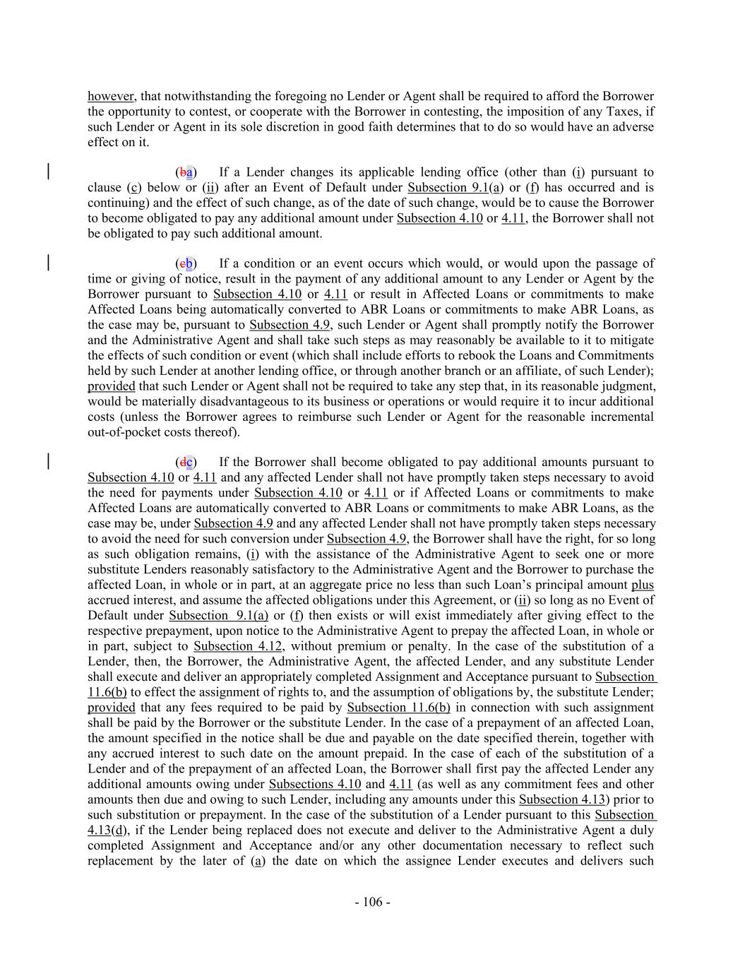 however, that notwithstanding the foregoing no Lender or Agent shall be required to afford the Borrower the opportunity to contest, or cooperate with the Borrower in contesting, the imposition of any Taxes, if such Lender or Agent in its sole discretion in good faith determines that to do so would have an adverse effect on it. (ba) If a Lender changes its applicable lending office (other than (i) pursuant to clause (c) below or (ii) after an Event of Default under Subsection 9.1(a) or (f) has occurred and is continuing) and the effect of such change, as of the date of such change, would be to cause the Borrower to become obligated to pay any additional amount under Subsection 4.10 or 4.11, the Borrower shall not be obligated to pay such additional amount. (cb) If a condition or an event occurs which would, or would upon the passage of time or giving of notice, result in the payment of any additional amount to any Lender or Agent by the Borrower pursuant to Subsection 4.10 or 4.11 or result in Affected Loans or commitments to make Affected Loans being automatically converted to ABR Loans or commitments to make ABR Loans, as the case may be, pursuant to Subsection 4.9, such Lender or Agent shall promptly notify the Borrower and the Administrative Agent and shall take such steps as may reasonably be available to it to mitigate the effects of such condition or event (which shall include efforts to rebook the Loans and Commitments held by such Lender at another lending office, or through another branch or an affiliate, of such Lender); provided that such Lender or Agent shall not be required to take any step that, in its reasonable judgment, would be materially disadvantageous to its business or operations or would require it to incur additional costs (unless the Borrower agrees to reimburse such Lender or Agent for the reasonable incremental out-of-pocket costs thereof). (dc) If the Borrower shall become obligated to pay additional amounts pursuant to Subsection 4.10 or 4.11 and any affected Lender shall not have promptly taken steps necessary to avoid the need for payments under Subsection 4.10 or 4.11 or if Affected Loans or commitments to make Affected Loans are automatically converted to ABR Loans or commitments to make ABR Loans, as the case may be, under Subsection 4.9 and any affected Lender shall not have promptly taken steps necessary to avoid the need for such conversion under Subsection 4.9, the Borrower shall have the right, for so long as such obligation remains, (i) with the assistance of the Administrative Agent to seek one or more substitute Lenders reasonably satisfactory to the Administrative Agent and the Borrower to purchase the affected Loan, in whole or in part, at an aggregate price no less than such Loan’s principal amount plus accrued interest, and assume the affected obligations under this Agreement, or (ii) so long as no Event of Default under Subsection 9.1(a) or (f) then exists or will exist immediately after giving effect to the respective prepayment, upon notice to the Administrative Agent to prepay the affected Loan, in whole or in part, subject to Subsection 4.12, without premium or penalty. In the case of the substitution of a Lender, then, the Borrower, the Administrative Agent, the affected Lender, and any substitute Lender shall execute and deliver an appropriately completed Assignment and Acceptance pursuant to Subsection 11.6(b) to effect the assignment of rights to, and the assumption of obligations by, the substitute Lender; provided that any fees required to be paid by Subsection 11.6(b) in connection with such assignment shall be paid by the Borrower or the substitute Lender. In the case of a prepayment of an affected Loan, the amount specified in the notice shall be due and payable on the date specified therein, together with any accrued interest to such date on the amount prepaid. In the case of each of the substitution of a Lender and of the prepayment of an affected Loan, the Borrower shall first pay the affected Lender any additional amounts owing under Subsections 4.10 and 4.11 (as well as any commitment fees and other amounts then due and owing to such Lender, including any amounts under this Subsection 4.13) prior to such substitution or prepayment. In the case of the substitution of a Lender pursuant to this Subsection 4.13(d), if the Lender being replaced does not execute and deliver to the Administrative Agent a duly completed Assignment and Acceptance and/or any other documentation necessary to reflect such replacement by the later of (a) the date on which the assignee Lender executes and delivers such - 106 -