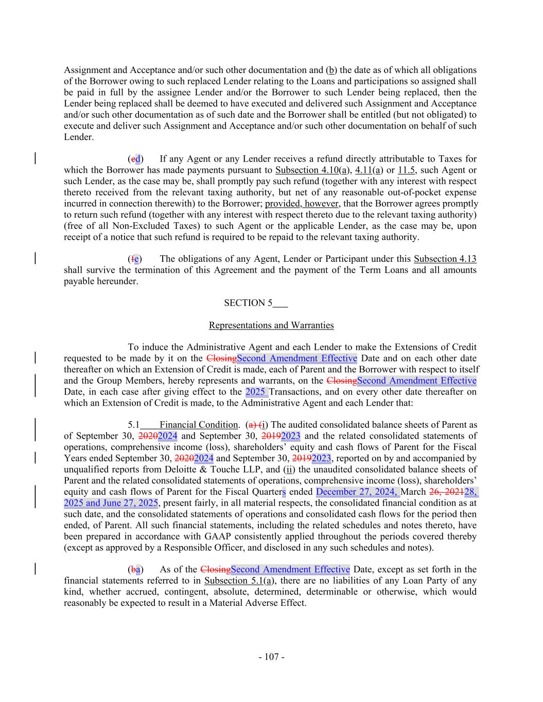 Assignment and Acceptance and/or such other documentation and (b) the date as of which all obligations of the Borrower owing to such replaced Lender relating to the Loans and participations so assigned shall be paid in full by the assignee Lender and/or the Borrower to such Lender being replaced, then the Lender being replaced shall be deemed to have executed and delivered such Assignment and Acceptance and/or such other documentation as of such date and the Borrower shall be entitled (but not obligated) to execute and deliver such Assignment and Acceptance and/or such other documentation on behalf of such Lender. (ed) If any Agent or any Lender receives a refund directly attributable to Taxes for which the Borrower has made payments pursuant to Subsection 4.10(a), 4.11(a) or 11.5, such Agent or such Lender, as the case may be, shall promptly pay such refund (together with any interest with respect thereto received from the relevant taxing authority, but net of any reasonable out-of-pocket expense incurred in connection therewith) to the Borrower; provided, however, that the Borrower agrees promptly to return such refund (together with any interest with respect thereto due to the relevant taxing authority) (free of all Non-Excluded Taxes) to such Agent or the applicable Lender, as the case may be, upon receipt of a notice that such refund is required to be repaid to the relevant taxing authority. (fe) The obligations of any Agent, Lender or Participant under this Subsection 4.13 shall survive the termination of this Agreement and the payment of the Term Loans and all amounts payable hereunder. SECTION 5 Representations and Warranties To induce the Administrative Agent and each Lender to make the Extensions of Credit requested to be made by it on the ClosingSecond Amendment Effective Date and on each other date thereafter on which an Extension of Credit is made, each of Parent and the Borrower with respect to itself and the Group Members, hereby represents and warrants, on the ClosingSecond Amendment Effective Date, in each case after giving effect to the 2025 Transactions, and on every other date thereafter on which an Extension of Credit is made, to the Administrative Agent and each Lender that: 5.1 Financial Condition. (a) (i) The audited consolidated balance sheets of Parent as of September 30, 20202024 and September 30, 20192023 and the related consolidated statements of operations, comprehensive income (loss), shareholders’ equity and cash flows of Parent for the Fiscal Years ended September 30, 20202024 and September 30, 20192023, reported on by and accompanied by unqualified reports from Deloitte & Touche LLP, and (ii) the unaudited consolidated balance sheets of Parent and the related consolidated statements of operations, comprehensive income (loss), shareholders’ equity and cash flows of Parent for the Fiscal Quarters ended December 27, 2024, March 26, 202128, 2025 and June 27, 2025, present fairly, in all material respects, the consolidated financial condition as at such date, and the consolidated statements of operations and consolidated cash flows for the period then ended, of Parent. All such financial statements, including the related schedules and notes thereto, have been prepared in accordance with GAAP consistently applied throughout the periods covered thereby (except as approved by a Responsible Officer, and disclosed in any such schedules and notes). (ba) As of the ClosingSecond Amendment Effective Date, except as set forth in the financial statements referred to in Subsection 5.1(a), there are no liabilities of any Loan Party of any kind, whether accrued, contingent, absolute, determined, determinable or otherwise, which would reasonably be expected to result in a Material Adverse Effect. - 107 -