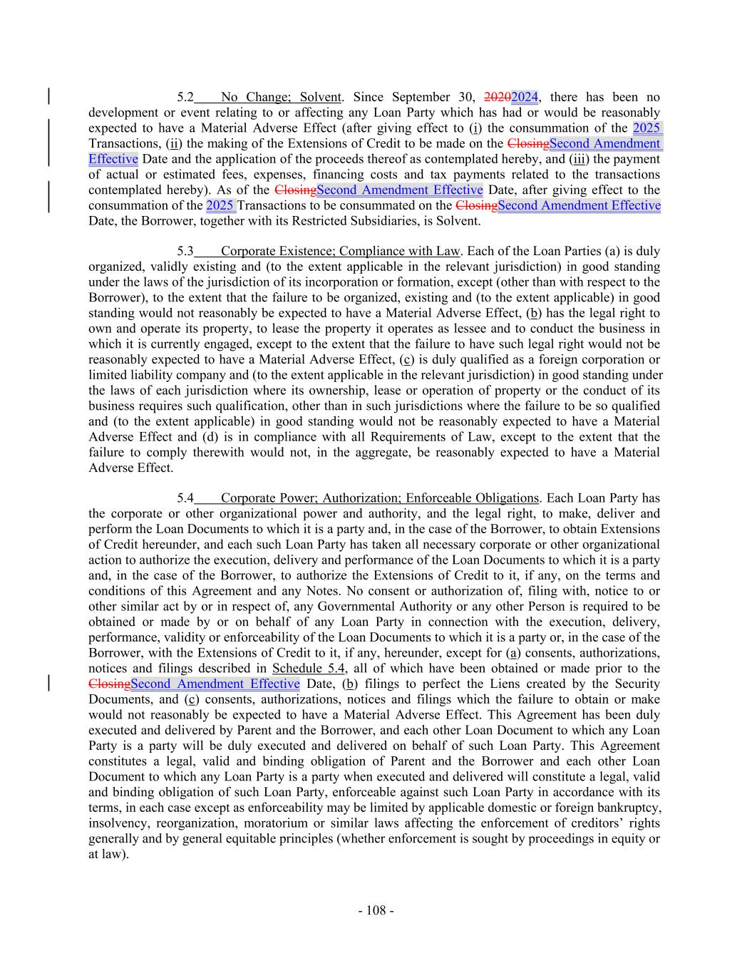 5.2 No Change; Solvent. Since September 30, 20202024, there has been no development or event relating to or affecting any Loan Party which has had or would be reasonably expected to have a Material Adverse Effect (after giving effect to (i) the consummation of the 2025 Transactions, (ii) the making of the Extensions of Credit to be made on the ClosingSecond Amendment Effective Date and the application of the proceeds thereof as contemplated hereby, and (iii) the payment of actual or estimated fees, expenses, financing costs and tax payments related to the transactions contemplated hereby). As of the ClosingSecond Amendment Effective Date, after giving effect to the consummation of the 2025 Transactions to be consummated on the ClosingSecond Amendment Effective Date, the Borrower, together with its Restricted Subsidiaries, is Solvent. 5.3 Corporate Existence; Compliance with Law. Each of the Loan Parties (a) is duly organized, validly existing and (to the extent applicable in the relevant jurisdiction) in good standing under the laws of the jurisdiction of its incorporation or formation, except (other than with respect to the Borrower), to the extent that the failure to be organized, existing and (to the extent applicable) in good standing would not reasonably be expected to have a Material Adverse Effect, (b) has the legal right to own and operate its property, to lease the property it operates as lessee and to conduct the business in which it is currently engaged, except to the extent that the failure to have such legal right would not be reasonably expected to have a Material Adverse Effect, (c) is duly qualified as a foreign corporation or limited liability company and (to the extent applicable in the relevant jurisdiction) in good standing under the laws of each jurisdiction where its ownership, lease or operation of property or the conduct of its business requires such qualification, other than in such jurisdictions where the failure to be so qualified and (to the extent applicable) in good standing would not be reasonably expected to have a Material Adverse Effect and (d) is in compliance with all Requirements of Law, except to the extent that the failure to comply therewith would not, in the aggregate, be reasonably expected to have a Material Adverse Effect. 5.4 Corporate Power; Authorization; Enforceable Obligations. Each Loan Party has the corporate or other organizational power and authority, and the legal right, to make, deliver and perform the Loan Documents to which it is a party and, in the case of the Borrower, to obtain Extensions of Credit hereunder, and each such Loan Party has taken all necessary corporate or other organizational action to authorize the execution, delivery and performance of the Loan Documents to which it is a party and, in the case of the Borrower, to authorize the Extensions of Credit to it, if any, on the terms and conditions of this Agreement and any Notes. No consent or authorization of, filing with, notice to or other similar act by or in respect of, any Governmental Authority or any other Person is required to be obtained or made by or on behalf of any Loan Party in connection with the execution, delivery, performance, validity or enforceability of the Loan Documents to which it is a party or, in the case of the Borrower, with the Extensions of Credit to it, if any, hereunder, except for (a) consents, authorizations, notices and filings described in Schedule 5.4, all of which have been obtained or made prior to the ClosingSecond Amendment Effective Date, (b) filings to perfect the Liens created by the Security Documents, and (c) consents, authorizations, notices and filings which the failure to obtain or make would not reasonably be expected to have a Material Adverse Effect. This Agreement has been duly executed and delivered by Parent and the Borrower, and each other Loan Document to which any Loan Party is a party will be duly executed and delivered on behalf of such Loan Party. This Agreement constitutes a legal, valid and binding obligation of Parent and the Borrower and each other Loan Document to which any Loan Party is a party when executed and delivered will constitute a legal, valid and binding obligation of such Loan Party, enforceable against such Loan Party in accordance with its terms, in each case except as enforceability may be limited by applicable domestic or foreign bankruptcy, insolvency, reorganization, moratorium or similar laws affecting the enforcement of creditors’ rights generally and by general equitable principles (whether enforcement is sought by proceedings in equity or at law). - 108 -