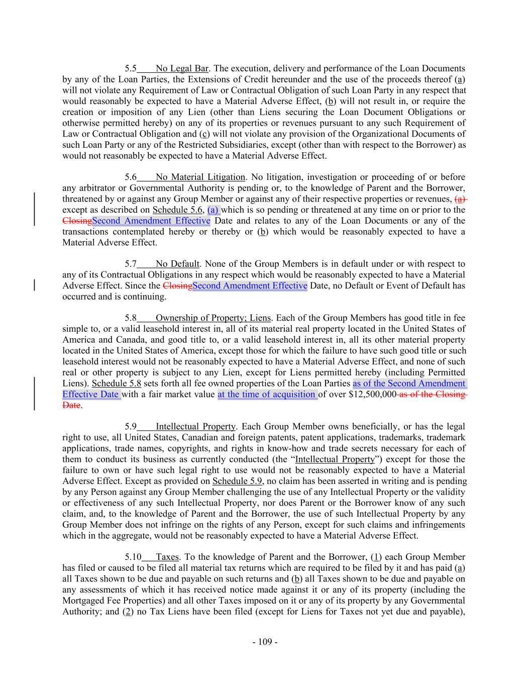 5.5 No Legal Bar. The execution, delivery and performance of the Loan Documents by any of the Loan Parties, the Extensions of Credit hereunder and the use of the proceeds thereof (a) will not violate any Requirement of Law or Contractual Obligation of such Loan Party in any respect that would reasonably be expected to have a Material Adverse Effect, (b) will not result in, or require the creation or imposition of any Lien (other than Liens securing the Loan Document Obligations or otherwise permitted hereby) on any of its properties or revenues pursuant to any such Requirement of Law or Contractual Obligation and (c) will not violate any provision of the Organizational Documents of such Loan Party or any of the Restricted Subsidiaries, except (other than with respect to the Borrower) as would not reasonably be expected to have a Material Adverse Effect. 5.6 No Material Litigation. No litigation, investigation or proceeding of or before any arbitrator or Governmental Authority is pending or, to the knowledge of Parent and the Borrower, threatened by or against any Group Member or against any of their respective properties or revenues, (a) except as described on Schedule 5.6, (a) which is so pending or threatened at any time on or prior to the ClosingSecond Amendment Effective Date and relates to any of the Loan Documents or any of the transactions contemplated hereby or thereby or (b) which would be reasonably expected to have a Material Adverse Effect. 5.7 No Default. None of the Group Members is in default under or with respect to any of its Contractual Obligations in any respect which would be reasonably expected to have a Material Adverse Effect. Since the ClosingSecond Amendment Effective Date, no Default or Event of Default has occurred and is continuing. 5.8 Ownership of Property; Liens. Each of the Group Members has good title in fee simple to, or a valid leasehold interest in, all of its material real property located in the United States of America and Canada, and good title to, or a valid leasehold interest in, all its other material property located in the United States of America, except those for which the failure to have such good title or such leasehold interest would not be reasonably expected to have a Material Adverse Effect, and none of such real or other property is subject to any Lien, except for Liens permitted hereby (including Permitted Liens). Schedule 5.8 sets forth all fee owned properties of the Loan Parties as of the Second Amendment Effective Date with a fair market value at the time of acquisition of over $12,500,000 as of the Closing Date. 5.9 Intellectual Property. Each Group Member owns beneficially, or has the legal right to use, all United States, Canadian and foreign patents, patent applications, trademarks, trademark applications, trade names, copyrights, and rights in know-how and trade secrets necessary for each of them to conduct its business as currently conducted (the “Intellectual Property”) except for those the failure to own or have such legal right to use would not be reasonably expected to have a Material Adverse Effect. Except as provided on Schedule 5.9, no claim has been asserted in writing and is pending by any Person against any Group Member challenging the use of any Intellectual Property or the validity or effectiveness of any such Intellectual Property, nor does Parent or the Borrower know of any such claim, and, to the knowledge of Parent and the Borrower, the use of such Intellectual Property by any Group Member does not infringe on the rights of any Person, except for such claims and infringements which in the aggregate, would not be reasonably expected to have a Material Adverse Effect. 5.10 Taxes. To the knowledge of Parent and the Borrower, (1) each Group Member has filed or caused to be filed all material tax returns which are required to be filed by it and has paid (a) all Taxes shown to be due and payable on such returns and (b) all Taxes shown to be due and payable on any assessments of which it has received notice made against it or any of its property (including the Mortgaged Fee Properties) and all other Taxes imposed on it or any of its property by any Governmental Authority; and (2) no Tax Liens have been filed (except for Liens for Taxes not yet due and payable), - 109 -