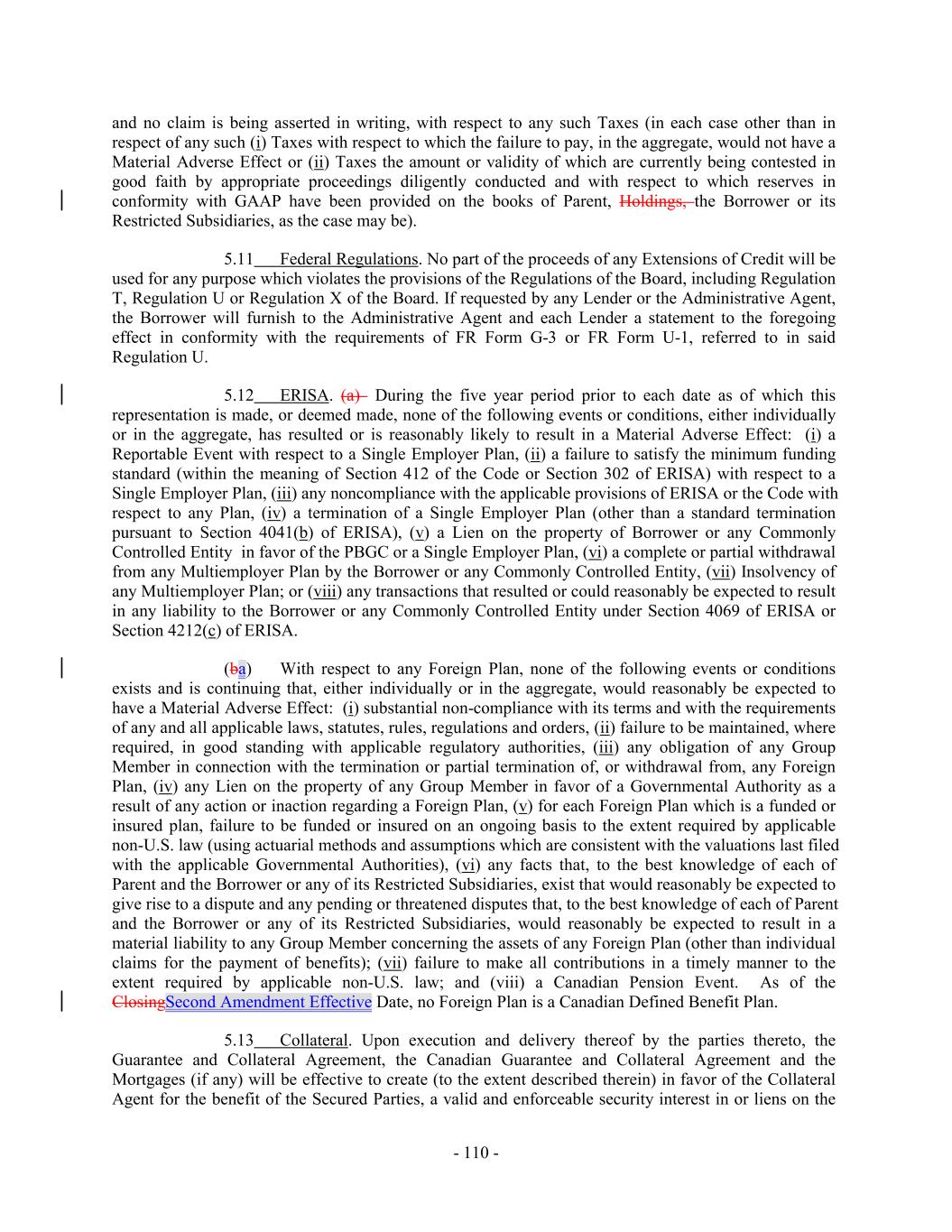and no claim is being asserted in writing, with respect to any such Taxes (in each case other than in respect of any such (i) Taxes with respect to which the failure to pay, in the aggregate, would not have a Material Adverse Effect or (ii) Taxes the amount or validity of which are currently being contested in good faith by appropriate proceedings diligently conducted and with respect to which reserves in conformity with GAAP have been provided on the books of Parent, Holdings, the Borrower or its Restricted Subsidiaries, as the case may be). 5.11 Federal Regulations. No part of the proceeds of any Extensions of Credit will be used for any purpose which violates the provisions of the Regulations of the Board, including Regulation T, Regulation U or Regulation X of the Board. If requested by any Lender or the Administrative Agent, the Borrower will furnish to the Administrative Agent and each Lender a statement to the foregoing effect in conformity with the requirements of FR Form G-3 or FR Form U-1, referred to in said Regulation U. 5.12 ERISA. (a) During the five year period prior to each date as of which this representation is made, or deemed made, none of the following events or conditions, either individually or in the aggregate, has resulted or is reasonably likely to result in a Material Adverse Effect: (i) a Reportable Event with respect to a Single Employer Plan, (ii) a failure to satisfy the minimum funding standard (within the meaning of Section 412 of the Code or Section 302 of ERISA) with respect to a Single Employer Plan, (iii) any noncompliance with the applicable provisions of ERISA or the Code with respect to any Plan, (iv) a termination of a Single Employer Plan (other than a standard termination pursuant to Section 4041(b) of ERISA), (v) a Lien on the property of Borrower or any Commonly Controlled Entity in favor of the PBGC or a Single Employer Plan, (vi) a complete or partial withdrawal from any Multiemployer Plan by the Borrower or any Commonly Controlled Entity, (vii) Insolvency of any Multiemployer Plan; or (viii) any transactions that resulted or could reasonably be expected to result in any liability to the Borrower or any Commonly Controlled Entity under Section 4069 of ERISA or Section 4212(c) of ERISA. (ba) With respect to any Foreign Plan, none of the following events or conditions exists and is continuing that, either individually or in the aggregate, would reasonably be expected to have a Material Adverse Effect: (i) substantial non-compliance with its terms and with the requirements of any and all applicable laws, statutes, rules, regulations and orders, (ii) failure to be maintained, where required, in good standing with applicable regulatory authorities, (iii) any obligation of any Group Member in connection with the termination or partial termination of, or withdrawal from, any Foreign Plan, (iv) any Lien on the property of any Group Member in favor of a Governmental Authority as a result of any action or inaction regarding a Foreign Plan, (v) for each Foreign Plan which is a funded or insured plan, failure to be funded or insured on an ongoing basis to the extent required by applicable non-U.S. law (using actuarial methods and assumptions which are consistent with the valuations last filed with the applicable Governmental Authorities), (vi) any facts that, to the best knowledge of each of Parent and the Borrower or any of its Restricted Subsidiaries, exist that would reasonably be expected to give rise to a dispute and any pending or threatened disputes that, to the best knowledge of each of Parent and the Borrower or any of its Restricted Subsidiaries, would reasonably be expected to result in a material liability to any Group Member concerning the assets of any Foreign Plan (other than individual claims for the payment of benefits); (vii) failure to make all contributions in a timely manner to the extent required by applicable non-U.S. law; and (viii) a Canadian Pension Event. As of the ClosingSecond Amendment Effective Date, no Foreign Plan is a Canadian Defined Benefit Plan. 5.13 Collateral. Upon execution and delivery thereof by the parties thereto, the Guarantee and Collateral Agreement, the Canadian Guarantee and Collateral Agreement and the Mortgages (if any) will be effective to create (to the extent described therein) in favor of the Collateral Agent for the benefit of the Secured Parties, a valid and enforceable security interest in or liens on the - 110 -