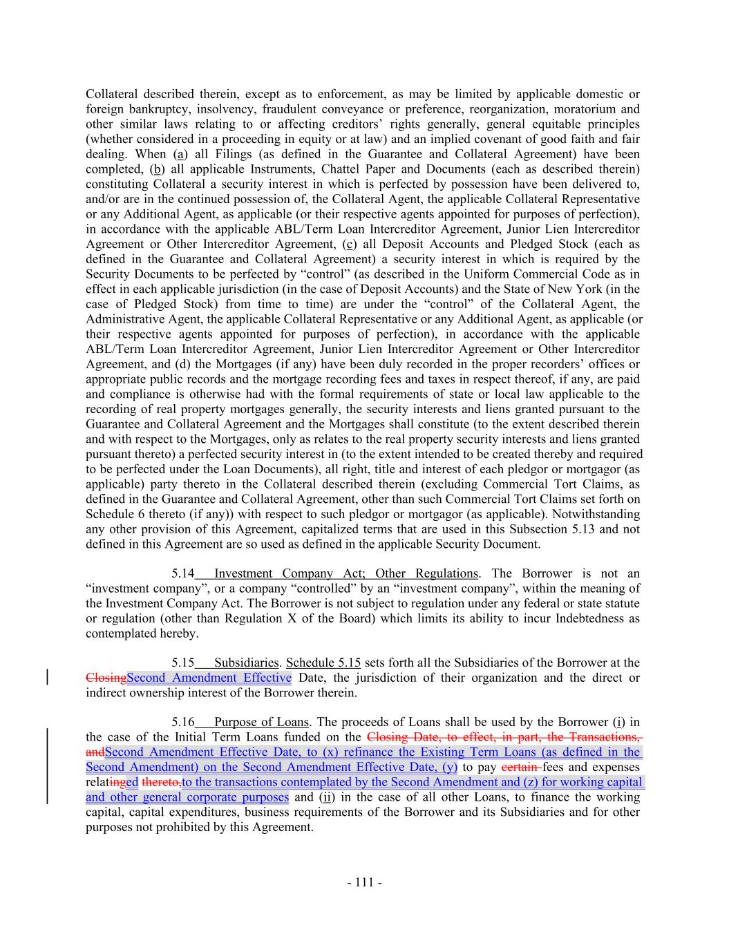 Collateral described therein, except as to enforcement, as may be limited by applicable domestic or foreign bankruptcy, insolvency, fraudulent conveyance or preference, reorganization, moratorium and other similar laws relating to or affecting creditors’ rights generally, general equitable principles (whether considered in a proceeding in equity or at law) and an implied covenant of good faith and fair dealing. When (a) all Filings (as defined in the Guarantee and Collateral Agreement) have been completed, (b) all applicable Instruments, Chattel Paper and Documents (each as described therein) constituting Collateral a security interest in which is perfected by possession have been delivered to, and/or are in the continued possession of, the Collateral Agent, the applicable Collateral Representative or any Additional Agent, as applicable (or their respective agents appointed for purposes of perfection), in accordance with the applicable ABL/Term Loan Intercreditor Agreement, Junior Lien Intercreditor Agreement or Other Intercreditor Agreement, (c) all Deposit Accounts and Pledged Stock (each as defined in the Guarantee and Collateral Agreement) a security interest in which is required by the Security Documents to be perfected by “control” (as described in the Uniform Commercial Code as in effect in each applicable jurisdiction (in the case of Deposit Accounts) and the State of New York (in the case of Pledged Stock) from time to time) are under the “control” of the Collateral Agent, the Administrative Agent, the applicable Collateral Representative or any Additional Agent, as applicable (or their respective agents appointed for purposes of perfection), in accordance with the applicable ABL/Term Loan Intercreditor Agreement, Junior Lien Intercreditor Agreement or Other Intercreditor Agreement, and (d) the Mortgages (if any) have been duly recorded in the proper recorders’ offices or appropriate public records and the mortgage recording fees and taxes in respect thereof, if any, are paid and compliance is otherwise had with the formal requirements of state or local law applicable to the recording of real property mortgages generally, the security interests and liens granted pursuant to the Guarantee and Collateral Agreement and the Mortgages shall constitute (to the extent described therein and with respect to the Mortgages, only as relates to the real property security interests and liens granted pursuant thereto) a perfected security interest in (to the extent intended to be created thereby and required to be perfected under the Loan Documents), all right, title and interest of each pledgor or mortgagor (as applicable) party thereto in the Collateral described therein (excluding Commercial Tort Claims, as defined in the Guarantee and Collateral Agreement, other than such Commercial Tort Claims set forth on Schedule 6 thereto (if any)) with respect to such pledgor or mortgagor (as applicable). Notwithstanding any other provision of this Agreement, capitalized terms that are used in this Subsection 5.13 and not defined in this Agreement are so used as defined in the applicable Security Document. 5.14 Investment Company Act; Other Regulations. The Borrower is not an “investment company”, or a company “controlled” by an “investment company”, within the meaning of the Investment Company Act. The Borrower is not subject to regulation under any federal or state statute or regulation (other than Regulation X of the Board) which limits its ability to incur Indebtedness as contemplated hereby. 5.15 Subsidiaries. Schedule 5.15 sets forth all the Subsidiaries of the Borrower at the ClosingSecond Amendment Effective Date, the jurisdiction of their organization and the direct or indirect ownership interest of the Borrower therein. 5.16 Purpose of Loans. The proceeds of Loans shall be used by the Borrower (i) in the case of the Initial Term Loans funded on the Closing Date, to effect, in part, the Transactions, andSecond Amendment Effective Date, to (x) refinance the Existing Term Loans (as defined in the Second Amendment) on the Second Amendment Effective Date, (y) to pay certain fees and expenses relatinged thereto,to the transactions contemplated by the Second Amendment and (z) for working capital and other general corporate purposes and (ii) in the case of all other Loans, to finance the working capital, capital expenditures, business requirements of the Borrower and its Subsidiaries and for other purposes not prohibited by this Agreement. - 111 -