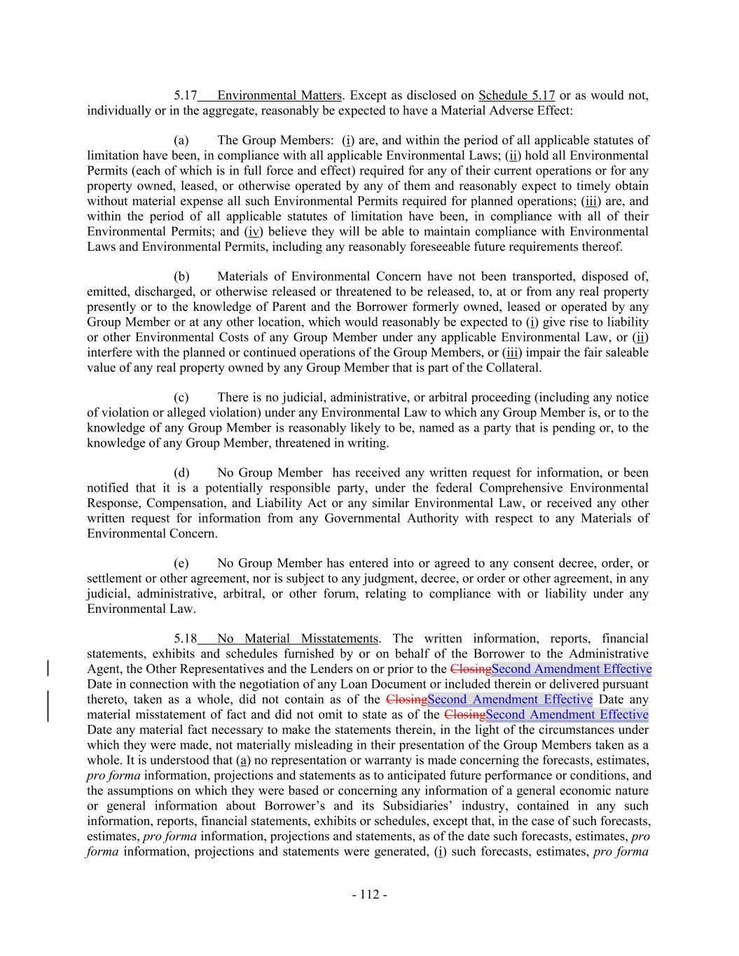 5.17 Environmental Matters. Except as disclosed on Schedule 5.17 or as would not, individually or in the aggregate, reasonably be expected to have a Material Adverse Effect: (a) The Group Members: (i) are, and within the period of all applicable statutes of limitation have been, in compliance with all applicable Environmental Laws; (ii) hold all Environmental Permits (each of which is in full force and effect) required for any of their current operations or for any property owned, leased, or otherwise operated by any of them and reasonably expect to timely obtain without material expense all such Environmental Permits required for planned operations; (iii) are, and within the period of all applicable statutes of limitation have been, in compliance with all of their Environmental Permits; and (iv) believe they will be able to maintain compliance with Environmental Laws and Environmental Permits, including any reasonably foreseeable future requirements thereof. (b) Materials of Environmental Concern have not been transported, disposed of, emitted, discharged, or otherwise released or threatened to be released, to, at or from any real property presently or to the knowledge of Parent and the Borrower formerly owned, leased or operated by any Group Member or at any other location, which would reasonably be expected to (i) give rise to liability or other Environmental Costs of any Group Member under any applicable Environmental Law, or (ii) interfere with the planned or continued operations of the Group Members, or (iii) impair the fair saleable value of any real property owned by any Group Member that is part of the Collateral. (c) There is no judicial, administrative, or arbitral proceeding (including any notice of violation or alleged violation) under any Environmental Law to which any Group Member is, or to the knowledge of any Group Member is reasonably likely to be, named as a party that is pending or, to the knowledge of any Group Member, threatened in writing. (d) No Group Member has received any written request for information, or been notified that it is a potentially responsible party, under the federal Comprehensive Environmental Response, Compensation, and Liability Act or any similar Environmental Law, or received any other written request for information from any Governmental Authority with respect to any Materials of Environmental Concern. (e) No Group Member has entered into or agreed to any consent decree, order, or settlement or other agreement, nor is subject to any judgment, decree, or order or other agreement, in any judicial, administrative, arbitral, or other forum, relating to compliance with or liability under any Environmental Law. 5.18 No Material Misstatements. The written information, reports, financial statements, exhibits and schedules furnished by or on behalf of the Borrower to the Administrative Agent, the Other Representatives and the Lenders on or prior to the ClosingSecond Amendment Effective Date in connection with the negotiation of any Loan Document or included therein or delivered pursuant thereto, taken as a whole, did not contain as of the ClosingSecond Amendment Effective Date any material misstatement of fact and did not omit to state as of the ClosingSecond Amendment Effective Date any material fact necessary to make the statements therein, in the light of the circumstances under which they were made, not materially misleading in their presentation of the Group Members taken as a whole. It is understood that (a) no representation or warranty is made concerning the forecasts, estimates, pro forma information, projections and statements as to anticipated future performance or conditions, and the assumptions on which they were based or concerning any information of a general economic nature or general information about Borrower’s and its Subsidiaries’ industry, contained in any such information, reports, financial statements, exhibits or schedules, except that, in the case of such forecasts, estimates, pro forma information, projections and statements, as of the date such forecasts, estimates, pro forma information, projections and statements were generated, (i) such forecasts, estimates, pro forma - 112 -