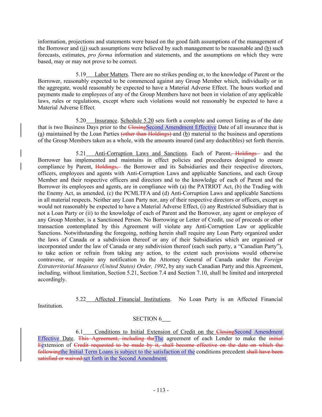 information, projections and statements were based on the good faith assumptions of the management of the Borrower and (ii) such assumptions were believed by such management to be reasonable and (b) such forecasts, estimates, pro forma information and statements, and the assumptions on which they were based, may or may not prove to be correct. 5.19 Labor Matters. There are no strikes pending or, to the knowledge of Parent or the Borrower, reasonably expected to be commenced against any Group Member which, individually or in the aggregate, would reasonably be expected to have a Material Adverse Effect. The hours worked and payments made to employees of any of the Group Members have not been in violation of any applicable laws, rules or regulations, except where such violations would not reasonably be expected to have a Material Adverse Effect. 5.20 Insurance. Schedule 5.20 sets forth a complete and correct listing as of the date that is two Business Days prior to the ClosingSecond Amendment Effective Date of all insurance that is (a) maintained by the Loan Parties (other than Holdings) and (b) material to the business and operations of the Group Members taken as a whole, with the amounts insured (and any deductibles) set forth therein. 5.21 Anti-Corruption Laws and Sanctions. Each of Parent, Holdings and the Borrower has implemented and maintains in effect policies and procedures designed to ensure compliance by Parent, Holdings, the Borrower and its Subsidiaries and their respective directors, officers, employees and agents with Anti-Corruption Laws and applicable Sanctions, and each Group Member and their respective officers and directors and to the knowledge of each of Parent and the Borrower its employees and agents, are in compliance with (a) the PATRIOT Act, (b) the Trading with the Enemy Act, as amended, (c) the PCMLTFA and (d) Anti-Corruption Laws and applicable Sanctions in all material respects. Neither any Loan Party nor, any of their respective directors or officers, except as would not reasonably be expected to have a Material Adverse Effect, (i) any Restricted Subsidiary that is not a Loan Party or (ii) to the knowledge of each of Parent and the Borrower, any agent or employee of any Group Member, is a Sanctioned Person. No Borrowing or Letter of Credit, use of proceeds or other transaction contemplated by this Agreement will violate any Anti-Corruption Law or applicable Sanctions. Notwithstanding the foregoing, nothing herein shall require any Loan Party organized under the laws of Canada or a subdivision thereof or any of their Subsidiaries which are organized or incorporated under the law of Canada or any subdivision thereof (each such party, a “Canadian Party”), to take action or refrain from taking any action, to the extent such provisions would otherwise contravene, or require any notification to the Attorney General of Canada under the Foreign Extraterritorial Measures (United States) Order, 1992, by any such Canadian Party and this Agreement, including, without limitation, Section 5.21, Section 7.4 and Section 7.10, shall be limited and interpreted accordingly. 5.22 Affected Financial Institutions. No Loan Party is an Affected Financial Institution. SECTION 6 6.1 Conditions to Initial Extension of Credit on the ClosingSecond Amendment Effective Date. This Agreement, including theThe agreement of each Lender to make the initial Eextension of Credit requested to be made by it, shall become effective on the date on which the followingthe Initial Term Loans is subject to the satisfaction of the conditions precedent shall have been satisfied or waived:set forth in the Second Amendment. - 113 -