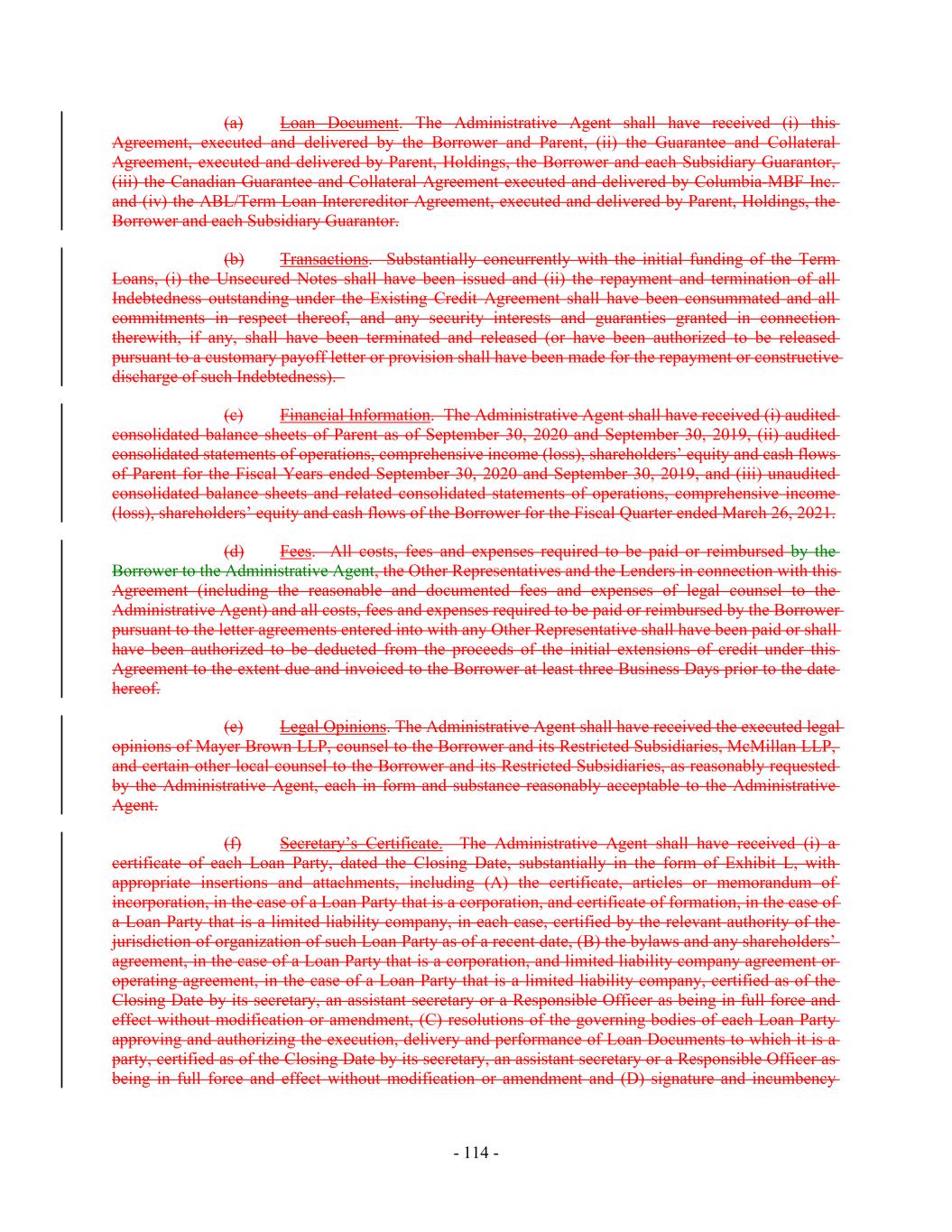 (a) Loan Document. The Administrative Agent shall have received (i) this Agreement, executed and delivered by the Borrower and Parent, (ii) the Guarantee and Collateral Agreement, executed and delivered by Parent, Holdings, the Borrower and each Subsidiary Guarantor, (iii) the Canadian Guarantee and Collateral Agreement executed and delivered by Columbia-MBF Inc. and (iv) the ABL/Term Loan Intercreditor Agreement, executed and delivered by Parent, Holdings, the Borrower and each Subsidiary Guarantor. (b) Transactions. Substantially concurrently with the initial funding of the Term Loans, (i) the Unsecured Notes shall have been issued and (ii) the repayment and termination of all Indebtedness outstanding under the Existing Credit Agreement shall have been consummated and all commitments in respect thereof, and any security interests and guaranties granted in connection therewith, if any, shall have been terminated and released (or have been authorized to be released pursuant to a customary payoff letter or provision shall have been made for the repayment or constructive discharge of such Indebtedness). (c) Financial Information. The Administrative Agent shall have received (i) audited consolidated balance sheets of Parent as of September 30, 2020 and September 30, 2019, (ii) audited consolidated statements of operations, comprehensive income (loss), shareholders’ equity and cash flows of Parent for the Fiscal Years ended September 30, 2020 and September 30, 2019, and (iii) unaudited consolidated balance sheets and related consolidated statements of operations, comprehensive income (loss), shareholders’ equity and cash flows of the Borrower for the Fiscal Quarter ended March 26, 2021. (d) Fees. All costs, fees and expenses required to be paid or reimbursed by the Borrower to the Administrative Agent, the Other Representatives and the Lenders in connection with this Agreement (including the reasonable and documented fees and expenses of legal counsel to the Administrative Agent) and all costs, fees and expenses required to be paid or reimbursed by the Borrower pursuant to the letter agreements entered into with any Other Representative shall have been paid or shall have been authorized to be deducted from the proceeds of the initial extensions of credit under this Agreement to the extent due and invoiced to the Borrower at least three Business Days prior to the date hereof. (e) Legal Opinions. The Administrative Agent shall have received the executed legal opinions of Mayer Brown LLP, counsel to the Borrower and its Restricted Subsidiaries, McMillan LLP, and certain other local counsel to the Borrower and its Restricted Subsidiaries, as reasonably requested by the Administrative Agent, each in form and substance reasonably acceptable to the Administrative Agent. (f) Secretary’s Certificate. The Administrative Agent shall have received (i) a certificate of each Loan Party, dated the Closing Date, substantially in the form of Exhibit L, with appropriate insertions and attachments, including (A) the certificate, articles or memorandum of incorporation, in the case of a Loan Party that is a corporation, and certificate of formation, in the case of a Loan Party that is a limited liability company, in each case, certified by the relevant authority of the jurisdiction of organization of such Loan Party as of a recent date, (B) the bylaws and any shareholders’ agreement, in the case of a Loan Party that is a corporation, and limited liability company agreement or operating agreement, in the case of a Loan Party that is a limited liability company, certified as of the Closing Date by its secretary, an assistant secretary or a Responsible Officer as being in full force and effect without modification or amendment, (C) resolutions of the governing bodies of each Loan Party approving and authorizing the execution, delivery and performance of Loan Documents to which it is a party, certified as of the Closing Date by its secretary, an assistant secretary or a Responsible Officer as being in full force and effect without modification or amendment and (D) signature and incumbency - 114 -