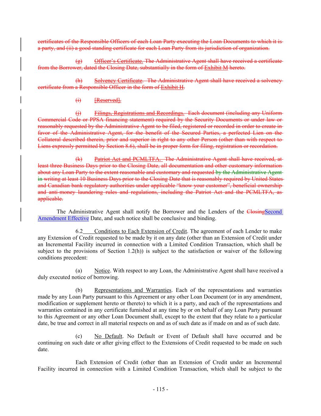 certificates of the Responsible Officers of each Loan Party executing the Loan Documents to which it is a party, and (ii) a good standing certificate for each Loan Party from its jurisdiction of organization. (g) Officer’s Certificate. The Administrative Agent shall have received a certificate from the Borrower, dated the Closing Date, substantially in the form of Exhibit M hereto. (h) Solvency Certificate. The Administrative Agent shall have received a solvency certificate from a Responsible Officer in the form of Exhibit H. (i) [Reserved]. (j) Filings, Registrations and Recordings. Each document (including any Uniform Commercial Code or PPSA financing statement) required by the Security Documents or under law or reasonably requested by the Administrative Agent to be filed, registered or recorded in order to create in favor of the Administrative Agent, for the benefit of the Secured Parties, a perfected Lien on the Collateral described therein, prior and superior in right to any other Person (other than with respect to Liens expressly permitted by Section 8.6), shall be in proper form for filing, registration or recordation. (k) Patriot Act and PCMLTFA. The Administrative Agent shall have received, at least three Business Days prior to the Closing Date, all documentation and other customary information about any Loan Party to the extent reasonable and customary and requested by the Administrative Agent in writing at least 10 Business Days prior to the Closing Date that is reasonably required by United States and Canadian bank regulatory authorities under applicable “know your customer”, beneficial ownership and anti-money laundering rules and regulations, including the Patriot Act and the PCMLTFA, as applicable. The Administrative Agent shall notify the Borrower and the Lenders of the ClosingSecond Amendment Effective Date, and such notice shall be conclusive and binding. 6.2 Conditions to Each Extension of Credit. The agreement of each Lender to make any Extension of Credit requested to be made by it on any date (other than an Extension of Credit under an Incremental Facility incurred in connection with a Limited Condition Transaction, which shall be subject to the provisions of Section 1.2(h)) is subject to the satisfaction or waiver of the following conditions precedent: (a) Notice. With respect to any Loan, the Administrative Agent shall have received a duly executed notice of borrowing. (b) Representations and Warranties. Each of the representations and warranties made by any Loan Party pursuant to this Agreement or any other Loan Document (or in any amendment, modification or supplement hereto or thereto) to which it is a party, and each of the representations and warranties contained in any certificate furnished at any time by or on behalf of any Loan Party pursuant to this Agreement or any other Loan Document shall, except to the extent that they relate to a particular date, be true and correct in all material respects on and as of such date as if made on and as of such date. (c) No Default. No Default or Event of Default shall have occurred and be continuing on such date or after giving effect to the Extensions of Credit requested to be made on such date. Each Extension of Credit (other than an Extension of Credit under an Incremental Facility incurred in connection with a Limited Condition Transaction, which shall be subject to the - 115 -