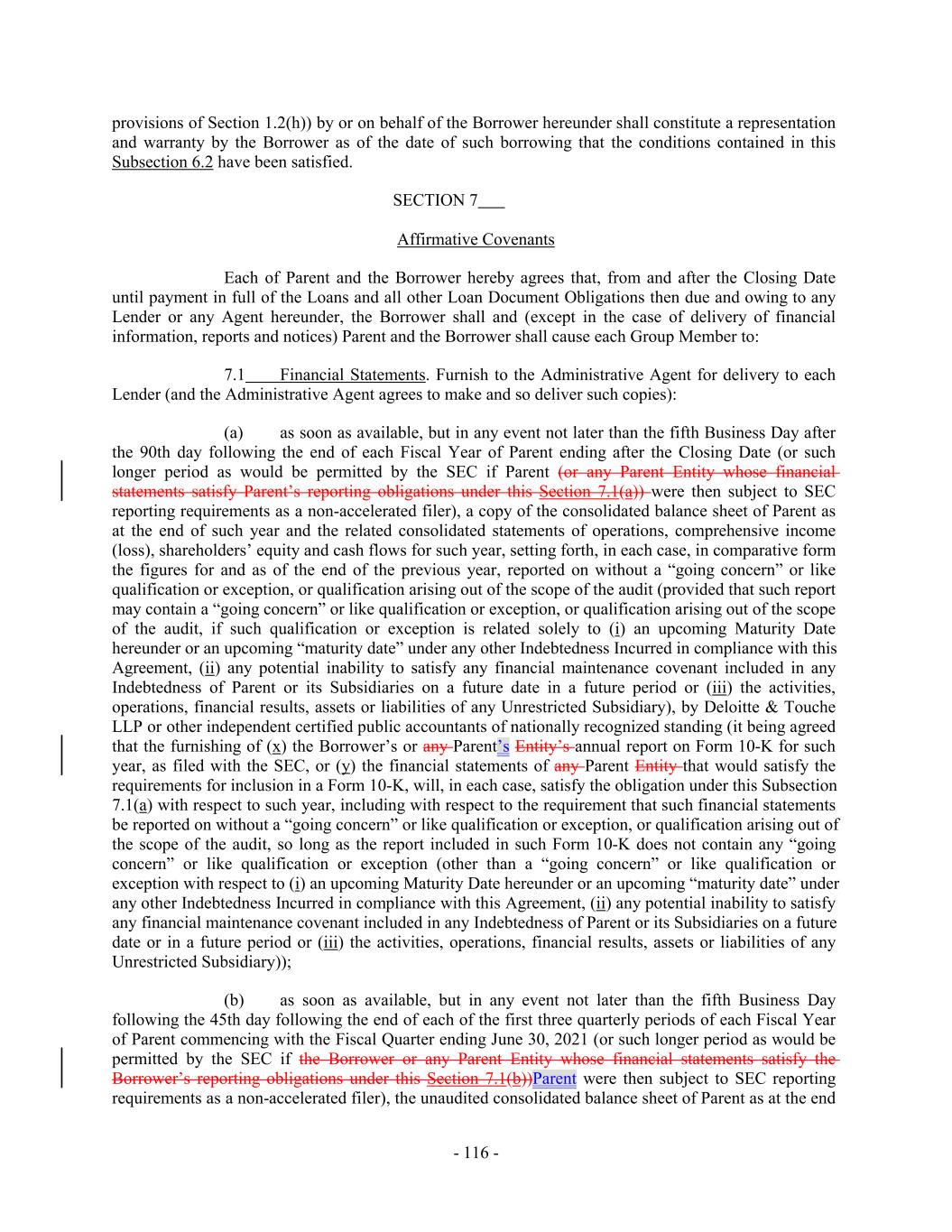 provisions of Section 1.2(h)) by or on behalf of the Borrower hereunder shall constitute a representation and warranty by the Borrower as of the date of such borrowing that the conditions contained in this Subsection 6.2 have been satisfied. SECTION 7 Affirmative Covenants Each of Parent and the Borrower hereby agrees that, from and after the Closing Date until payment in full of the Loans and all other Loan Document Obligations then due and owing to any Lender or any Agent hereunder, the Borrower shall and (except in the case of delivery of financial information, reports and notices) Parent and the Borrower shall cause each Group Member to: 7.1 Financial Statements. Furnish to the Administrative Agent for delivery to each Lender (and the Administrative Agent agrees to make and so deliver such copies): (a) as soon as available, but in any event not later than the fifth Business Day after the 90th day following the end of each Fiscal Year of Parent ending after the Closing Date (or such longer period as would be permitted by the SEC if Parent (or any Parent Entity whose financial statements satisfy Parent’s reporting obligations under this Section 7.1(a)) were then subject to SEC reporting requirements as a non-accelerated filer), a copy of the consolidated balance sheet of Parent as at the end of such year and the related consolidated statements of operations, comprehensive income (loss), shareholders’ equity and cash flows for such year, setting forth, in each case, in comparative form the figures for and as of the end of the previous year, reported on without a “going concern” or like qualification or exception, or qualification arising out of the scope of the audit (provided that such report may contain a “going concern” or like qualification or exception, or qualification arising out of the scope of the audit, if such qualification or exception is related solely to (i) an upcoming Maturity Date hereunder or an upcoming “maturity date” under any other Indebtedness Incurred in compliance with this Agreement, (ii) any potential inability to satisfy any financial maintenance covenant included in any Indebtedness of Parent or its Subsidiaries on a future date in a future period or (iii) the activities, operations, financial results, assets or liabilities of any Unrestricted Subsidiary), by Deloitte & Touche LLP or other independent certified public accountants of nationally recognized standing (it being agreed that the furnishing of (x) the Borrower’s or any Parent’s Entity’s annual report on Form 10-K for such year, as filed with the SEC, or (y) the financial statements of any Parent Entity that would satisfy the requirements for inclusion in a Form 10-K, will, in each case, satisfy the obligation under this Subsection 7.1(a) with respect to such year, including with respect to the requirement that such financial statements be reported on without a “going concern” or like qualification or exception, or qualification arising out of the scope of the audit, so long as the report included in such Form 10-K does not contain any “going concern” or like qualification or exception (other than a “going concern” or like qualification or exception with respect to (i) an upcoming Maturity Date hereunder or an upcoming “maturity date” under any other Indebtedness Incurred in compliance with this Agreement, (ii) any potential inability to satisfy any financial maintenance covenant included in any Indebtedness of Parent or its Subsidiaries on a future date or in a future period or (iii) the activities, operations, financial results, assets or liabilities of any Unrestricted Subsidiary)); (b) as soon as available, but in any event not later than the fifth Business Day following the 45th day following the end of each of the first three quarterly periods of each Fiscal Year of Parent commencing with the Fiscal Quarter ending June 30, 2021 (or such longer period as would be permitted by the SEC if the Borrower or any Parent Entity whose financial statements satisfy the Borrower’s reporting obligations under this Section 7.1(b))Parent were then subject to SEC reporting requirements as a non-accelerated filer), the unaudited consolidated balance sheet of Parent as at the end - 116 -