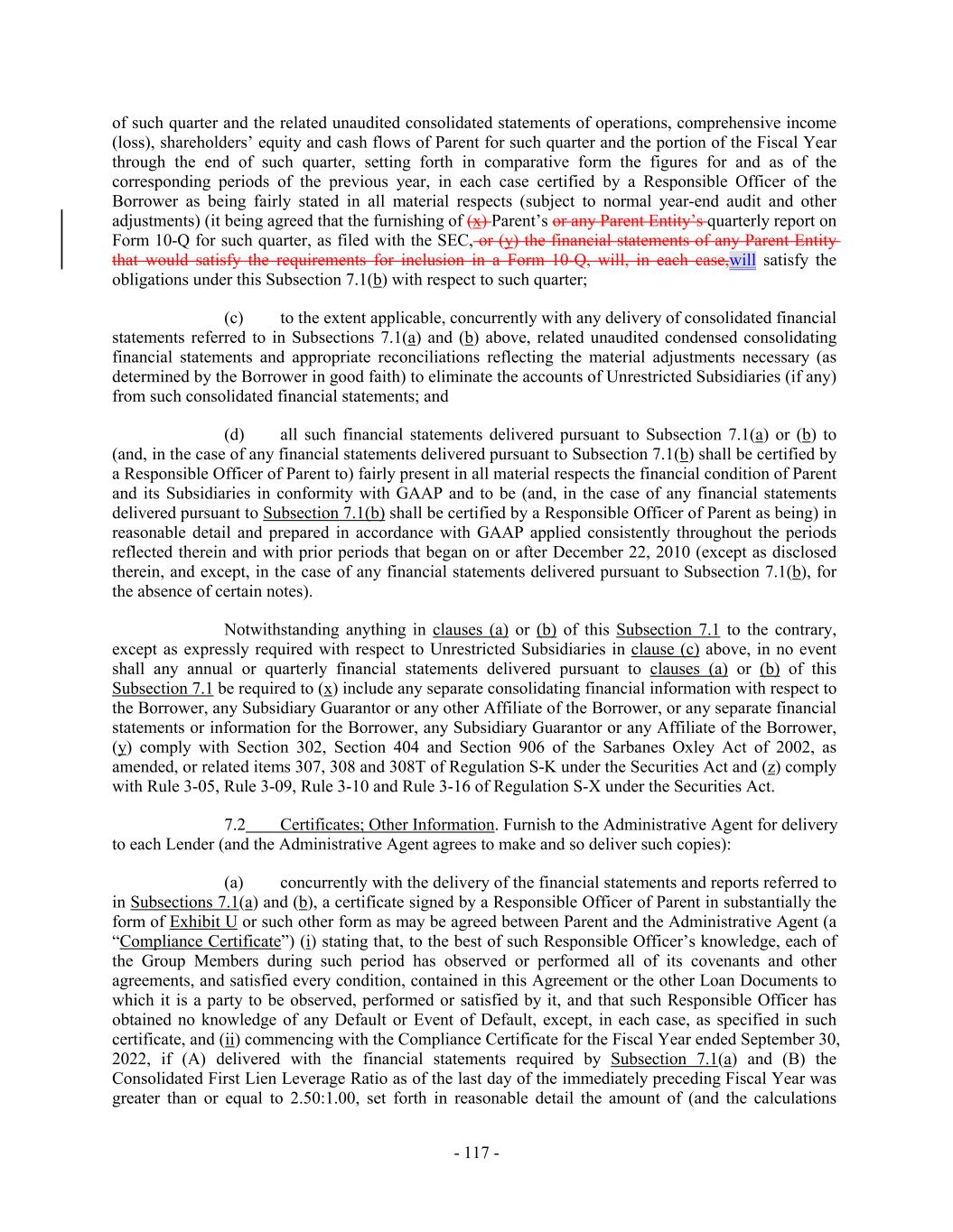 of such quarter and the related unaudited consolidated statements of operations, comprehensive income (loss), shareholders’ equity and cash flows of Parent for such quarter and the portion of the Fiscal Year through the end of such quarter, setting forth in comparative form the figures for and as of the corresponding periods of the previous year, in each case certified by a Responsible Officer of the Borrower as being fairly stated in all material respects (subject to normal year-end audit and other adjustments) (it being agreed that the furnishing of (x) Parent’s or any Parent Entity’s quarterly report on Form 10-Q for such quarter, as filed with the SEC, or (y) the financial statements of any Parent Entity that would satisfy the requirements for inclusion in a Form 10-Q, will, in each case,will satisfy the obligations under this Subsection 7.1(b) with respect to such quarter; (c) to the extent applicable, concurrently with any delivery of consolidated financial statements referred to in Subsections 7.1(a) and (b) above, related unaudited condensed consolidating financial statements and appropriate reconciliations reflecting the material adjustments necessary (as determined by the Borrower in good faith) to eliminate the accounts of Unrestricted Subsidiaries (if any) from such consolidated financial statements; and (d) all such financial statements delivered pursuant to Subsection 7.1(a) or (b) to (and, in the case of any financial statements delivered pursuant to Subsection 7.1(b) shall be certified by a Responsible Officer of Parent to) fairly present in all material respects the financial condition of Parent and its Subsidiaries in conformity with GAAP and to be (and, in the case of any financial statements delivered pursuant to Subsection 7.1(b) shall be certified by a Responsible Officer of Parent as being) in reasonable detail and prepared in accordance with GAAP applied consistently throughout the periods reflected therein and with prior periods that began on or after December 22, 2010 (except as disclosed therein, and except, in the case of any financial statements delivered pursuant to Subsection 7.1(b), for the absence of certain notes). Notwithstanding anything in clauses (a) or (b) of this Subsection 7.1 to the contrary, except as expressly required with respect to Unrestricted Subsidiaries in clause (c) above, in no event shall any annual or quarterly financial statements delivered pursuant to clauses (a) or (b) of this Subsection 7.1 be required to (x) include any separate consolidating financial information with respect to the Borrower, any Subsidiary Guarantor or any other Affiliate of the Borrower, or any separate financial statements or information for the Borrower, any Subsidiary Guarantor or any Affiliate of the Borrower, (y) comply with Section 302, Section 404 and Section 906 of the Sarbanes Oxley Act of 2002, as amended, or related items 307, 308 and 308T of Regulation S-K under the Securities Act and (z) comply with Rule 3-05, Rule 3-09, Rule 3-10 and Rule 3-16 of Regulation S-X under the Securities Act. 7.2 Certificates; Other Information. Furnish to the Administrative Agent for delivery to each Lender (and the Administrative Agent agrees to make and so deliver such copies): (a) concurrently with the delivery of the financial statements and reports referred to in Subsections 7.1(a) and (b), a certificate signed by a Responsible Officer of Parent in substantially the form of Exhibit U or such other form as may be agreed between Parent and the Administrative Agent (a “Compliance Certificate”) (i) stating that, to the best of such Responsible Officer’s knowledge, each of the Group Members during such period has observed or performed all of its covenants and other agreements, and satisfied every condition, contained in this Agreement or the other Loan Documents to which it is a party to be observed, performed or satisfied by it, and that such Responsible Officer has obtained no knowledge of any Default or Event of Default, except, in each case, as specified in such certificate, and (ii) commencing with the Compliance Certificate for the Fiscal Year ended September 30, 2022, if (A) delivered with the financial statements required by Subsection 7.1(a) and (B) the Consolidated First Lien Leverage Ratio as of the last day of the immediately preceding Fiscal Year was greater than or equal to 2.50:1.00, set forth in reasonable detail the amount of (and the calculations - 117 -
