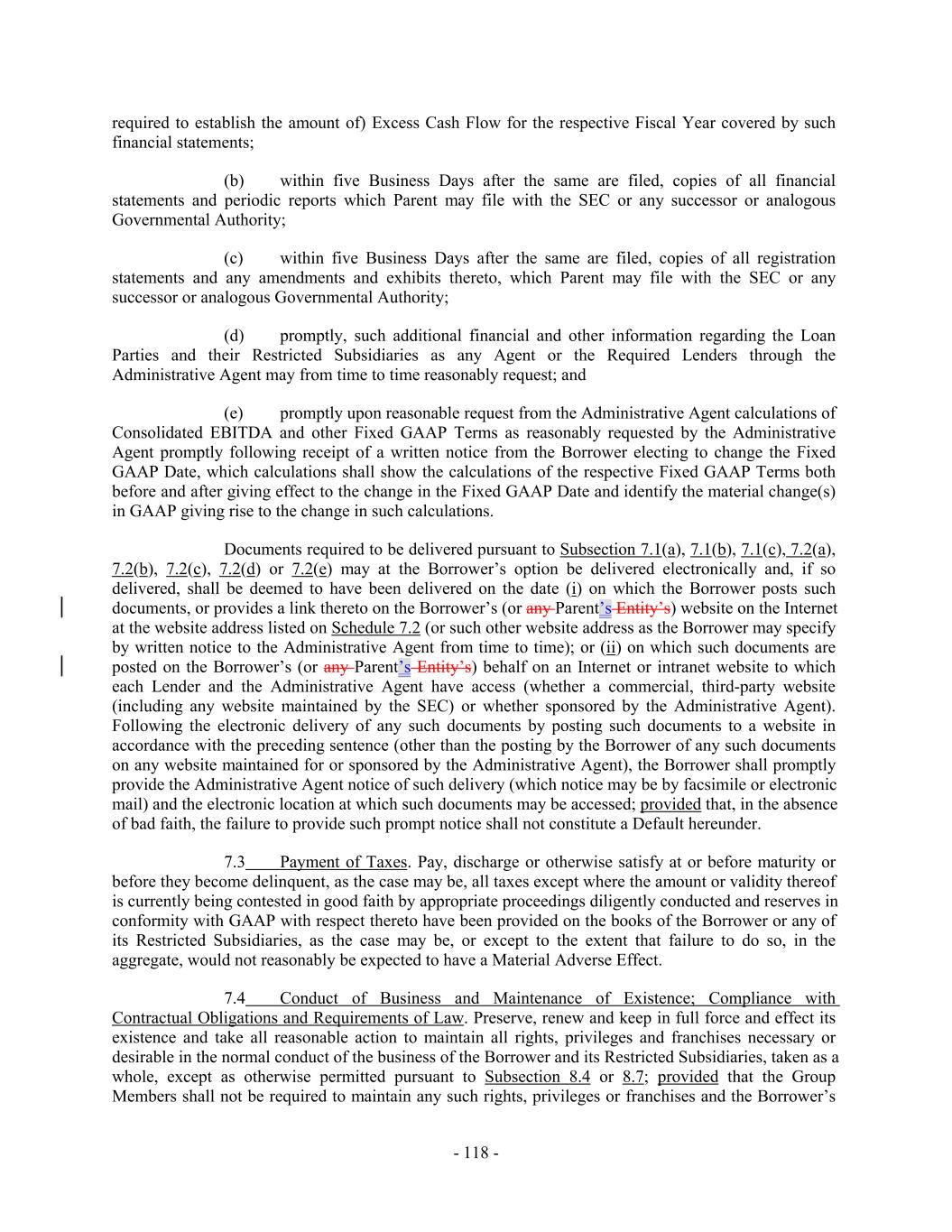 required to establish the amount of) Excess Cash Flow for the respective Fiscal Year covered by such financial statements; (b) within five Business Days after the same are filed, copies of all financial statements and periodic reports which Parent may file with the SEC or any successor or analogous Governmental Authority; (c) within five Business Days after the same are filed, copies of all registration statements and any amendments and exhibits thereto, which Parent may file with the SEC or any successor or analogous Governmental Authority; (d) promptly, such additional financial and other information regarding the Loan Parties and their Restricted Subsidiaries as any Agent or the Required Lenders through the Administrative Agent may from time to time reasonably request; and (e) promptly upon reasonable request from the Administrative Agent calculations of Consolidated EBITDA and other Fixed GAAP Terms as reasonably requested by the Administrative Agent promptly following receipt of a written notice from the Borrower electing to change the Fixed GAAP Date, which calculations shall show the calculations of the respective Fixed GAAP Terms both before and after giving effect to the change in the Fixed GAAP Date and identify the material change(s) in GAAP giving rise to the change in such calculations. Documents required to be delivered pursuant to Subsection 7.1(a), 7.1(b), 7.1(c), 7.2(a), 7.2(b), 7.2(c), 7.2(d) or 7.2(e) may at the Borrower’s option be delivered electronically and, if so delivered, shall be deemed to have been delivered on the date (i) on which the Borrower posts such documents, or provides a link thereto on the Borrower’s (or any Parent’s Entity’s) website on the Internet at the website address listed on Schedule 7.2 (or such other website address as the Borrower may specify by written notice to the Administrative Agent from time to time); or (ii) on which such documents are posted on the Borrower’s (or any Parent’s Entity’s) behalf on an Internet or intranet website to which each Lender and the Administrative Agent have access (whether a commercial, third-party website (including any website maintained by the SEC) or whether sponsored by the Administrative Agent). Following the electronic delivery of any such documents by posting such documents to a website in accordance with the preceding sentence (other than the posting by the Borrower of any such documents on any website maintained for or sponsored by the Administrative Agent), the Borrower shall promptly provide the Administrative Agent notice of such delivery (which notice may be by facsimile or electronic mail) and the electronic location at which such documents may be accessed; provided that, in the absence of bad faith, the failure to provide such prompt notice shall not constitute a Default hereunder. 7.3 Payment of Taxes. Pay, discharge or otherwise satisfy at or before maturity or before they become delinquent, as the case may be, all taxes except where the amount or validity thereof is currently being contested in good faith by appropriate proceedings diligently conducted and reserves in conformity with GAAP with respect thereto have been provided on the books of the Borrower or any of its Restricted Subsidiaries, as the case may be, or except to the extent that failure to do so, in the aggregate, would not reasonably be expected to have a Material Adverse Effect. 7.4 Conduct of Business and Maintenance of Existence; Compliance with Contractual Obligations and Requirements of Law. Preserve, renew and keep in full force and effect its existence and take all reasonable action to maintain all rights, privileges and franchises necessary or desirable in the normal conduct of the business of the Borrower and its Restricted Subsidiaries, taken as a whole, except as otherwise permitted pursuant to Subsection 8.4 or 8.7; provided that the Group Members shall not be required to maintain any such rights, privileges or franchises and the Borrower’s - 118 -
