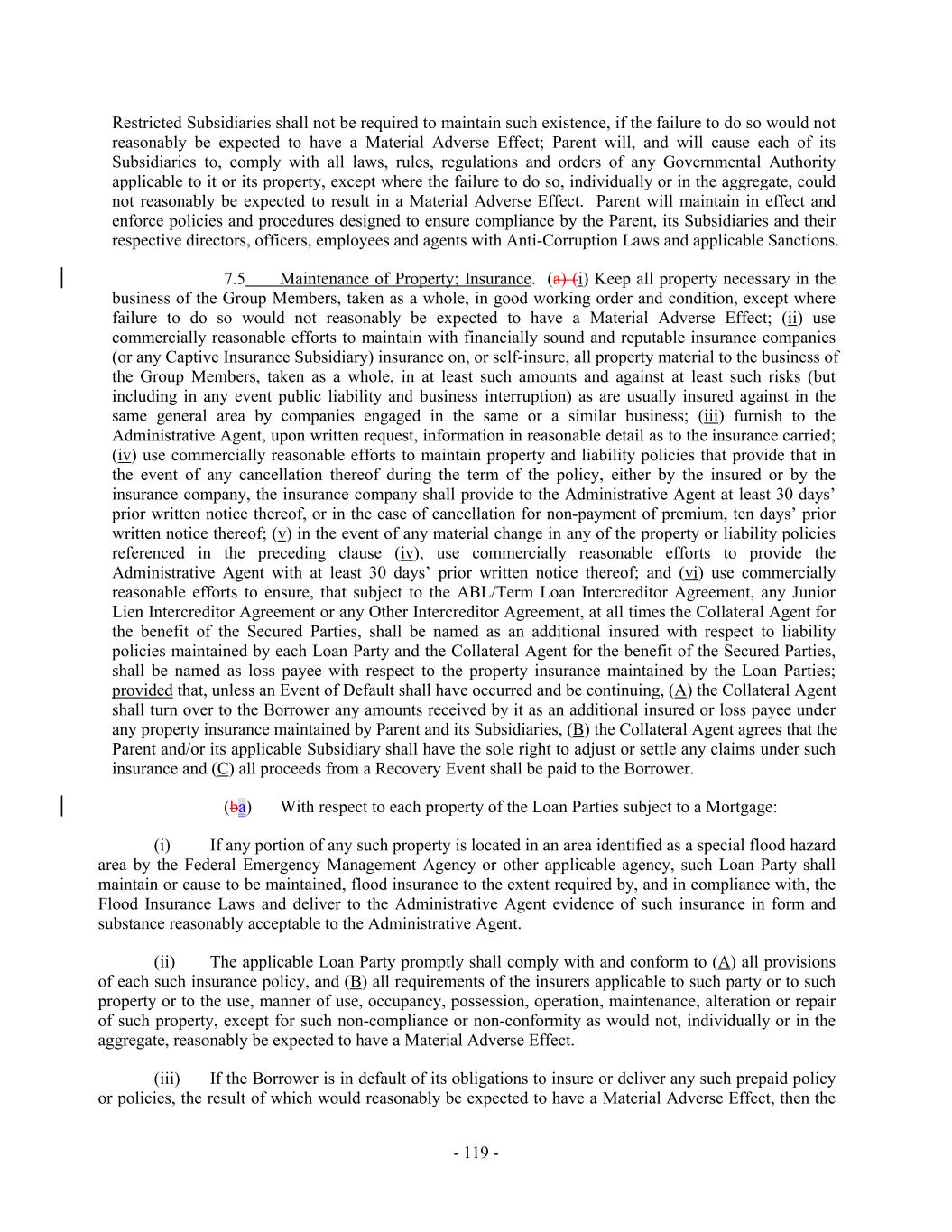 Restricted Subsidiaries shall not be required to maintain such existence, if the failure to do so would not reasonably be expected to have a Material Adverse Effect; Parent will, and will cause each of its Subsidiaries to, comply with all laws, rules, regulations and orders of any Governmental Authority applicable to it or its property, except where the failure to do so, individually or in the aggregate, could not reasonably be expected to result in a Material Adverse Effect. Parent will maintain in effect and enforce policies and procedures designed to ensure compliance by the Parent, its Subsidiaries and their respective directors, officers, employees and agents with Anti-Corruption Laws and applicable Sanctions. 7.5 Maintenance of Property; Insurance. (a) (i) Keep all property necessary in the business of the Group Members, taken as a whole, in good working order and condition, except where failure to do so would not reasonably be expected to have a Material Adverse Effect; (ii) use commercially reasonable efforts to maintain with financially sound and reputable insurance companies (or any Captive Insurance Subsidiary) insurance on, or self-insure, all property material to the business of the Group Members, taken as a whole, in at least such amounts and against at least such risks (but including in any event public liability and business interruption) as are usually insured against in the same general area by companies engaged in the same or a similar business; (iii) furnish to the Administrative Agent, upon written request, information in reasonable detail as to the insurance carried; (iv) use commercially reasonable efforts to maintain property and liability policies that provide that in the event of any cancellation thereof during the term of the policy, either by the insured or by the insurance company, the insurance company shall provide to the Administrative Agent at least 30 days’ prior written notice thereof, or in the case of cancellation for non-payment of premium, ten days’ prior written notice thereof; (v) in the event of any material change in any of the property or liability policies referenced in the preceding clause (iv), use commercially reasonable efforts to provide the Administrative Agent with at least 30 days’ prior written notice thereof; and (vi) use commercially reasonable efforts to ensure, that subject to the ABL/Term Loan Intercreditor Agreement, any Junior Lien Intercreditor Agreement or any Other Intercreditor Agreement, at all times the Collateral Agent for the benefit of the Secured Parties, shall be named as an additional insured with respect to liability policies maintained by each Loan Party and the Collateral Agent for the benefit of the Secured Parties, shall be named as loss payee with respect to the property insurance maintained by the Loan Parties; provided that, unless an Event of Default shall have occurred and be continuing, (A) the Collateral Agent shall turn over to the Borrower any amounts received by it as an additional insured or loss payee under any property insurance maintained by Parent and its Subsidiaries, (B) the Collateral Agent agrees that the Parent and/or its applicable Subsidiary shall have the sole right to adjust or settle any claims under such insurance and (C) all proceeds from a Recovery Event shall be paid to the Borrower. (ba) With respect to each property of the Loan Parties subject to a Mortgage: (i) If any portion of any such property is located in an area identified as a special flood hazard area by the Federal Emergency Management Agency or other applicable agency, such Loan Party shall maintain or cause to be maintained, flood insurance to the extent required by, and in compliance with, the Flood Insurance Laws and deliver to the Administrative Agent evidence of such insurance in form and substance reasonably acceptable to the Administrative Agent. (ii) The applicable Loan Party promptly shall comply with and conform to (A) all provisions of each such insurance policy, and (B) all requirements of the insurers applicable to such party or to such property or to the use, manner of use, occupancy, possession, operation, maintenance, alteration or repair of such property, except for such non-compliance or non-conformity as would not, individually or in the aggregate, reasonably be expected to have a Material Adverse Effect. (iii) If the Borrower is in default of its obligations to insure or deliver any such prepaid policy or policies, the result of which would reasonably be expected to have a Material Adverse Effect, then the - 119 -