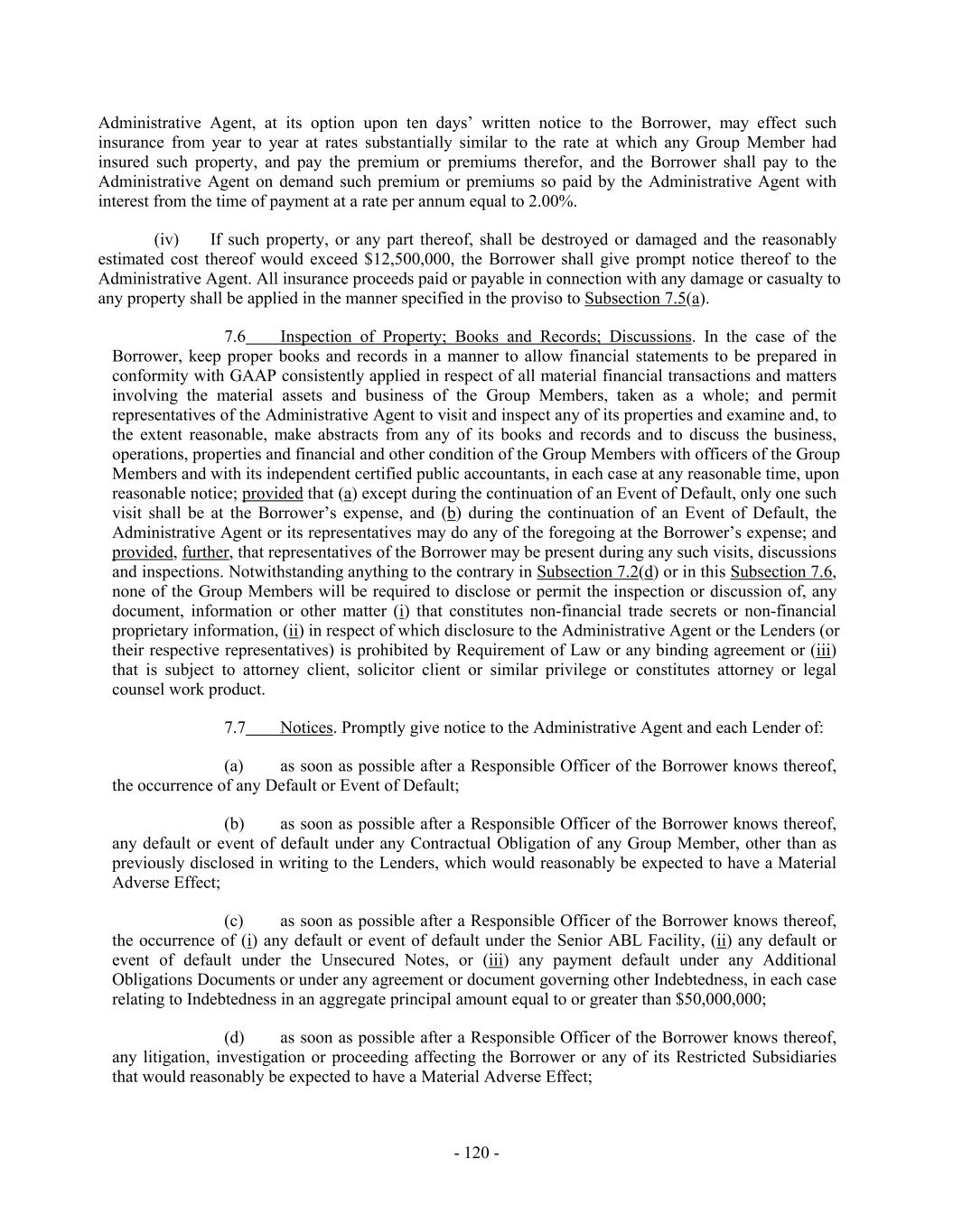 Administrative Agent, at its option upon ten days’ written notice to the Borrower, may effect such insurance from year to year at rates substantially similar to the rate at which any Group Member had insured such property, and pay the premium or premiums therefor, and the Borrower shall pay to the Administrative Agent on demand such premium or premiums so paid by the Administrative Agent with interest from the time of payment at a rate per annum equal to 2.00%. (iv) If such property, or any part thereof, shall be destroyed or damaged and the reasonably estimated cost thereof would exceed $12,500,000, the Borrower shall give prompt notice thereof to the Administrative Agent. All insurance proceeds paid or payable in connection with any damage or casualty to any property shall be applied in the manner specified in the proviso to Subsection 7.5(a). 7.6 Inspection of Property; Books and Records; Discussions. In the case of the Borrower, keep proper books and records in a manner to allow financial statements to be prepared in conformity with GAAP consistently applied in respect of all material financial transactions and matters involving the material assets and business of the Group Members, taken as a whole; and permit representatives of the Administrative Agent to visit and inspect any of its properties and examine and, to the extent reasonable, make abstracts from any of its books and records and to discuss the business, operations, properties and financial and other condition of the Group Members with officers of the Group Members and with its independent certified public accountants, in each case at any reasonable time, upon reasonable notice; provided that (a) except during the continuation of an Event of Default, only one such visit shall be at the Borrower’s expense, and (b) during the continuation of an Event of Default, the Administrative Agent or its representatives may do any of the foregoing at the Borrower’s expense; and provided, further, that representatives of the Borrower may be present during any such visits, discussions and inspections. Notwithstanding anything to the contrary in Subsection 7.2(d) or in this Subsection 7.6, none of the Group Members will be required to disclose or permit the inspection or discussion of, any document, information or other matter (i) that constitutes non-financial trade secrets or non-financial proprietary information, (ii) in respect of which disclosure to the Administrative Agent or the Lenders (or their respective representatives) is prohibited by Requirement of Law or any binding agreement or (iii) that is subject to attorney client, solicitor client or similar privilege or constitutes attorney or legal counsel work product. 7.7 Notices. Promptly give notice to the Administrative Agent and each Lender of: (a) as soon as possible after a Responsible Officer of the Borrower knows thereof, the occurrence of any Default or Event of Default; (b) as soon as possible after a Responsible Officer of the Borrower knows thereof, any default or event of default under any Contractual Obligation of any Group Member, other than as previously disclosed in writing to the Lenders, which would reasonably be expected to have a Material Adverse Effect; (c) as soon as possible after a Responsible Officer of the Borrower knows thereof, the occurrence of (i) any default or event of default under the Senior ABL Facility, (ii) any default or event of default under the Unsecured Notes, or (iii) any payment default under any Additional Obligations Documents or under any agreement or document governing other Indebtedness, in each case relating to Indebtedness in an aggregate principal amount equal to or greater than $50,000,000; (d) as soon as possible after a Responsible Officer of the Borrower knows thereof, any litigation, investigation or proceeding affecting the Borrower or any of its Restricted Subsidiaries that would reasonably be expected to have a Material Adverse Effect; - 120 -