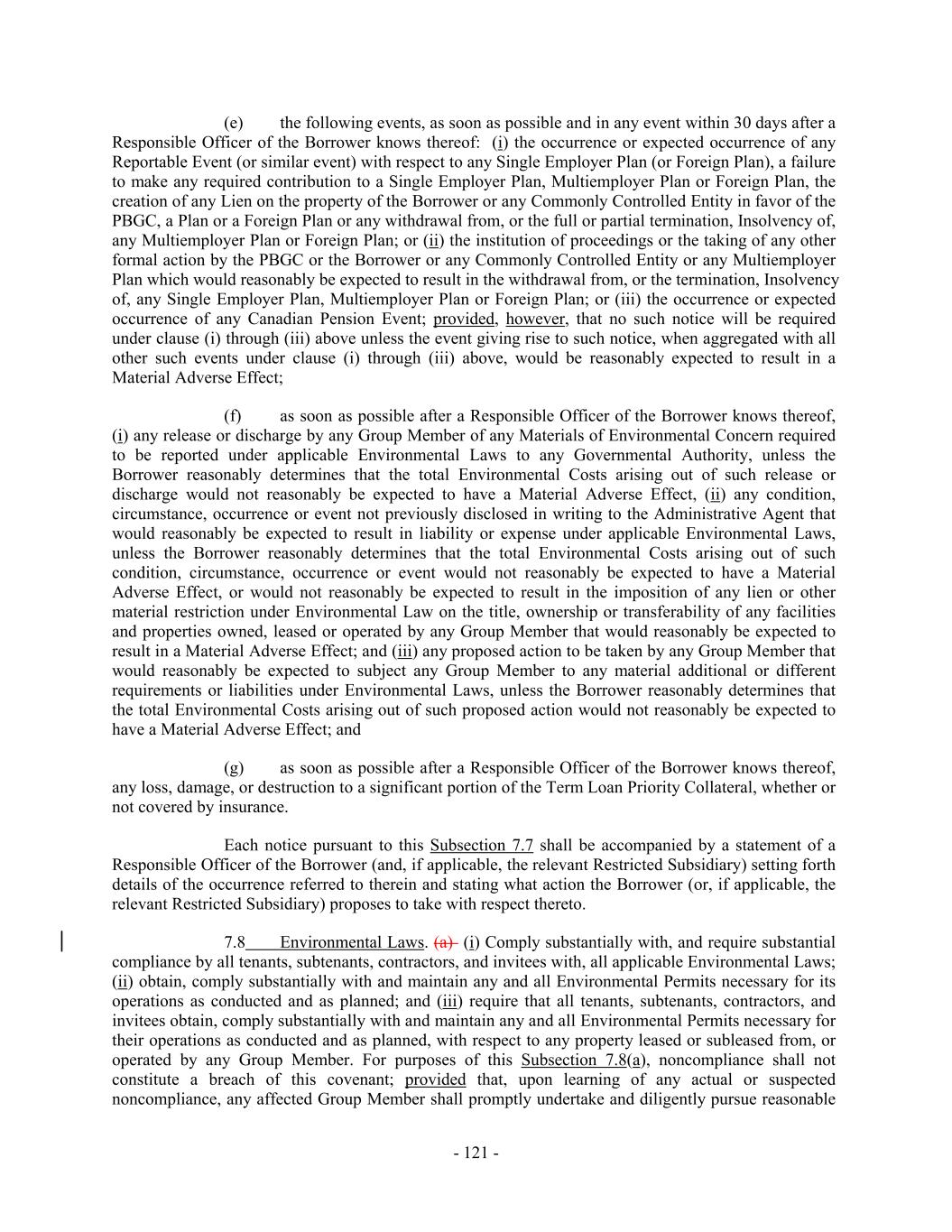 (e) the following events, as soon as possible and in any event within 30 days after a Responsible Officer of the Borrower knows thereof: (i) the occurrence or expected occurrence of any Reportable Event (or similar event) with respect to any Single Employer Plan (or Foreign Plan), a failure to make any required contribution to a Single Employer Plan, Multiemployer Plan or Foreign Plan, the creation of any Lien on the property of the Borrower or any Commonly Controlled Entity in favor of the PBGC, a Plan or a Foreign Plan or any withdrawal from, or the full or partial termination, Insolvency of, any Multiemployer Plan or Foreign Plan; or (ii) the institution of proceedings or the taking of any other formal action by the PBGC or the Borrower or any Commonly Controlled Entity or any Multiemployer Plan which would reasonably be expected to result in the withdrawal from, or the termination, Insolvency of, any Single Employer Plan, Multiemployer Plan or Foreign Plan; or (iii) the occurrence or expected occurrence of any Canadian Pension Event; provided, however, that no such notice will be required under clause (i) through (iii) above unless the event giving rise to such notice, when aggregated with all other such events under clause (i) through (iii) above, would be reasonably expected to result in a Material Adverse Effect; (f) as soon as possible after a Responsible Officer of the Borrower knows thereof, (i) any release or discharge by any Group Member of any Materials of Environmental Concern required to be reported under applicable Environmental Laws to any Governmental Authority, unless the Borrower reasonably determines that the total Environmental Costs arising out of such release or discharge would not reasonably be expected to have a Material Adverse Effect, (ii) any condition, circumstance, occurrence or event not previously disclosed in writing to the Administrative Agent that would reasonably be expected to result in liability or expense under applicable Environmental Laws, unless the Borrower reasonably determines that the total Environmental Costs arising out of such condition, circumstance, occurrence or event would not reasonably be expected to have a Material Adverse Effect, or would not reasonably be expected to result in the imposition of any lien or other material restriction under Environmental Law on the title, ownership or transferability of any facilities and properties owned, leased or operated by any Group Member that would reasonably be expected to result in a Material Adverse Effect; and (iii) any proposed action to be taken by any Group Member that would reasonably be expected to subject any Group Member to any material additional or different requirements or liabilities under Environmental Laws, unless the Borrower reasonably determines that the total Environmental Costs arising out of such proposed action would not reasonably be expected to have a Material Adverse Effect; and (g) as soon as possible after a Responsible Officer of the Borrower knows thereof, any loss, damage, or destruction to a significant portion of the Term Loan Priority Collateral, whether or not covered by insurance. Each notice pursuant to this Subsection 7.7 shall be accompanied by a statement of a Responsible Officer of the Borrower (and, if applicable, the relevant Restricted Subsidiary) setting forth details of the occurrence referred to therein and stating what action the Borrower (or, if applicable, the relevant Restricted Subsidiary) proposes to take with respect thereto. 7.8 Environmental Laws. (a) (i) Comply substantially with, and require substantial compliance by all tenants, subtenants, contractors, and invitees with, all applicable Environmental Laws; (ii) obtain, comply substantially with and maintain any and all Environmental Permits necessary for its operations as conducted and as planned; and (iii) require that all tenants, subtenants, contractors, and invitees obtain, comply substantially with and maintain any and all Environmental Permits necessary for their operations as conducted and as planned, with respect to any property leased or subleased from, or operated by any Group Member. For purposes of this Subsection 7.8(a), noncompliance shall not constitute a breach of this covenant; provided that, upon learning of any actual or suspected noncompliance, any affected Group Member shall promptly undertake and diligently pursue reasonable - 121 -