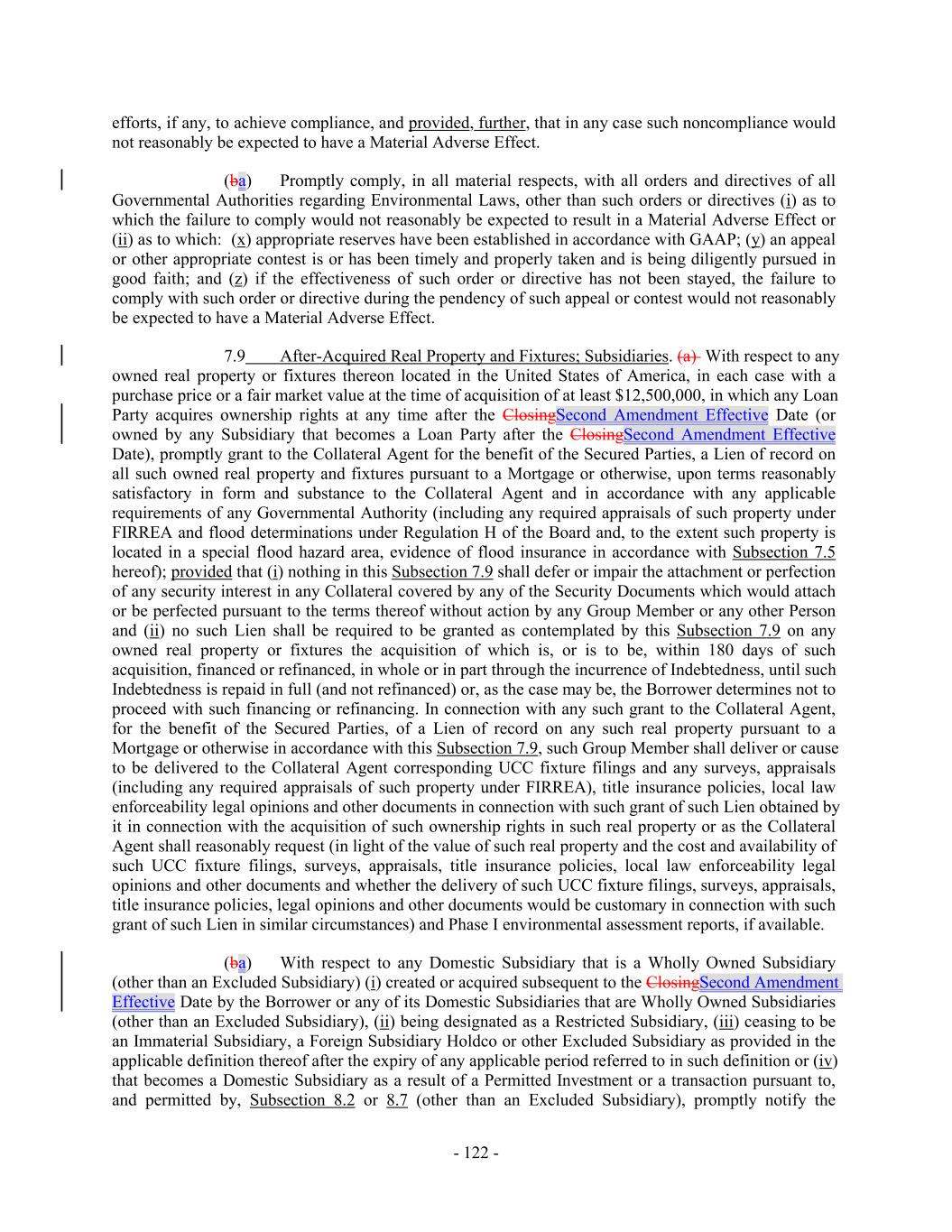 efforts, if any, to achieve compliance, and provided, further, that in any case such noncompliance would not reasonably be expected to have a Material Adverse Effect. (ba) Promptly comply, in all material respects, with all orders and directives of all Governmental Authorities regarding Environmental Laws, other than such orders or directives (i) as to which the failure to comply would not reasonably be expected to result in a Material Adverse Effect or (ii) as to which: (x) appropriate reserves have been established in accordance with GAAP; (y) an appeal or other appropriate contest is or has been timely and properly taken and is being diligently pursued in good faith; and (z) if the effectiveness of such order or directive has not been stayed, the failure to comply with such order or directive during the pendency of such appeal or contest would not reasonably be expected to have a Material Adverse Effect. 7.9 After-Acquired Real Property and Fixtures; Subsidiaries. (a) With respect to any owned real property or fixtures thereon located in the United States of America, in each case with a purchase price or a fair market value at the time of acquisition of at least $12,500,000, in which any Loan Party acquires ownership rights at any time after the ClosingSecond Amendment Effective Date (or owned by any Subsidiary that becomes a Loan Party after the ClosingSecond Amendment Effective Date), promptly grant to the Collateral Agent for the benefit of the Secured Parties, a Lien of record on all such owned real property and fixtures pursuant to a Mortgage or otherwise, upon terms reasonably satisfactory in form and substance to the Collateral Agent and in accordance with any applicable requirements of any Governmental Authority (including any required appraisals of such property under FIRREA and flood determinations under Regulation H of the Board and, to the extent such property is located in a special flood hazard area, evidence of flood insurance in accordance with Subsection 7.5 hereof); provided that (i) nothing in this Subsection 7.9 shall defer or impair the attachment or perfection of any security interest in any Collateral covered by any of the Security Documents which would attach or be perfected pursuant to the terms thereof without action by any Group Member or any other Person and (ii) no such Lien shall be required to be granted as contemplated by this Subsection 7.9 on any owned real property or fixtures the acquisition of which is, or is to be, within 180 days of such acquisition, financed or refinanced, in whole or in part through the incurrence of Indebtedness, until such Indebtedness is repaid in full (and not refinanced) or, as the case may be, the Borrower determines not to proceed with such financing or refinancing. In connection with any such grant to the Collateral Agent, for the benefit of the Secured Parties, of a Lien of record on any such real property pursuant to a Mortgage or otherwise in accordance with this Subsection 7.9, such Group Member shall deliver or cause to be delivered to the Collateral Agent corresponding UCC fixture filings and any surveys, appraisals (including any required appraisals of such property under FIRREA), title insurance policies, local law enforceability legal opinions and other documents in connection with such grant of such Lien obtained by it in connection with the acquisition of such ownership rights in such real property or as the Collateral Agent shall reasonably request (in light of the value of such real property and the cost and availability of such UCC fixture filings, surveys, appraisals, title insurance policies, local law enforceability legal opinions and other documents and whether the delivery of such UCC fixture filings, surveys, appraisals, title insurance policies, legal opinions and other documents would be customary in connection with such grant of such Lien in similar circumstances) and Phase I environmental assessment reports, if available. (ba) With respect to any Domestic Subsidiary that is a Wholly Owned Subsidiary (other than an Excluded Subsidiary) (i) created or acquired subsequent to the ClosingSecond Amendment Effective Date by the Borrower or any of its Domestic Subsidiaries that are Wholly Owned Subsidiaries (other than an Excluded Subsidiary), (ii) being designated as a Restricted Subsidiary, (iii) ceasing to be an Immaterial Subsidiary, a Foreign Subsidiary Holdco or other Excluded Subsidiary as provided in the applicable definition thereof after the expiry of any applicable period referred to in such definition or (iv) that becomes a Domestic Subsidiary as a result of a Permitted Investment or a transaction pursuant to, and permitted by, Subsection 8.2 or 8.7 (other than an Excluded Subsidiary), promptly notify the - 122 -