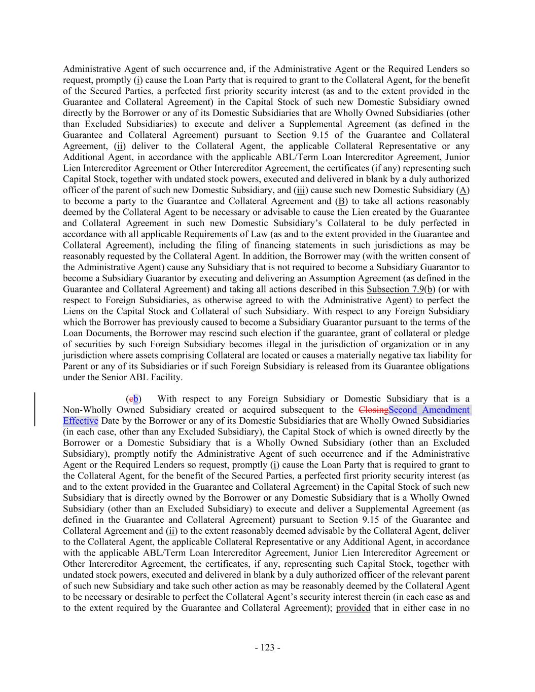 Administrative Agent of such occurrence and, if the Administrative Agent or the Required Lenders so request, promptly (i) cause the Loan Party that is required to grant to the Collateral Agent, for the benefit of the Secured Parties, a perfected first priority security interest (as and to the extent provided in the Guarantee and Collateral Agreement) in the Capital Stock of such new Domestic Subsidiary owned directly by the Borrower or any of its Domestic Subsidiaries that are Wholly Owned Subsidiaries (other than Excluded Subsidiaries) to execute and deliver a Supplemental Agreement (as defined in the Guarantee and Collateral Agreement) pursuant to Section 9.15 of the Guarantee and Collateral Agreement, (ii) deliver to the Collateral Agent, the applicable Collateral Representative or any Additional Agent, in accordance with the applicable ABL/Term Loan Intercreditor Agreement, Junior Lien Intercreditor Agreement or Other Intercreditor Agreement, the certificates (if any) representing such Capital Stock, together with undated stock powers, executed and delivered in blank by a duly authorized officer of the parent of such new Domestic Subsidiary, and (iii) cause such new Domestic Subsidiary (A) to become a party to the Guarantee and Collateral Agreement and (B) to take all actions reasonably deemed by the Collateral Agent to be necessary or advisable to cause the Lien created by the Guarantee and Collateral Agreement in such new Domestic Subsidiary’s Collateral to be duly perfected in accordance with all applicable Requirements of Law (as and to the extent provided in the Guarantee and Collateral Agreement), including the filing of financing statements in such jurisdictions as may be reasonably requested by the Collateral Agent. In addition, the Borrower may (with the written consent of the Administrative Agent) cause any Subsidiary that is not required to become a Subsidiary Guarantor to become a Subsidiary Guarantor by executing and delivering an Assumption Agreement (as defined in the Guarantee and Collateral Agreement) and taking all actions described in this Subsection 7.9(b) (or with respect to Foreign Subsidiaries, as otherwise agreed to with the Administrative Agent) to perfect the Liens on the Capital Stock and Collateral of such Subsidiary. With respect to any Foreign Subsidiary which the Borrower has previously caused to become a Subsidiary Guarantor pursuant to the terms of the Loan Documents, the Borrower may rescind such election if the guarantee, grant of collateral or pledge of securities by such Foreign Subsidiary becomes illegal in the jurisdiction of organization or in any jurisdiction where assets comprising Collateral are located or causes a materially negative tax liability for Parent or any of its Subsidiaries or if such Foreign Subsidiary is released from its Guarantee obligations under the Senior ABL Facility. (cb) With respect to any Foreign Subsidiary or Domestic Subsidiary that is a Non-Wholly Owned Subsidiary created or acquired subsequent to the ClosingSecond Amendment Effective Date by the Borrower or any of its Domestic Subsidiaries that are Wholly Owned Subsidiaries (in each case, other than any Excluded Subsidiary), the Capital Stock of which is owned directly by the Borrower or a Domestic Subsidiary that is a Wholly Owned Subsidiary (other than an Excluded Subsidiary), promptly notify the Administrative Agent of such occurrence and if the Administrative Agent or the Required Lenders so request, promptly (i) cause the Loan Party that is required to grant to the Collateral Agent, for the benefit of the Secured Parties, a perfected first priority security interest (as and to the extent provided in the Guarantee and Collateral Agreement) in the Capital Stock of such new Subsidiary that is directly owned by the Borrower or any Domestic Subsidiary that is a Wholly Owned Subsidiary (other than an Excluded Subsidiary) to execute and deliver a Supplemental Agreement (as defined in the Guarantee and Collateral Agreement) pursuant to Section 9.15 of the Guarantee and Collateral Agreement and (ii) to the extent reasonably deemed advisable by the Collateral Agent, deliver to the Collateral Agent, the applicable Collateral Representative or any Additional Agent, in accordance with the applicable ABL/Term Loan Intercreditor Agreement, Junior Lien Intercreditor Agreement or Other Intercreditor Agreement, the certificates, if any, representing such Capital Stock, together with undated stock powers, executed and delivered in blank by a duly authorized officer of the relevant parent of such new Subsidiary and take such other action as may be reasonably deemed by the Collateral Agent to be necessary or desirable to perfect the Collateral Agent’s security interest therein (in each case as and to the extent required by the Guarantee and Collateral Agreement); provided that in either case in no - 123 -