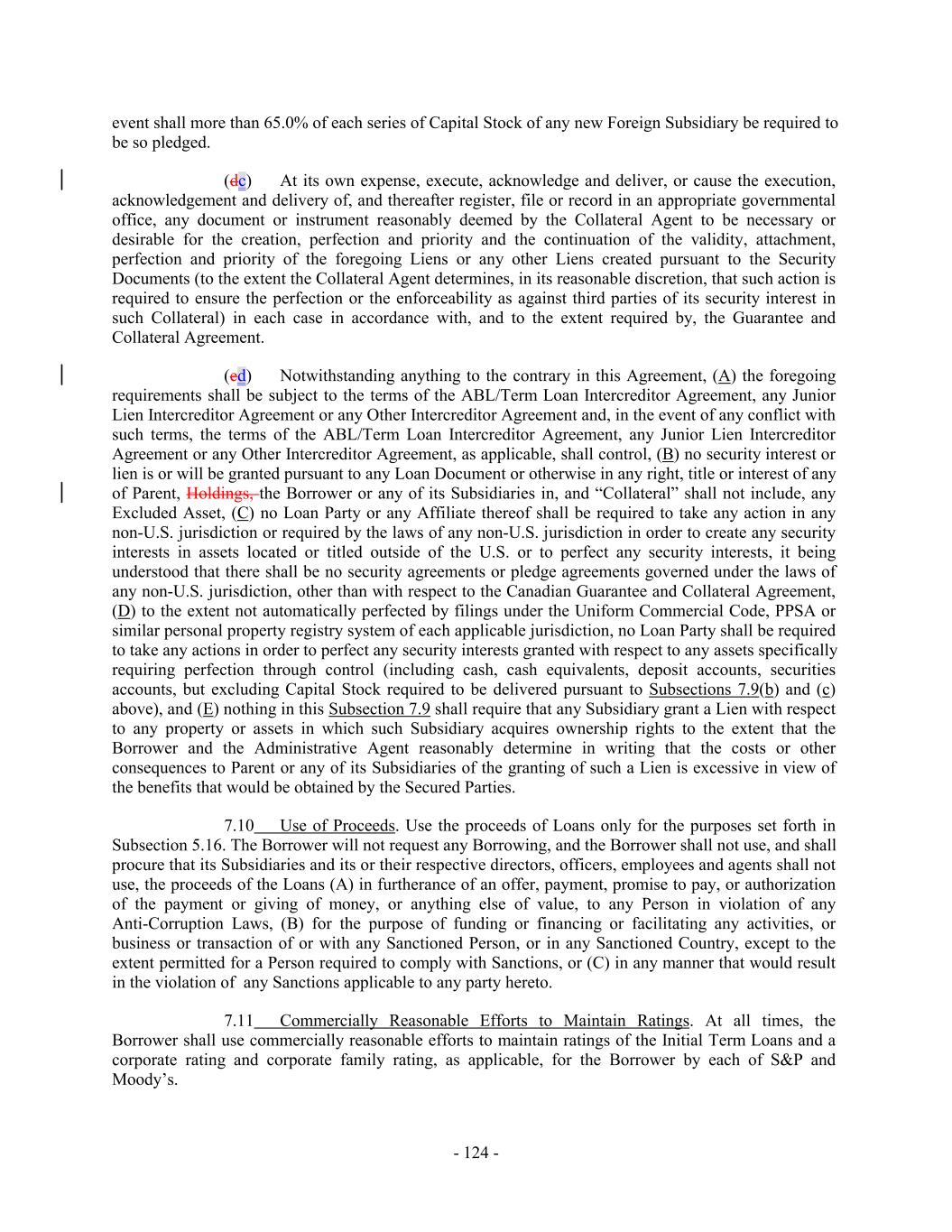 event shall more than 65.0% of each series of Capital Stock of any new Foreign Subsidiary be required to be so pledged. (dc) At its own expense, execute, acknowledge and deliver, or cause the execution, acknowledgement and delivery of, and thereafter register, file or record in an appropriate governmental office, any document or instrument reasonably deemed by the Collateral Agent to be necessary or desirable for the creation, perfection and priority and the continuation of the validity, attachment, perfection and priority of the foregoing Liens or any other Liens created pursuant to the Security Documents (to the extent the Collateral Agent determines, in its reasonable discretion, that such action is required to ensure the perfection or the enforceability as against third parties of its security interest in such Collateral) in each case in accordance with, and to the extent required by, the Guarantee and Collateral Agreement. (ed) Notwithstanding anything to the contrary in this Agreement, (A) the foregoing requirements shall be subject to the terms of the ABL/Term Loan Intercreditor Agreement, any Junior Lien Intercreditor Agreement or any Other Intercreditor Agreement and, in the event of any conflict with such terms, the terms of the ABL/Term Loan Intercreditor Agreement, any Junior Lien Intercreditor Agreement or any Other Intercreditor Agreement, as applicable, shall control, (B) no security interest or lien is or will be granted pursuant to any Loan Document or otherwise in any right, title or interest of any of Parent, Holdings, the Borrower or any of its Subsidiaries in, and “Collateral” shall not include, any Excluded Asset, (C) no Loan Party or any Affiliate thereof shall be required to take any action in any non-U.S. jurisdiction or required by the laws of any non-U.S. jurisdiction in order to create any security interests in assets located or titled outside of the U.S. or to perfect any security interests, it being understood that there shall be no security agreements or pledge agreements governed under the laws of any non-U.S. jurisdiction, other than with respect to the Canadian Guarantee and Collateral Agreement, (D) to the extent not automatically perfected by filings under the Uniform Commercial Code, PPSA or similar personal property registry system of each applicable jurisdiction, no Loan Party shall be required to take any actions in order to perfect any security interests granted with respect to any assets specifically requiring perfection through control (including cash, cash equivalents, deposit accounts, securities accounts, but excluding Capital Stock required to be delivered pursuant to Subsections 7.9(b) and (c) above), and (E) nothing in this Subsection 7.9 shall require that any Subsidiary grant a Lien with respect to any property or assets in which such Subsidiary acquires ownership rights to the extent that the Borrower and the Administrative Agent reasonably determine in writing that the costs or other consequences to Parent or any of its Subsidiaries of the granting of such a Lien is excessive in view of the benefits that would be obtained by the Secured Parties. 7.10 Use of Proceeds. Use the proceeds of Loans only for the purposes set forth in Subsection 5.16. The Borrower will not request any Borrowing, and the Borrower shall not use, and shall procure that its Subsidiaries and its or their respective directors, officers, employees and agents shall not use, the proceeds of the Loans (A) in furtherance of an offer, payment, promise to pay, or authorization of the payment or giving of money, or anything else of value, to any Person in violation of any Anti-Corruption Laws, (B) for the purpose of funding or financing or facilitating any activities, or business or transaction of or with any Sanctioned Person, or in any Sanctioned Country, except to the extent permitted for a Person required to comply with Sanctions, or (C) in any manner that would result in the violation of any Sanctions applicable to any party hereto. 7.11 Commercially Reasonable Efforts to Maintain Ratings. At all times, the Borrower shall use commercially reasonable efforts to maintain ratings of the Initial Term Loans and a corporate rating and corporate family rating, as applicable, for the Borrower by each of S&P and Moody’s. - 124 -