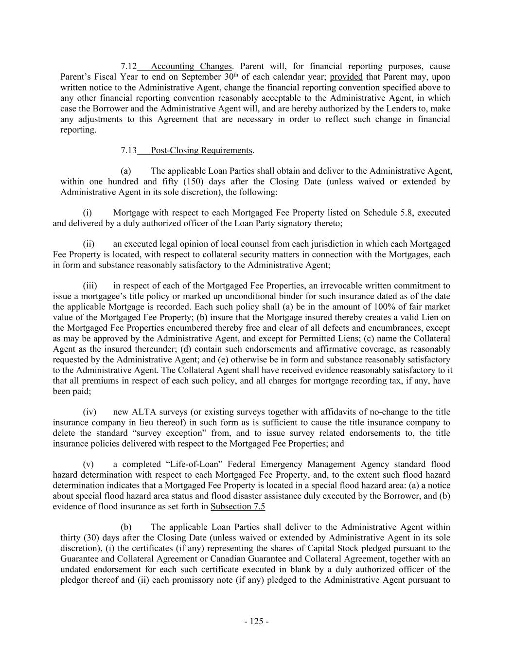 7.12 Accounting Changes. Parent will, for financial reporting purposes, cause Parent’s Fiscal Year to end on September 30th of each calendar year; provided that Parent may, upon written notice to the Administrative Agent, change the financial reporting convention specified above to any other financial reporting convention reasonably acceptable to the Administrative Agent, in which case the Borrower and the Administrative Agent will, and are hereby authorized by the Lenders to, make any adjustments to this Agreement that are necessary in order to reflect such change in financial reporting. 7.13 Post-Closing Requirements. (a) The applicable Loan Parties shall obtain and deliver to the Administrative Agent, within one hundred and fifty (150) days after the Closing Date (unless waived or extended by Administrative Agent in its sole discretion), the following: (i) Mortgage with respect to each Mortgaged Fee Property listed on Schedule 5.8, executed and delivered by a duly authorized officer of the Loan Party signatory thereto; (ii) an executed legal opinion of local counsel from each jurisdiction in which each Mortgaged Fee Property is located, with respect to collateral security matters in connection with the Mortgages, each in form and substance reasonably satisfactory to the Administrative Agent; (iii) in respect of each of the Mortgaged Fee Properties, an irrevocable written commitment to issue a mortgagee’s title policy or marked up unconditional binder for such insurance dated as of the date the applicable Mortgage is recorded. Each such policy shall (a) be in the amount of 100% of fair market value of the Mortgaged Fee Property; (b) insure that the Mortgage insured thereby creates a valid Lien on the Mortgaged Fee Properties encumbered thereby free and clear of all defects and encumbrances, except as may be approved by the Administrative Agent, and except for Permitted Liens; (c) name the Collateral Agent as the insured thereunder; (d) contain such endorsements and affirmative coverage, as reasonably requested by the Administrative Agent; and (e) otherwise be in form and substance reasonably satisfactory to the Administrative Agent. The Collateral Agent shall have received evidence reasonably satisfactory to it that all premiums in respect of each such policy, and all charges for mortgage recording tax, if any, have been paid; (iv) new ALTA surveys (or existing surveys together with affidavits of no-change to the title insurance company in lieu thereof) in such form as is sufficient to cause the title insurance company to delete the standard “survey exception” from, and to issue survey related endorsements to, the title insurance policies delivered with respect to the Mortgaged Fee Properties; and (v) a completed “Life-of-Loan” Federal Emergency Management Agency standard flood hazard determination with respect to each Mortgaged Fee Property, and, to the extent such flood hazard determination indicates that a Mortgaged Fee Property is located in a special flood hazard area: (a) a notice about special flood hazard area status and flood disaster assistance duly executed by the Borrower, and (b) evidence of flood insurance as set forth in Subsection 7.5 (b) The applicable Loan Parties shall deliver to the Administrative Agent within thirty (30) days after the Closing Date (unless waived or extended by Administrative Agent in its sole discretion), (i) the certificates (if any) representing the shares of Capital Stock pledged pursuant to the Guarantee and Collateral Agreement or Canadian Guarantee and Collateral Agreement, together with an undated endorsement for each such certificate executed in blank by a duly authorized officer of the pledgor thereof and (ii) each promissory note (if any) pledged to the Administrative Agent pursuant to - 125 -