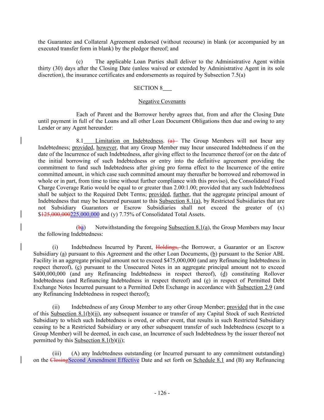the Guarantee and Collateral Agreement endorsed (without recourse) in blank (or accompanied by an executed transfer form in blank) by the pledgor thereof; and (c) The applicable Loan Parties shall deliver to the Administrative Agent within thirty (30) days after the Closing Date (unless waived or extended by Administrative Agent in its sole discretion), the insurance certificates and endorsements as required by Subsection 7.5(a) SECTION 8 Negative Covenants Each of Parent and the Borrower hereby agrees that, from and after the Closing Date until payment in full of the Loans and all other Loan Document Obligations then due and owing to any Lender or any Agent hereunder: 8.1 Limitation on Indebtedness. (a) The Group Members will not Incur any Indebtedness; provided, however, that any Group Member may Incur unsecured Indebtedness if on the date of the Incurrence of such Indebtedness, after giving effect to the Incurrence thereof (or on the date of the initial borrowing of such Indebtedness or entry into the definitive agreement providing the commitment to fund such Indebtedness after giving pro forma effect to the Incurrence of the entire committed amount, in which case such committed amount may thereafter be borrowed and reborrowed in whole or in part, from time to time without further compliance with this proviso), the Consolidated Fixed Charge Coverage Ratio would be equal to or greater than 2.00:1.00; provided that any such Indebtedness shall be subject to the Required Debt Terms; provided, further, that the aggregate principal amount of Indebtedness that may be Incurred pursuant to this Subsection 8.1(a), by Restricted Subsidiaries that are not Subsidiary Guarantors or Escrow Subsidiaries shall not exceed the greater of (x) $125,000,000225,000,000 and (y) 7.75% of Consolidated Total Assets. (ba) Notwithstanding the foregoing Subsection 8.1(a), the Group Members may Incur the following Indebtedness: (i) Indebtedness Incurred by Parent, Holdings, the Borrower, a Guarantor or an Escrow Subsidiary (a) pursuant to this Agreement and the other Loan Documents, (b) pursuant to the Senior ABL Facility in an aggregate principal amount not to exceed $475,000,000 (and any Refinancing Indebtedness in respect thereof), (c) pursuant to the Unsecured Notes in an aggregate principal amount not to exceed $400,000,000 (and any Refinancing Indebtedness in respect thereof), (d) constituting Rollover Indebtedness (and Refinancing Indebtedness in respect thereof) and (e) in respect of Permitted Debt Exchange Notes Incurred pursuant to a Permitted Debt Exchange in accordance with Subsection 2.9 (and any Refinancing Indebtedness in respect thereof); (ii) Indebtedness of any Group Member to any other Group Member; provided that in the case of this Subsection 8.1(b)(ii), any subsequent issuance or transfer of any Capital Stock of such Restricted Subsidiary to which such Indebtedness is owed, or other event, that results in such Restricted Subsidiary ceasing to be a Restricted Subsidiary or any other subsequent transfer of such Indebtedness (except to a Group Member) will be deemed, in each case, an Incurrence of such Indebtedness by the issuer thereof not permitted by this Subsection 8.1(b)(ii); (iii) (A) any Indebtedness outstanding (or Incurred pursuant to any commitment outstanding) on the ClosingSecond Amendment Effective Date and set forth on Schedule 8.1 and (B) any Refinancing - 126 -
