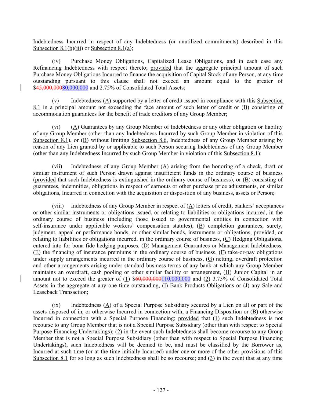 Indebtedness Incurred in respect of any Indebtedness (or unutilized commitments) described in this Subsection 8.1(b)(iii) or Subsection 8.1(a); (iv) Purchase Money Obligations, Capitalized Lease Obligations, and in each case any Refinancing Indebtedness with respect thereto; provided that the aggregate principal amount of such Purchase Money Obligations Incurred to finance the acquisition of Capital Stock of any Person, at any time outstanding pursuant to this clause shall not exceed an amount equal to the greater of $45,000,00080,000,000 and 2.75% of Consolidated Total Assets; (v) Indebtedness (A) supported by a letter of credit issued in compliance with this Subsection 8.1 in a principal amount not exceeding the face amount of such letter of credit or (B) consisting of accommodation guarantees for the benefit of trade creditors of any Group Member; (vi) (A) Guarantees by any Group Member of Indebtedness or any other obligation or liability of any Group Member (other than any Indebtedness Incurred by such Group Member in violation of this Subsection 8.1), or (B) without limiting Subsection 8.6, Indebtedness of any Group Member arising by reason of any Lien granted by or applicable to such Person securing Indebtedness of any Group Member (other than any Indebtedness Incurred by such Group Member in violation of this Subsection 8.1); (vii) Indebtedness of any Group Member (A) arising from the honoring of a check, draft or similar instrument of such Person drawn against insufficient funds in the ordinary course of business (provided that such Indebtedness is extinguished in the ordinary course of business), or (B) consisting of guarantees, indemnities, obligations in respect of earnouts or other purchase price adjustments, or similar obligations, Incurred in connection with the acquisition or disposition of any business, assets or Person; (viii) Indebtedness of any Group Member in respect of (A) letters of credit, bankers’ acceptances or other similar instruments or obligations issued, or relating to liabilities or obligations incurred, in the ordinary course of business (including those issued to governmental entities in connection with self-insurance under applicable workers’ compensation statutes), (B) completion guarantees, surety, judgment, appeal or performance bonds, or other similar bonds, instruments or obligations, provided, or relating to liabilities or obligations incurred, in the ordinary course of business, (C) Hedging Obligations, entered into for bona fide hedging purposes, (D) Management Guarantees or Management Indebtedness, (E) the financing of insurance premiums in the ordinary course of business, (F) take-or-pay obligations under supply arrangements incurred in the ordinary course of business, (G) netting, overdraft protection and other arrangements arising under standard business terms of any bank at which any Group Member maintains an overdraft, cash pooling or other similar facility or arrangement, (H) Junior Capital in an amount not to exceed the greater of (1) $60,000,000110,000,000 and (2) 3.75% of Consolidated Total Assets in the aggregate at any one time outstanding, (I) Bank Products Obligations or (J) any Sale and Leaseback Transaction; (ix) Indebtedness (A) of a Special Purpose Subsidiary secured by a Lien on all or part of the assets disposed of in, or otherwise Incurred in connection with, a Financing Disposition or (B) otherwise Incurred in connection with a Special Purpose Financing; provided that (1) such Indebtedness is not recourse to any Group Member that is not a Special Purpose Subsidiary (other than with respect to Special Purpose Financing Undertakings); (2) in the event such Indebtedness shall become recourse to any Group Member that is not a Special Purpose Subsidiary (other than with respect to Special Purpose Financing Undertakings), such Indebtedness will be deemed to be, and must be classified by the Borrower as, Incurred at such time (or at the time initially Incurred) under one or more of the other provisions of this Subsection 8.1 for so long as such Indebtedness shall be so recourse; and (3) in the event that at any time - 127 -