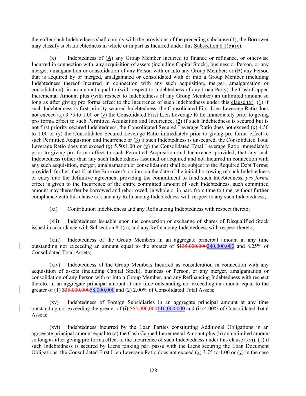 thereafter such Indebtedness shall comply with the provisions of the preceding subclause (1), the Borrower may classify such Indebtedness in whole or in part as Incurred under this Subsection 8.1(b)(ix); (x) Indebtedness of (A) any Group Member Incurred to finance or refinance, or otherwise Incurred in connection with, any acquisition of assets (including Capital Stock), business or Person, or any merger, amalgamation or consolidation of any Person with or into any Group Member; or (B) any Person that is acquired by or merged, amalgamated or consolidated with or into a Group Member (including Indebtedness thereof Incurred in connection with any such acquisition, merger, amalgamation or consolidation), in an amount equal to (with respect to Indebtedness of any Loan Party) the Cash Capped Incremental Amount plus (with respect to Indebtedness of any Group Member) an unlimited amount so long as after giving pro forma effect to the Incurrence of such Indebtedness under this clause (x), (1) if such Indebtedness is first priority secured Indebtedness, the Consolidated First Lien Leverage Ratio does not exceed (x) 3.75 to 1.00 or (y) the Consolidated First Lien Leverage Ratio immediately prior to giving pro forma effect to such Permitted Acquisition and Incurrence, (2) if such Indebtedness is secured but is not first priority secured Indebtedness, the Consolidated Secured Leverage Ratio does not exceed (x) 4.50 to 1.00 or (y) the Consolidated Secured Leverage Ratio immediately prior to giving pro forma effect to such Permitted Acquisition and Incurrence or (3) if such Indebtedness is unsecured, the Consolidated Total Leverage Ratio does not exceed (x) 5.50:1.00 or (y) the Consolidated Total Leverage Ratio immediately prior to giving pro forma effect to such Permitted Acquisition and Incurrence; provided, that any such Indebtedness (other than any such Indebtedness assumed or acquired and not Incurred in connection with any such acquisition, merger, amalgamation or consolidation) shall be subject to the Required Debt Terms; provided, further, that if, at the Borrower’s option, on the date of the initial borrowing of such Indebtedness or entry into the definitive agreement providing the commitment to fund such Indebtedness, pro forma effect is given to the Incurrence of the entire committed amount of such Indebtedness, such committed amount may thereafter be borrowed and reborrowed, in whole or in part, from time to time, without further compliance with this clause (x); and any Refinancing Indebtedness with respect to any such Indebtedness; (xi) Contribution Indebtedness and any Refinancing Indebtedness with respect thereto; (xii) Indebtedness issuable upon the conversion or exchange of shares of Disqualified Stock issued in accordance with Subsection 8.1(a), and any Refinancing Indebtedness with respect thereto; (xiii) Indebtedness of the Group Members in an aggregate principal amount at any time outstanding not exceeding an amount equal to the greater of $135,000,000240,000,000 and 8.25% of Consolidated Total Assets; (xiv) Indebtedness of the Group Members Incurred as consideration in connection with any acquisition of assets (including Capital Stock), business or Person, or any merger, amalgamation or consolidation of any Person with or into a Group Member, and any Refinancing Indebtedness with respect thereto, in an aggregate principal amount at any time outstanding not exceeding an amount equal to the greater of (1) $35,000,00058,000,000 and (2) 2.00% of Consolidated Total Assets; (xv) Indebtedness of Foreign Subsidiaries in an aggregate principal amount at any time outstanding not exceeding the greater of (i) $65,000,000116,000,000 and (ii) 4.00% of Consolidated Total Assets; (xvi) Indebtedness Incurred by the Loan Parties constituting Additional Obligations in an aggregate principal amount equal to (a) the Cash Capped Incremental Amount plus (b) an unlimited amount so long as after giving pro forma effect to the Incurrence of such Indebtedness under this clause (xvi), (1) if such Indebtedness is secured by Liens ranking pari passu with the Liens securing the Loan Document Obligations, the Consolidated First Lien Leverage Ratio does not exceed (x) 3.75 to 1.00 or (y) in the case - 128 -