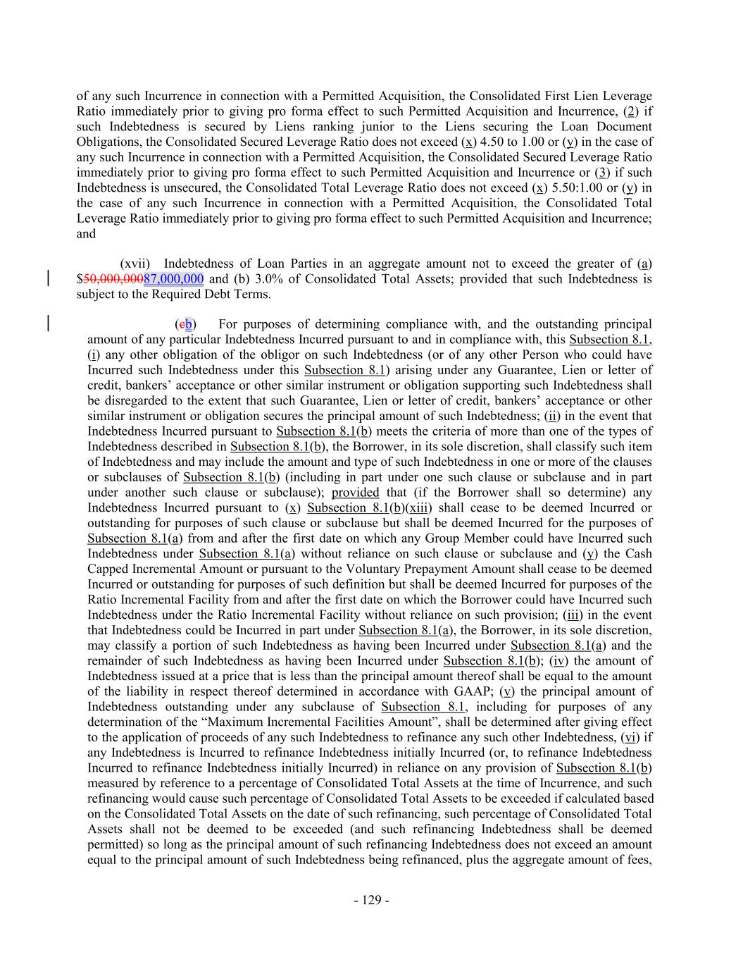 of any such Incurrence in connection with a Permitted Acquisition, the Consolidated First Lien Leverage Ratio immediately prior to giving pro forma effect to such Permitted Acquisition and Incurrence, (2) if such Indebtedness is secured by Liens ranking junior to the Liens securing the Loan Document Obligations, the Consolidated Secured Leverage Ratio does not exceed (x) 4.50 to 1.00 or (y) in the case of any such Incurrence in connection with a Permitted Acquisition, the Consolidated Secured Leverage Ratio immediately prior to giving pro forma effect to such Permitted Acquisition and Incurrence or (3) if such Indebtedness is unsecured, the Consolidated Total Leverage Ratio does not exceed (x) 5.50:1.00 or (y) in the case of any such Incurrence in connection with a Permitted Acquisition, the Consolidated Total Leverage Ratio immediately prior to giving pro forma effect to such Permitted Acquisition and Incurrence; and (xvii) Indebtedness of Loan Parties in an aggregate amount not to exceed the greater of (a) $50,000,00087,000,000 and (b) 3.0% of Consolidated Total Assets; provided that such Indebtedness is subject to the Required Debt Terms. (cb) For purposes of determining compliance with, and the outstanding principal amount of any particular Indebtedness Incurred pursuant to and in compliance with, this Subsection 8.1, (i) any other obligation of the obligor on such Indebtedness (or of any other Person who could have Incurred such Indebtedness under this Subsection 8.1) arising under any Guarantee, Lien or letter of credit, bankers’ acceptance or other similar instrument or obligation supporting such Indebtedness shall be disregarded to the extent that such Guarantee, Lien or letter of credit, bankers’ acceptance or other similar instrument or obligation secures the principal amount of such Indebtedness; (ii) in the event that Indebtedness Incurred pursuant to Subsection 8.1(b) meets the criteria of more than one of the types of Indebtedness described in Subsection 8.1(b), the Borrower, in its sole discretion, shall classify such item of Indebtedness and may include the amount and type of such Indebtedness in one or more of the clauses or subclauses of Subsection 8.1(b) (including in part under one such clause or subclause and in part under another such clause or subclause); provided that (if the Borrower shall so determine) any Indebtedness Incurred pursuant to (x) Subsection 8.1(b)(xiii) shall cease to be deemed Incurred or outstanding for purposes of such clause or subclause but shall be deemed Incurred for the purposes of Subsection 8.1(a) from and after the first date on which any Group Member could have Incurred such Indebtedness under Subsection 8.1(a) without reliance on such clause or subclause and (y) the Cash Capped Incremental Amount or pursuant to the Voluntary Prepayment Amount shall cease to be deemed Incurred or outstanding for purposes of such definition but shall be deemed Incurred for purposes of the Ratio Incremental Facility from and after the first date on which the Borrower could have Incurred such Indebtedness under the Ratio Incremental Facility without reliance on such provision; (iii) in the event that Indebtedness could be Incurred in part under Subsection 8.1(a), the Borrower, in its sole discretion, may classify a portion of such Indebtedness as having been Incurred under Subsection 8.1(a) and the remainder of such Indebtedness as having been Incurred under Subsection 8.1(b); (iv) the amount of Indebtedness issued at a price that is less than the principal amount thereof shall be equal to the amount of the liability in respect thereof determined in accordance with GAAP; (v) the principal amount of Indebtedness outstanding under any subclause of Subsection 8.1, including for purposes of any determination of the “Maximum Incremental Facilities Amount”, shall be determined after giving effect to the application of proceeds of any such Indebtedness to refinance any such other Indebtedness, (vi) if any Indebtedness is Incurred to refinance Indebtedness initially Incurred (or, to refinance Indebtedness Incurred to refinance Indebtedness initially Incurred) in reliance on any provision of Subsection 8.1(b) measured by reference to a percentage of Consolidated Total Assets at the time of Incurrence, and such refinancing would cause such percentage of Consolidated Total Assets to be exceeded if calculated based on the Consolidated Total Assets on the date of such refinancing, such percentage of Consolidated Total Assets shall not be deemed to be exceeded (and such refinancing Indebtedness shall be deemed permitted) so long as the principal amount of such refinancing Indebtedness does not exceed an amount equal to the principal amount of such Indebtedness being refinanced, plus the aggregate amount of fees, - 129 -
