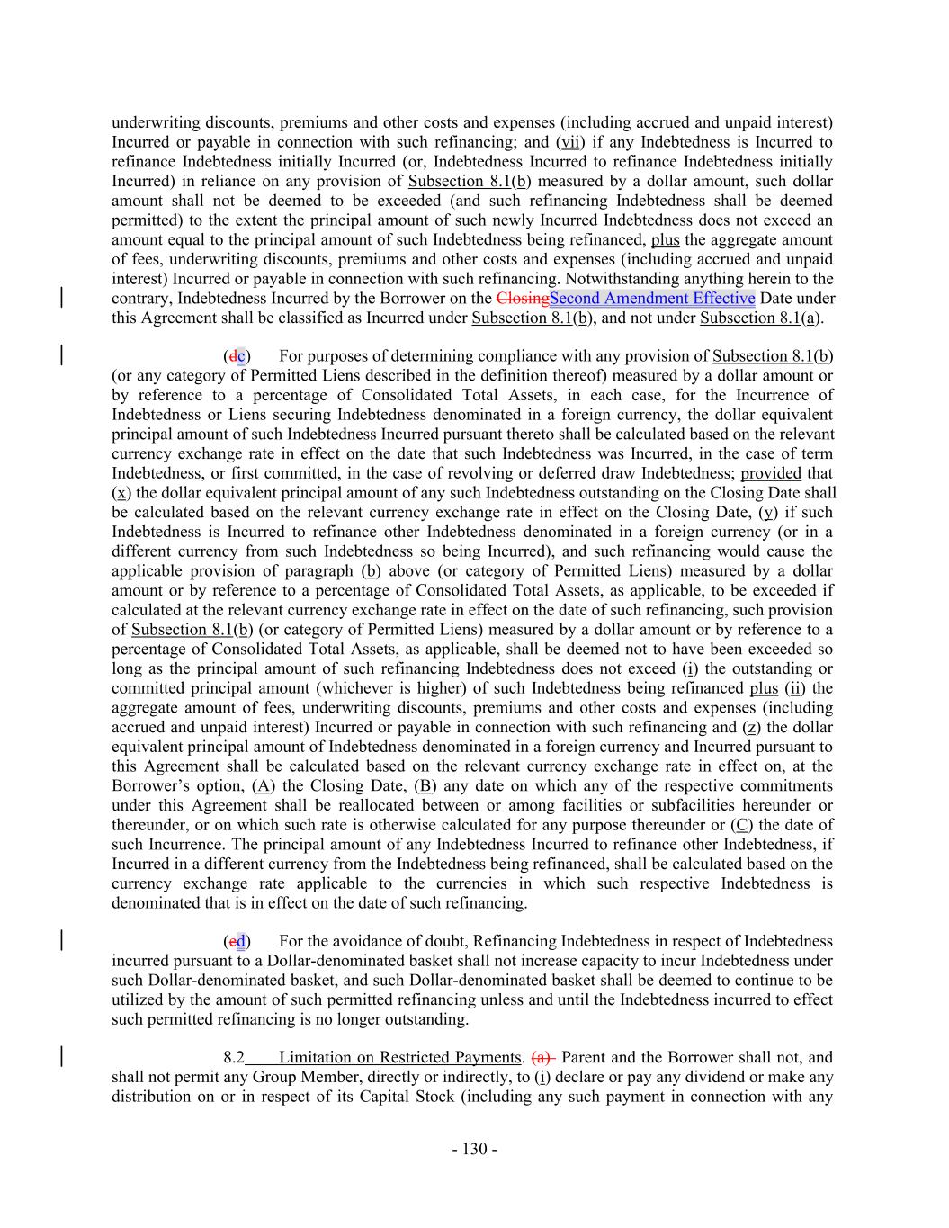 underwriting discounts, premiums and other costs and expenses (including accrued and unpaid interest) Incurred or payable in connection with such refinancing; and (vii) if any Indebtedness is Incurred to refinance Indebtedness initially Incurred (or, Indebtedness Incurred to refinance Indebtedness initially Incurred) in reliance on any provision of Subsection 8.1(b) measured by a dollar amount, such dollar amount shall not be deemed to be exceeded (and such refinancing Indebtedness shall be deemed permitted) to the extent the principal amount of such newly Incurred Indebtedness does not exceed an amount equal to the principal amount of such Indebtedness being refinanced, plus the aggregate amount of fees, underwriting discounts, premiums and other costs and expenses (including accrued and unpaid interest) Incurred or payable in connection with such refinancing. Notwithstanding anything herein to the contrary, Indebtedness Incurred by the Borrower on the ClosingSecond Amendment Effective Date under this Agreement shall be classified as Incurred under Subsection 8.1(b), and not under Subsection 8.1(a). (dc) For purposes of determining compliance with any provision of Subsection 8.1(b) (or any category of Permitted Liens described in the definition thereof) measured by a dollar amount or by reference to a percentage of Consolidated Total Assets, in each case, for the Incurrence of Indebtedness or Liens securing Indebtedness denominated in a foreign currency, the dollar equivalent principal amount of such Indebtedness Incurred pursuant thereto shall be calculated based on the relevant currency exchange rate in effect on the date that such Indebtedness was Incurred, in the case of term Indebtedness, or first committed, in the case of revolving or deferred draw Indebtedness; provided that (x) the dollar equivalent principal amount of any such Indebtedness outstanding on the Closing Date shall be calculated based on the relevant currency exchange rate in effect on the Closing Date, (y) if such Indebtedness is Incurred to refinance other Indebtedness denominated in a foreign currency (or in a different currency from such Indebtedness so being Incurred), and such refinancing would cause the applicable provision of paragraph (b) above (or category of Permitted Liens) measured by a dollar amount or by reference to a percentage of Consolidated Total Assets, as applicable, to be exceeded if calculated at the relevant currency exchange rate in effect on the date of such refinancing, such provision of Subsection 8.1(b) (or category of Permitted Liens) measured by a dollar amount or by reference to a percentage of Consolidated Total Assets, as applicable, shall be deemed not to have been exceeded so long as the principal amount of such refinancing Indebtedness does not exceed (i) the outstanding or committed principal amount (whichever is higher) of such Indebtedness being refinanced plus (ii) the aggregate amount of fees, underwriting discounts, premiums and other costs and expenses (including accrued and unpaid interest) Incurred or payable in connection with such refinancing and (z) the dollar equivalent principal amount of Indebtedness denominated in a foreign currency and Incurred pursuant to this Agreement shall be calculated based on the relevant currency exchange rate in effect on, at the Borrower’s option, (A) the Closing Date, (B) any date on which any of the respective commitments under this Agreement shall be reallocated between or among facilities or subfacilities hereunder or thereunder, or on which such rate is otherwise calculated for any purpose thereunder or (C) the date of such Incurrence. The principal amount of any Indebtedness Incurred to refinance other Indebtedness, if Incurred in a different currency from the Indebtedness being refinanced, shall be calculated based on the currency exchange rate applicable to the currencies in which such respective Indebtedness is denominated that is in effect on the date of such refinancing. (ed) For the avoidance of doubt, Refinancing Indebtedness in respect of Indebtedness incurred pursuant to a Dollar-denominated basket shall not increase capacity to incur Indebtedness under such Dollar-denominated basket, and such Dollar-denominated basket shall be deemed to continue to be utilized by the amount of such permitted refinancing unless and until the Indebtedness incurred to effect such permitted refinancing is no longer outstanding. 8.2 Limitation on Restricted Payments. (a) Parent and the Borrower shall not, and shall not permit any Group Member, directly or indirectly, to (i) declare or pay any dividend or make any distribution on or in respect of its Capital Stock (including any such payment in connection with any - 130 -