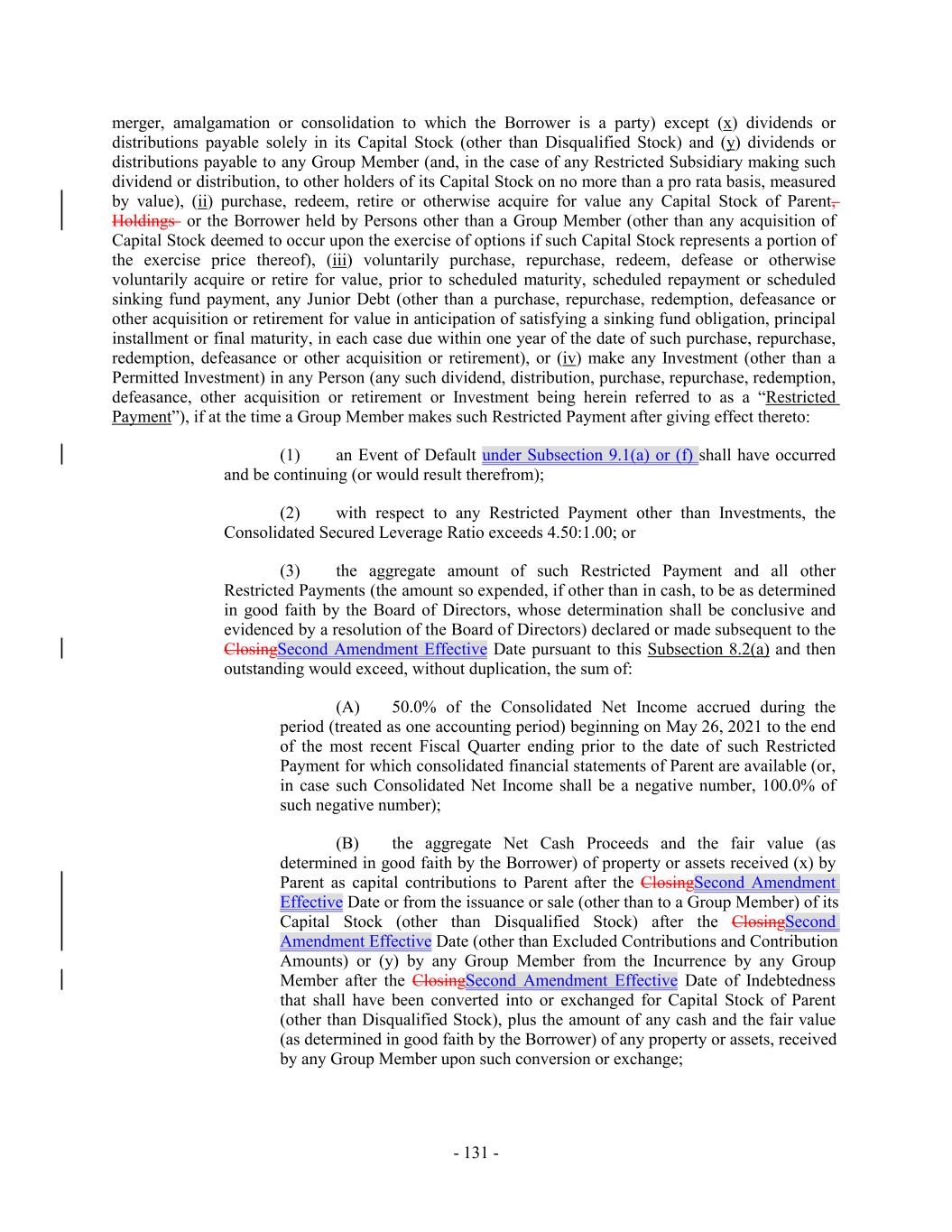 merger, amalgamation or consolidation to which the Borrower is a party) except (x) dividends or distributions payable solely in its Capital Stock (other than Disqualified Stock) and (y) dividends or distributions payable to any Group Member (and, in the case of any Restricted Subsidiary making such dividend or distribution, to other holders of its Capital Stock on no more than a pro rata basis, measured by value), (ii) purchase, redeem, retire or otherwise acquire for value any Capital Stock of Parent, Holdings or the Borrower held by Persons other than a Group Member (other than any acquisition of Capital Stock deemed to occur upon the exercise of options if such Capital Stock represents a portion of the exercise price thereof), (iii) voluntarily purchase, repurchase, redeem, defease or otherwise voluntarily acquire or retire for value, prior to scheduled maturity, scheduled repayment or scheduled sinking fund payment, any Junior Debt (other than a purchase, repurchase, redemption, defeasance or other acquisition or retirement for value in anticipation of satisfying a sinking fund obligation, principal installment or final maturity, in each case due within one year of the date of such purchase, repurchase, redemption, defeasance or other acquisition or retirement), or (iv) make any Investment (other than a Permitted Investment) in any Person (any such dividend, distribution, purchase, repurchase, redemption, defeasance, other acquisition or retirement or Investment being herein referred to as a “Restricted Payment”), if at the time a Group Member makes such Restricted Payment after giving effect thereto: (1) an Event of Default under Subsection 9.1(a) or (f) shall have occurred and be continuing (or would result therefrom); (2) with respect to any Restricted Payment other than Investments, the Consolidated Secured Leverage Ratio exceeds 4.50:1.00; or (3) the aggregate amount of such Restricted Payment and all other Restricted Payments (the amount so expended, if other than in cash, to be as determined in good faith by the Board of Directors, whose determination shall be conclusive and evidenced by a resolution of the Board of Directors) declared or made subsequent to the ClosingSecond Amendment Effective Date pursuant to this Subsection 8.2(a) and then outstanding would exceed, without duplication, the sum of: (A) 50.0% of the Consolidated Net Income accrued during the period (treated as one accounting period) beginning on May 26, 2021 to the end of the most recent Fiscal Quarter ending prior to the date of such Restricted Payment for which consolidated financial statements of Parent are available (or, in case such Consolidated Net Income shall be a negative number, 100.0% of such negative number); (B) the aggregate Net Cash Proceeds and the fair value (as determined in good faith by the Borrower) of property or assets received (x) by Parent as capital contributions to Parent after the ClosingSecond Amendment Effective Date or from the issuance or sale (other than to a Group Member) of its Capital Stock (other than Disqualified Stock) after the ClosingSecond Amendment Effective Date (other than Excluded Contributions and Contribution Amounts) or (y) by any Group Member from the Incurrence by any Group Member after the ClosingSecond Amendment Effective Date of Indebtedness that shall have been converted into or exchanged for Capital Stock of Parent (other than Disqualified Stock), plus the amount of any cash and the fair value (as determined in good faith by the Borrower) of any property or assets, received by any Group Member upon such conversion or exchange; - 131 -