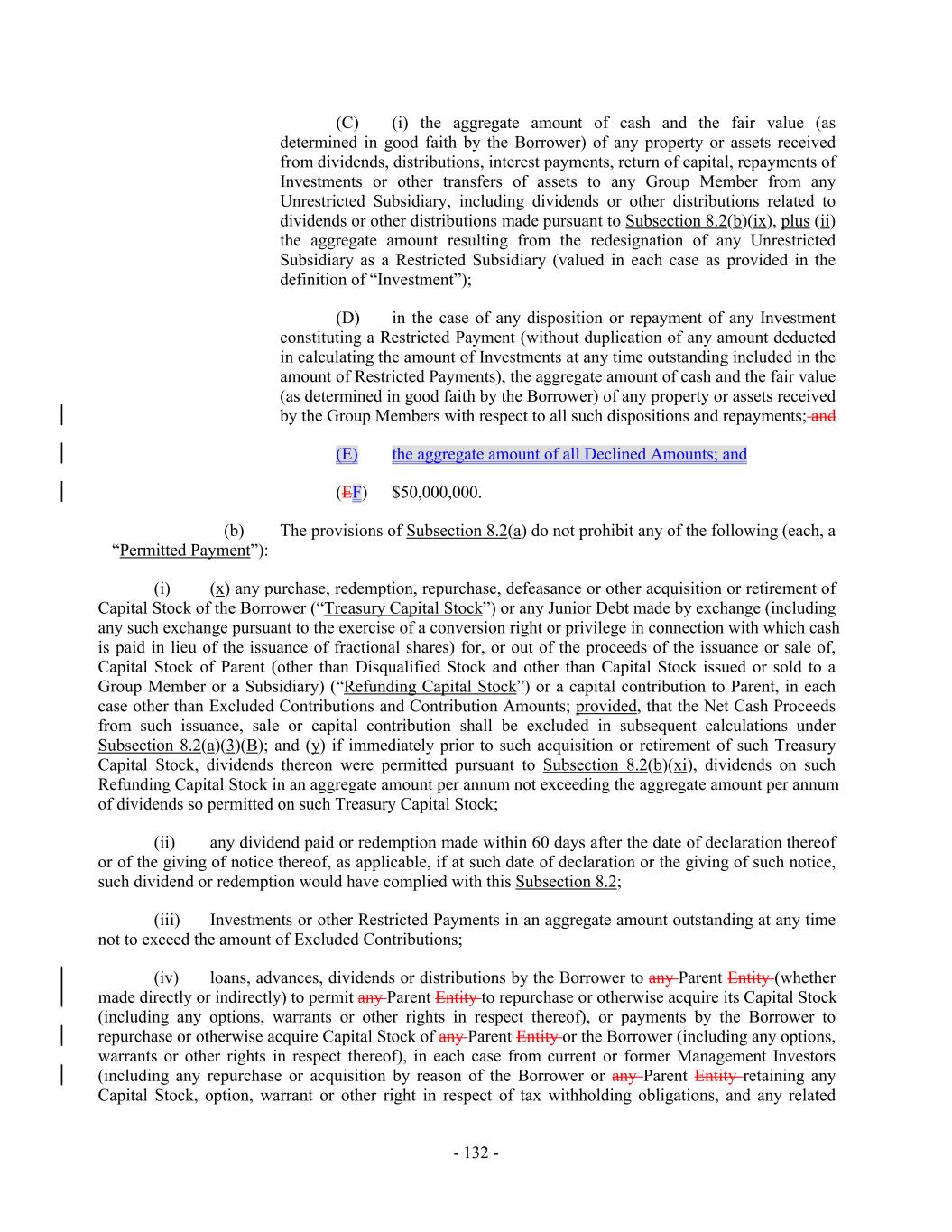 (C) (i) the aggregate amount of cash and the fair value (as determined in good faith by the Borrower) of any property or assets received from dividends, distributions, interest payments, return of capital, repayments of Investments or other transfers of assets to any Group Member from any Unrestricted Subsidiary, including dividends or other distributions related to dividends or other distributions made pursuant to Subsection 8.2(b)(ix), plus (ii) the aggregate amount resulting from the redesignation of any Unrestricted Subsidiary as a Restricted Subsidiary (valued in each case as provided in the definition of “Investment”); (D) in the case of any disposition or repayment of any Investment constituting a Restricted Payment (without duplication of any amount deducted in calculating the amount of Investments at any time outstanding included in the amount of Restricted Payments), the aggregate amount of cash and the fair value (as determined in good faith by the Borrower) of any property or assets received by the Group Members with respect to all such dispositions and repayments; and (E) the aggregate amount of all Declined Amounts; and (EF) $50,000,000. (b) The provisions of Subsection 8.2(a) do not prohibit any of the following (each, a “Permitted Payment”): (i) (x) any purchase, redemption, repurchase, defeasance or other acquisition or retirement of Capital Stock of the Borrower (“Treasury Capital Stock”) or any Junior Debt made by exchange (including any such exchange pursuant to the exercise of a conversion right or privilege in connection with which cash is paid in lieu of the issuance of fractional shares) for, or out of the proceeds of the issuance or sale of, Capital Stock of Parent (other than Disqualified Stock and other than Capital Stock issued or sold to a Group Member or a Subsidiary) (“Refunding Capital Stock”) or a capital contribution to Parent, in each case other than Excluded Contributions and Contribution Amounts; provided, that the Net Cash Proceeds from such issuance, sale or capital contribution shall be excluded in subsequent calculations under Subsection 8.2(a)(3)(B); and (y) if immediately prior to such acquisition or retirement of such Treasury Capital Stock, dividends thereon were permitted pursuant to Subsection 8.2(b)(xi), dividends on such Refunding Capital Stock in an aggregate amount per annum not exceeding the aggregate amount per annum of dividends so permitted on such Treasury Capital Stock; (ii) any dividend paid or redemption made within 60 days after the date of declaration thereof or of the giving of notice thereof, as applicable, if at such date of declaration or the giving of such notice, such dividend or redemption would have complied with this Subsection 8.2; (iii) Investments or other Restricted Payments in an aggregate amount outstanding at any time not to exceed the amount of Excluded Contributions; (iv) loans, advances, dividends or distributions by the Borrower to any Parent Entity (whether made directly or indirectly) to permit any Parent Entity to repurchase or otherwise acquire its Capital Stock (including any options, warrants or other rights in respect thereof), or payments by the Borrower to repurchase or otherwise acquire Capital Stock of any Parent Entity or the Borrower (including any options, warrants or other rights in respect thereof), in each case from current or former Management Investors (including any repurchase or acquisition by reason of the Borrower or any Parent Entity retaining any Capital Stock, option, warrant or other right in respect of tax withholding obligations, and any related - 132 -