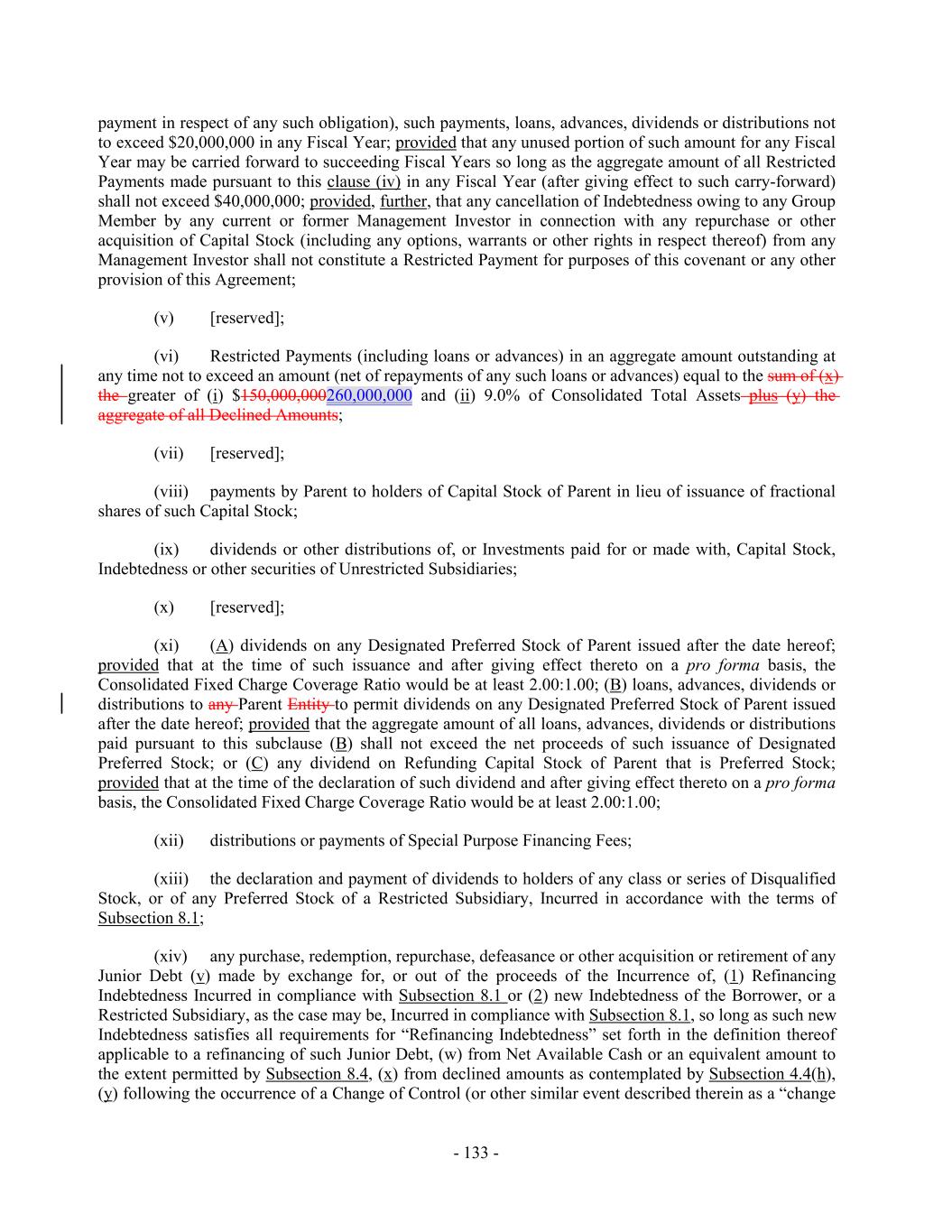 payment in respect of any such obligation), such payments, loans, advances, dividends or distributions not to exceed $20,000,000 in any Fiscal Year; provided that any unused portion of such amount for any Fiscal Year may be carried forward to succeeding Fiscal Years so long as the aggregate amount of all Restricted Payments made pursuant to this clause (iv) in any Fiscal Year (after giving effect to such carry-forward) shall not exceed $40,000,000; provided, further, that any cancellation of Indebtedness owing to any Group Member by any current or former Management Investor in connection with any repurchase or other acquisition of Capital Stock (including any options, warrants or other rights in respect thereof) from any Management Investor shall not constitute a Restricted Payment for purposes of this covenant or any other provision of this Agreement; (v) [reserved]; (vi) Restricted Payments (including loans or advances) in an aggregate amount outstanding at any time not to exceed an amount (net of repayments of any such loans or advances) equal to the sum of (x) the greater of (i) $150,000,000260,000,000 and (ii) 9.0% of Consolidated Total Assets plus (y) the aggregate of all Declined Amounts; (vii) [reserved]; (viii) payments by Parent to holders of Capital Stock of Parent in lieu of issuance of fractional shares of such Capital Stock; (ix) dividends or other distributions of, or Investments paid for or made with, Capital Stock, Indebtedness or other securities of Unrestricted Subsidiaries; (x) [reserved]; (xi) (A) dividends on any Designated Preferred Stock of Parent issued after the date hereof; provided that at the time of such issuance and after giving effect thereto on a pro forma basis, the Consolidated Fixed Charge Coverage Ratio would be at least 2.00:1.00; (B) loans, advances, dividends or distributions to any Parent Entity to permit dividends on any Designated Preferred Stock of Parent issued after the date hereof; provided that the aggregate amount of all loans, advances, dividends or distributions paid pursuant to this subclause (B) shall not exceed the net proceeds of such issuance of Designated Preferred Stock; or (C) any dividend on Refunding Capital Stock of Parent that is Preferred Stock; provided that at the time of the declaration of such dividend and after giving effect thereto on a pro forma basis, the Consolidated Fixed Charge Coverage Ratio would be at least 2.00:1.00; (xii) distributions or payments of Special Purpose Financing Fees; (xiii) the declaration and payment of dividends to holders of any class or series of Disqualified Stock, or of any Preferred Stock of a Restricted Subsidiary, Incurred in accordance with the terms of Subsection 8.1; (xiv) any purchase, redemption, repurchase, defeasance or other acquisition or retirement of any Junior Debt (v) made by exchange for, or out of the proceeds of the Incurrence of, (1) Refinancing Indebtedness Incurred in compliance with Subsection 8.1 or (2) new Indebtedness of the Borrower, or a Restricted Subsidiary, as the case may be, Incurred in compliance with Subsection 8.1, so long as such new Indebtedness satisfies all requirements for “Refinancing Indebtedness” set forth in the definition thereof applicable to a refinancing of such Junior Debt, (w) from Net Available Cash or an equivalent amount to the extent permitted by Subsection 8.4, (x) from declined amounts as contemplated by Subsection 4.4(h), (y) following the occurrence of a Change of Control (or other similar event described therein as a “change - 133 -