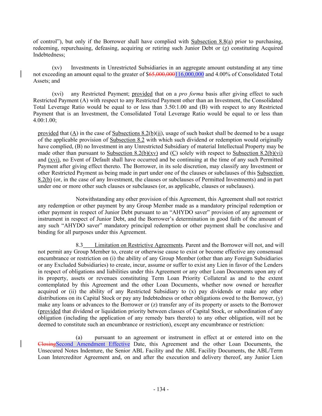 of control”), but only if the Borrower shall have complied with Subsection 8.8(a) prior to purchasing, redeeming, repurchasing, defeasing, acquiring or retiring such Junior Debt or (z) constituting Acquired Indebtedness; (xv) Investments in Unrestricted Subsidiaries in an aggregate amount outstanding at any time not exceeding an amount equal to the greater of $65,000,000116,000,000 and 4.00% of Consolidated Total Assets; and (xvi) any Restricted Payment; provided that on a pro forma basis after giving effect to such Restricted Payment (A) with respect to any Restricted Payment other than an Investment, the Consolidated Total Leverage Ratio would be equal to or less than 3.50:1.00 and (B) with respect to any Restricted Payment that is an Investment, the Consolidated Total Leverage Ratio would be equal to or less than 4.00:1.00; provided that (A) in the case of Subsections 8.2(b)(ii), usage of such basket shall be deemed to be a usage of the applicable provision of Subsection 8.2 with which such dividend or redemption would originally have complied, (B) no Investment in any Unrestricted Subsidiary of material Intellectual Property may be made other than pursuant to Subsection 8.2(b)(xv) and (C) solely with respect to Subsection 8.2(b)(vi) and (xvi), no Event of Default shall have occurred and be continuing at the time of any such Permitted Payment after giving effect thereto. The Borrower, in its sole discretion, may classify any Investment or other Restricted Payment as being made in part under one of the clauses or subclauses of this Subsection 8.2(b) (or, in the case of any Investment, the clauses or subclauses of Permitted Investments) and in part under one or more other such clauses or subclauses (or, as applicable, clauses or subclauses). Notwithstanding any other provision of this Agreement, this Agreement shall not restrict any redemption or other payment by any Group Member made as a mandatory principal redemption or other payment in respect of Junior Debt pursuant to an “AHYDO saver” provision of any agreement or instrument in respect of Junior Debt, and the Borrower’s determination in good faith of the amount of any such “AHYDO saver” mandatory principal redemption or other payment shall be conclusive and binding for all purposes under this Agreement. 8.3 Limitation on Restrictive Agreements. Parent and the Borrower will not, and will not permit any Group Member to, create or otherwise cause to exist or become effective any consensual encumbrance or restriction on (i) the ability of any Group Member (other than any Foreign Subsidiaries or any Excluded Subsidiaries) to create, incur, assume or suffer to exist any Lien in favor of the Lenders in respect of obligations and liabilities under this Agreement or any other Loan Documents upon any of its property, assets or revenues constituting Term Loan Priority Collateral as and to the extent contemplated by this Agreement and the other Loan Documents, whether now owned or hereafter acquired or (ii) the ability of any Restricted Subsidiary to (x) pay dividends or make any other distributions on its Capital Stock or pay any Indebtedness or other obligations owed to the Borrower, (y) make any loans or advances to the Borrower or (z) transfer any of its property or assets to the Borrower (provided that dividend or liquidation priority between classes of Capital Stock, or subordination of any obligation (including the application of any remedy bars thereto) to any other obligation, will not be deemed to constitute such an encumbrance or restriction), except any encumbrance or restriction: (a) pursuant to an agreement or instrument in effect at or entered into on the ClosingSecond Amendment Effective Date, this Agreement and the other Loan Documents, the Unsecured Notes Indenture, the Senior ABL Facility and the ABL Facility Documents, the ABL/Term Loan Intercreditor Agreement and, on and after the execution and delivery thereof, any Junior Lien - 134 -