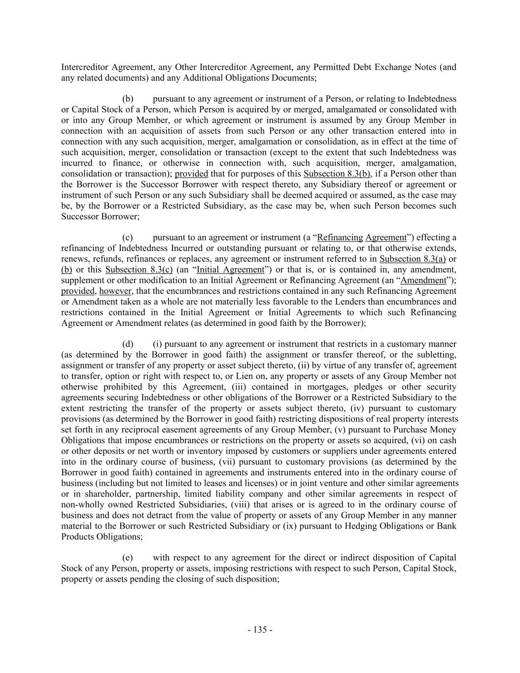 Intercreditor Agreement, any Other Intercreditor Agreement, any Permitted Debt Exchange Notes (and any related documents) and any Additional Obligations Documents; (b) pursuant to any agreement or instrument of a Person, or relating to Indebtedness or Capital Stock of a Person, which Person is acquired by or merged, amalgamated or consolidated with or into any Group Member, or which agreement or instrument is assumed by any Group Member in connection with an acquisition of assets from such Person or any other transaction entered into in connection with any such acquisition, merger, amalgamation or consolidation, as in effect at the time of such acquisition, merger, consolidation or transaction (except to the extent that such Indebtedness was incurred to finance, or otherwise in connection with, such acquisition, merger, amalgamation, consolidation or transaction); provided that for purposes of this Subsection 8.3(b), if a Person other than the Borrower is the Successor Borrower with respect thereto, any Subsidiary thereof or agreement or instrument of such Person or any such Subsidiary shall be deemed acquired or assumed, as the case may be, by the Borrower or a Restricted Subsidiary, as the case may be, when such Person becomes such Successor Borrower; (c) pursuant to an agreement or instrument (a “Refinancing Agreement”) effecting a refinancing of Indebtedness Incurred or outstanding pursuant or relating to, or that otherwise extends, renews, refunds, refinances or replaces, any agreement or instrument referred to in Subsection 8.3(a) or (b) or this Subsection 8.3(c) (an “Initial Agreement”) or that is, or is contained in, any amendment, supplement or other modification to an Initial Agreement or Refinancing Agreement (an “Amendment”); provided, however, that the encumbrances and restrictions contained in any such Refinancing Agreement or Amendment taken as a whole are not materially less favorable to the Lenders than encumbrances and restrictions contained in the Initial Agreement or Initial Agreements to which such Refinancing Agreement or Amendment relates (as determined in good faith by the Borrower); (d) (i) pursuant to any agreement or instrument that restricts in a customary manner (as determined by the Borrower in good faith) the assignment or transfer thereof, or the subletting, assignment or transfer of any property or asset subject thereto, (ii) by virtue of any transfer of, agreement to transfer, option or right with respect to, or Lien on, any property or assets of any Group Member not otherwise prohibited by this Agreement, (iii) contained in mortgages, pledges or other security agreements securing Indebtedness or other obligations of the Borrower or a Restricted Subsidiary to the extent restricting the transfer of the property or assets subject thereto, (iv) pursuant to customary provisions (as determined by the Borrower in good faith) restricting dispositions of real property interests set forth in any reciprocal easement agreements of any Group Member, (v) pursuant to Purchase Money Obligations that impose encumbrances or restrictions on the property or assets so acquired, (vi) on cash or other deposits or net worth or inventory imposed by customers or suppliers under agreements entered into in the ordinary course of business, (vii) pursuant to customary provisions (as determined by the Borrower in good faith) contained in agreements and instruments entered into in the ordinary course of business (including but not limited to leases and licenses) or in joint venture and other similar agreements or in shareholder, partnership, limited liability company and other similar agreements in respect of non-wholly owned Restricted Subsidiaries, (viii) that arises or is agreed to in the ordinary course of business and does not detract from the value of property or assets of any Group Member in any manner material to the Borrower or such Restricted Subsidiary or (ix) pursuant to Hedging Obligations or Bank Products Obligations; (e) with respect to any agreement for the direct or indirect disposition of Capital Stock of any Person, property or assets, imposing restrictions with respect to such Person, Capital Stock, property or assets pending the closing of such disposition; - 135 -